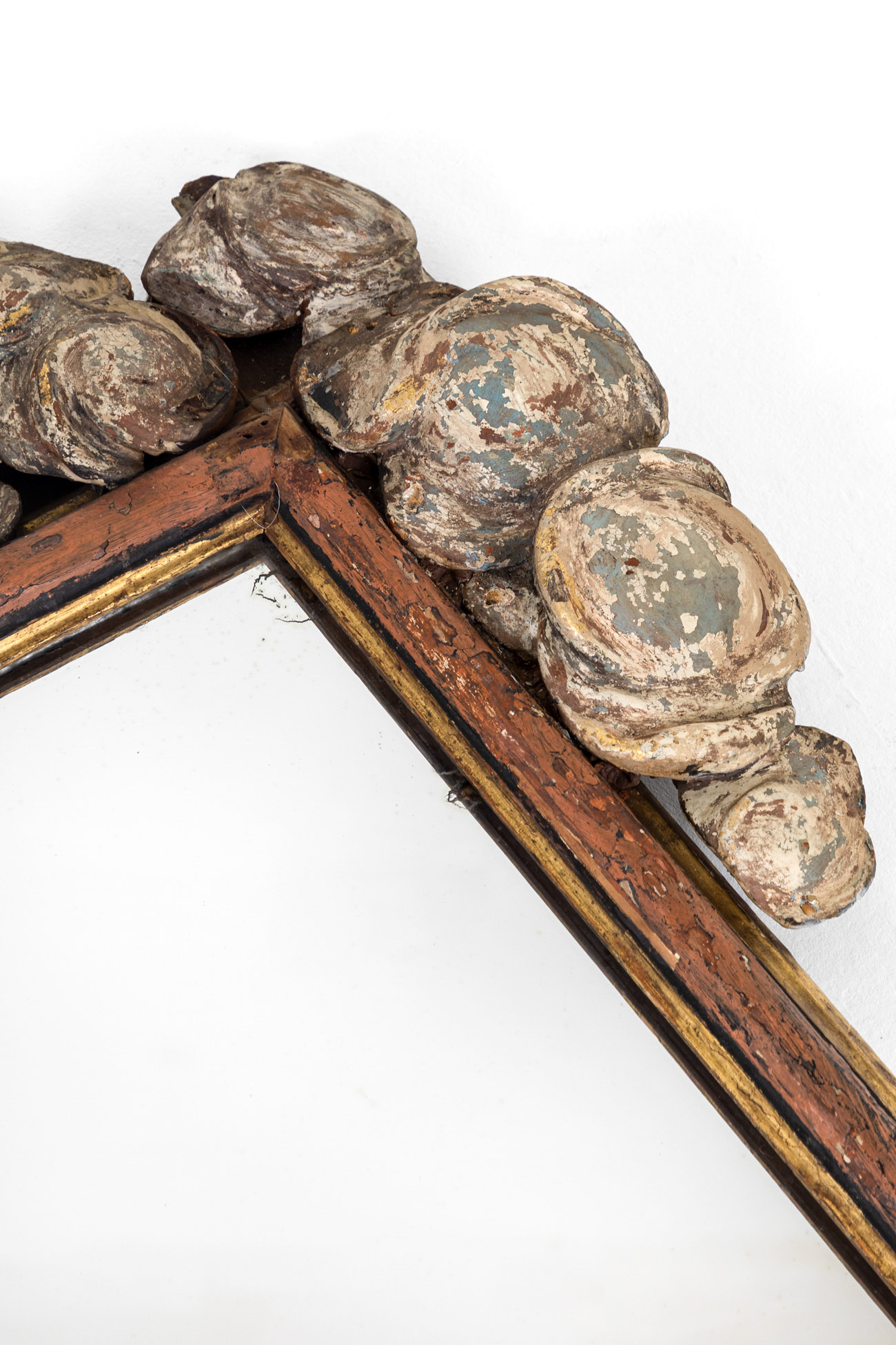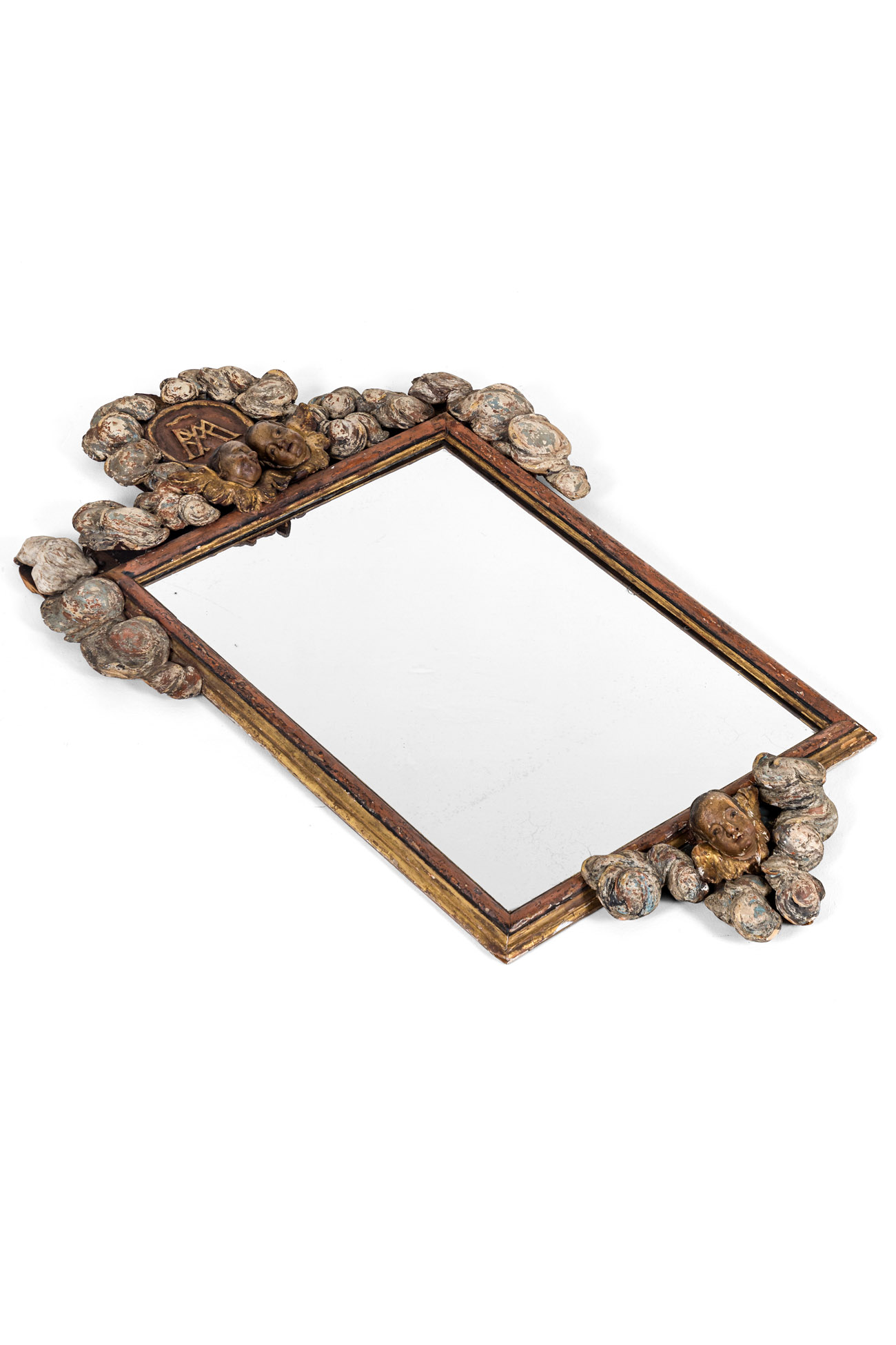 The top and sides of the mirror are surround by a collection of shells, possibly oysters and blooming roses that surround a circular altar plaque to the centre.