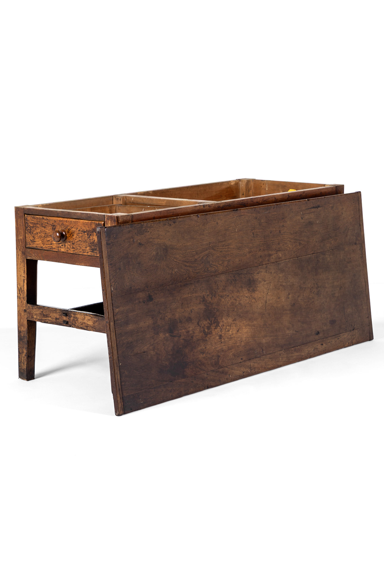 The gently oversailing top is made of two uneven planks of poplar with cleated ends accompanied an unusual narrow plank section along one side of the table top.