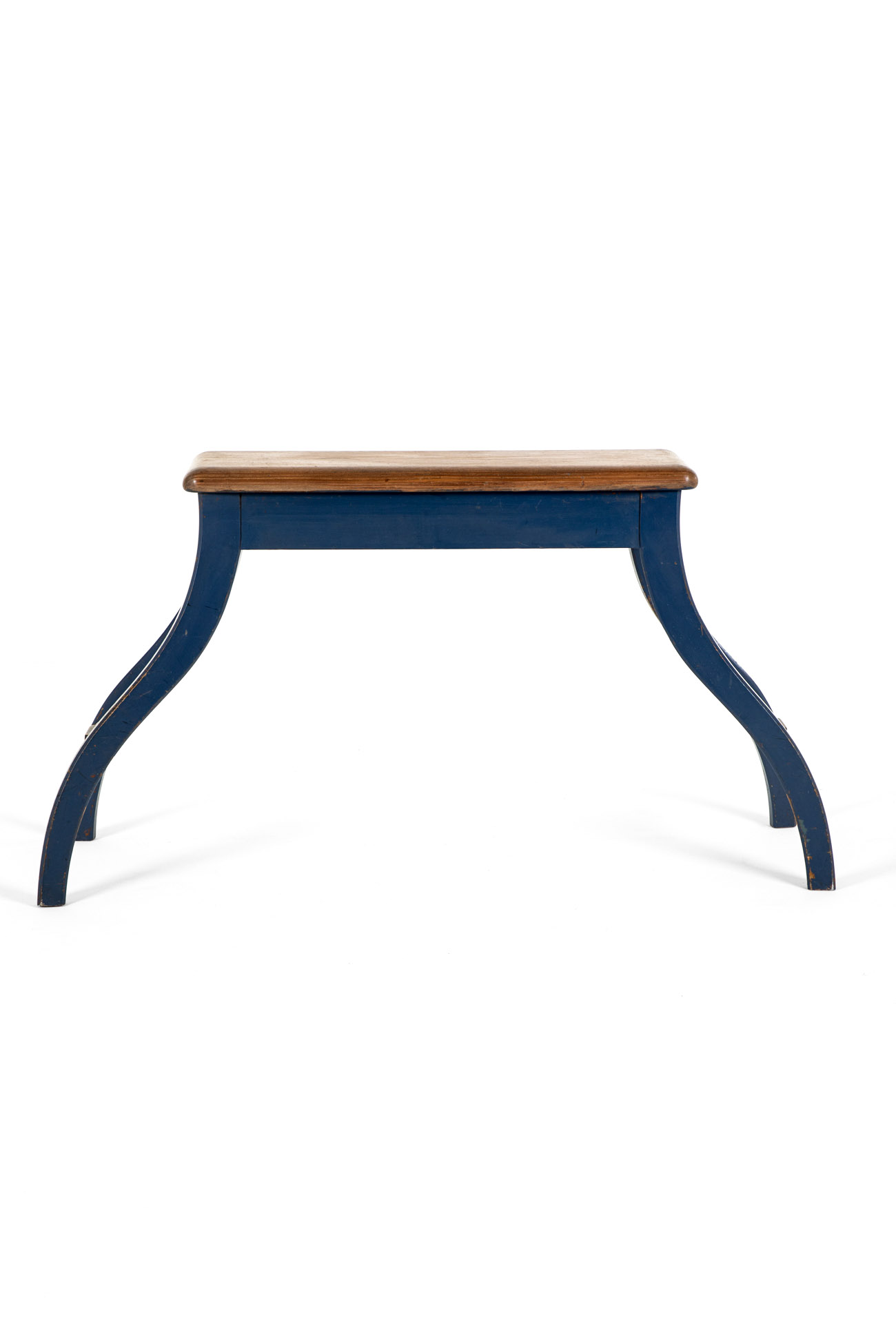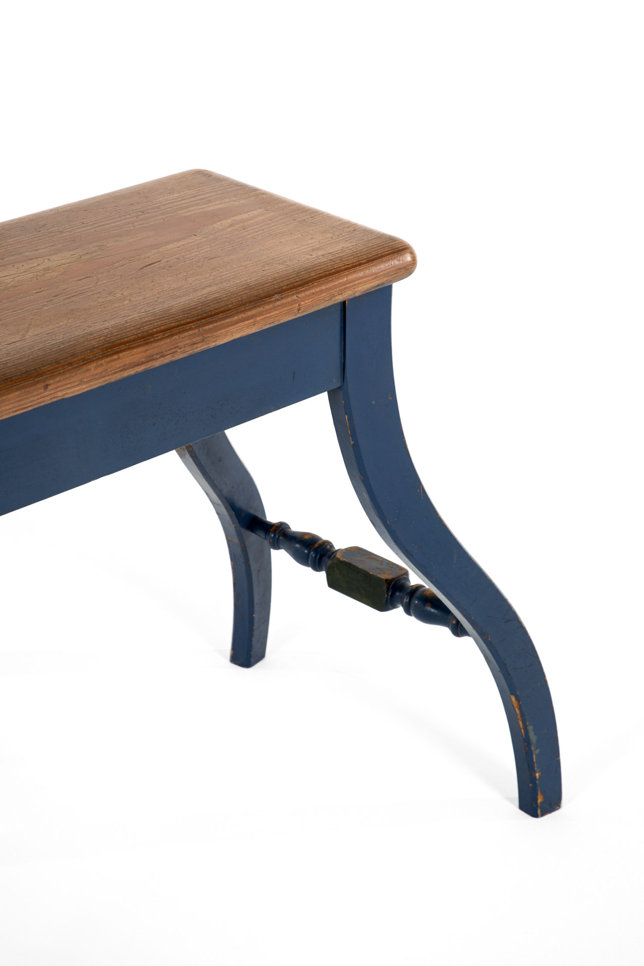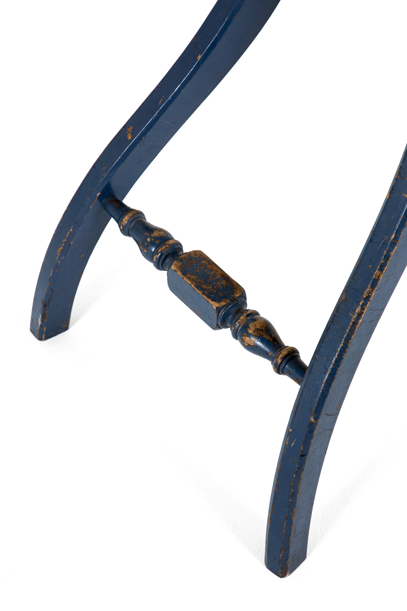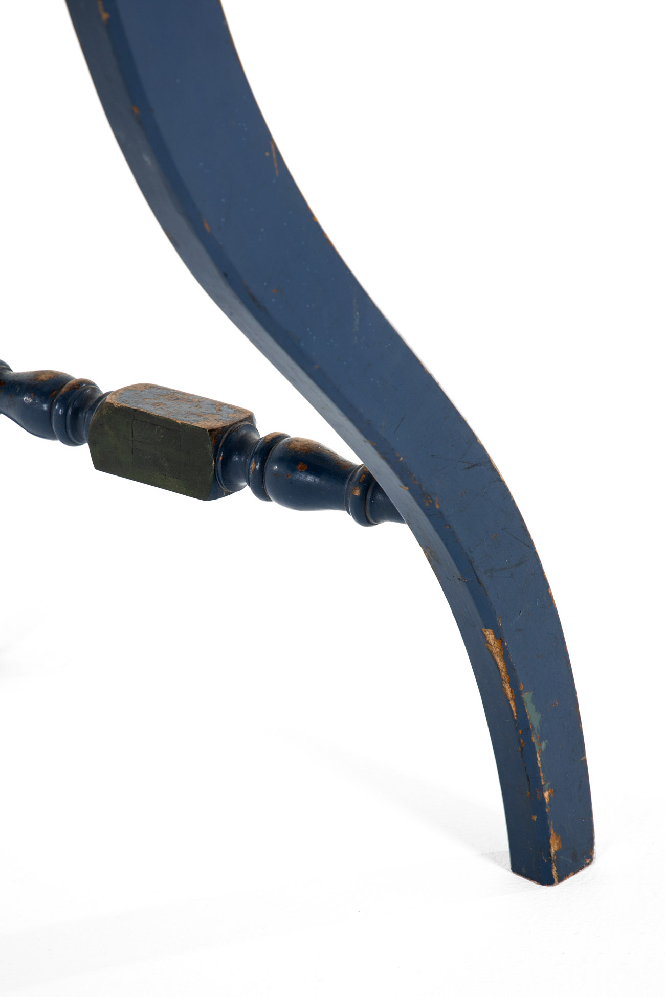 The base is made of a curvy pair of out swept legs united by turned stretchers in the original blue paint.