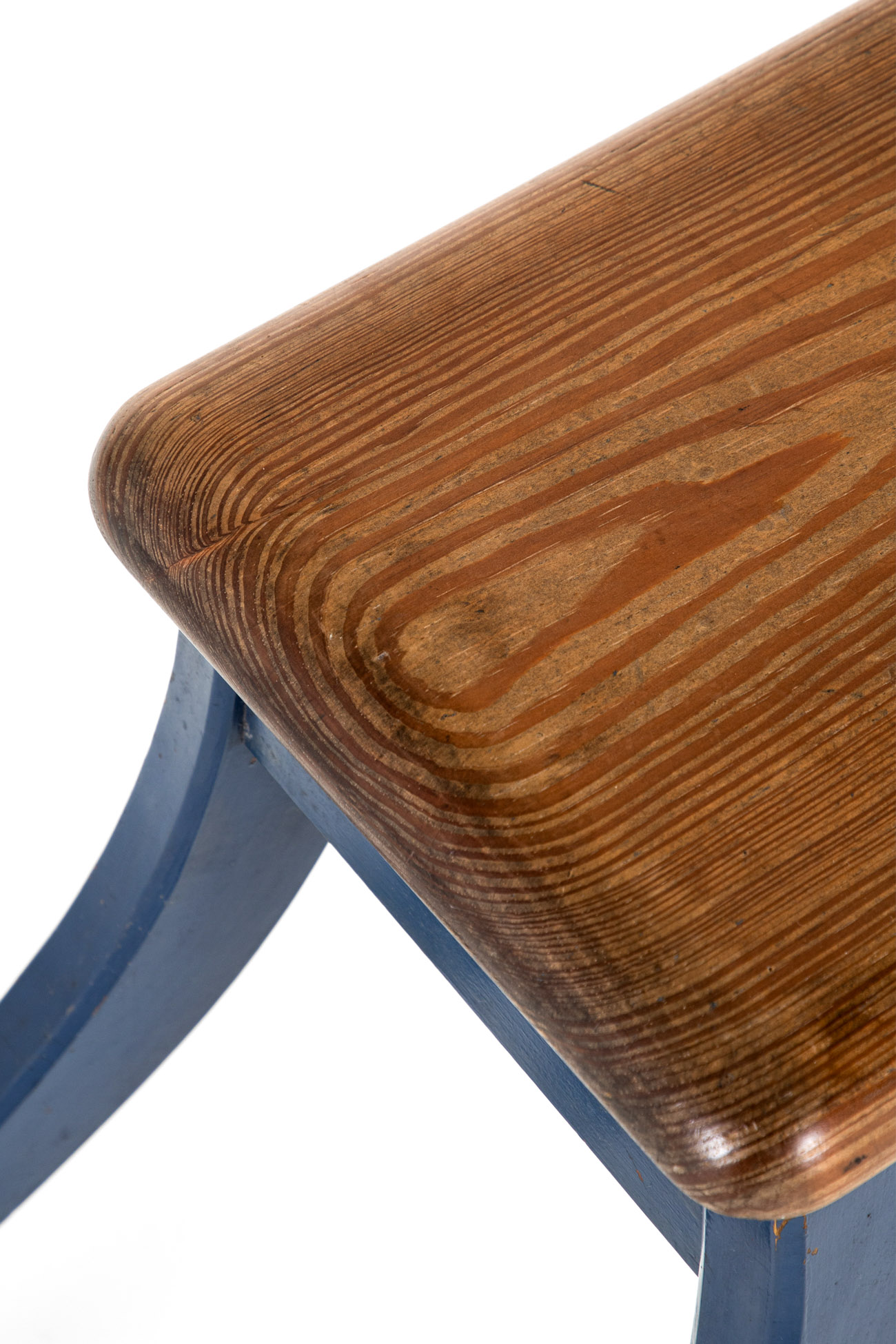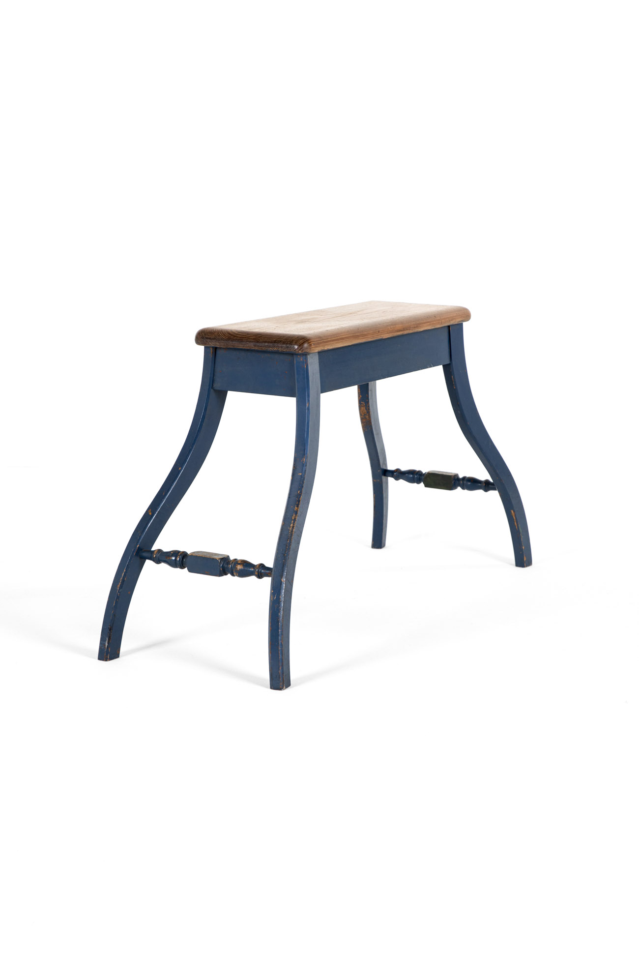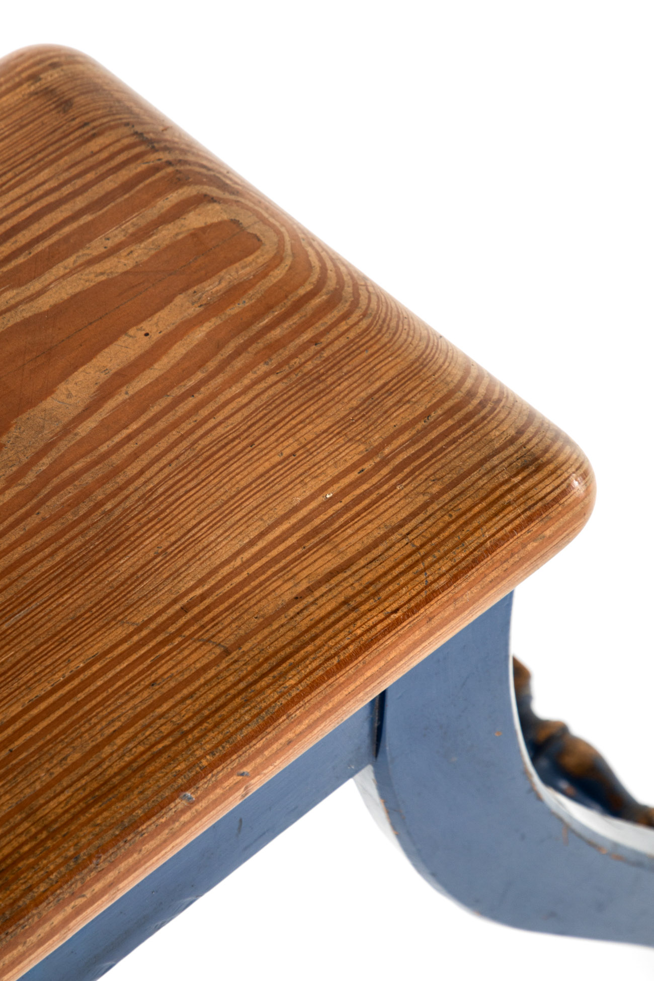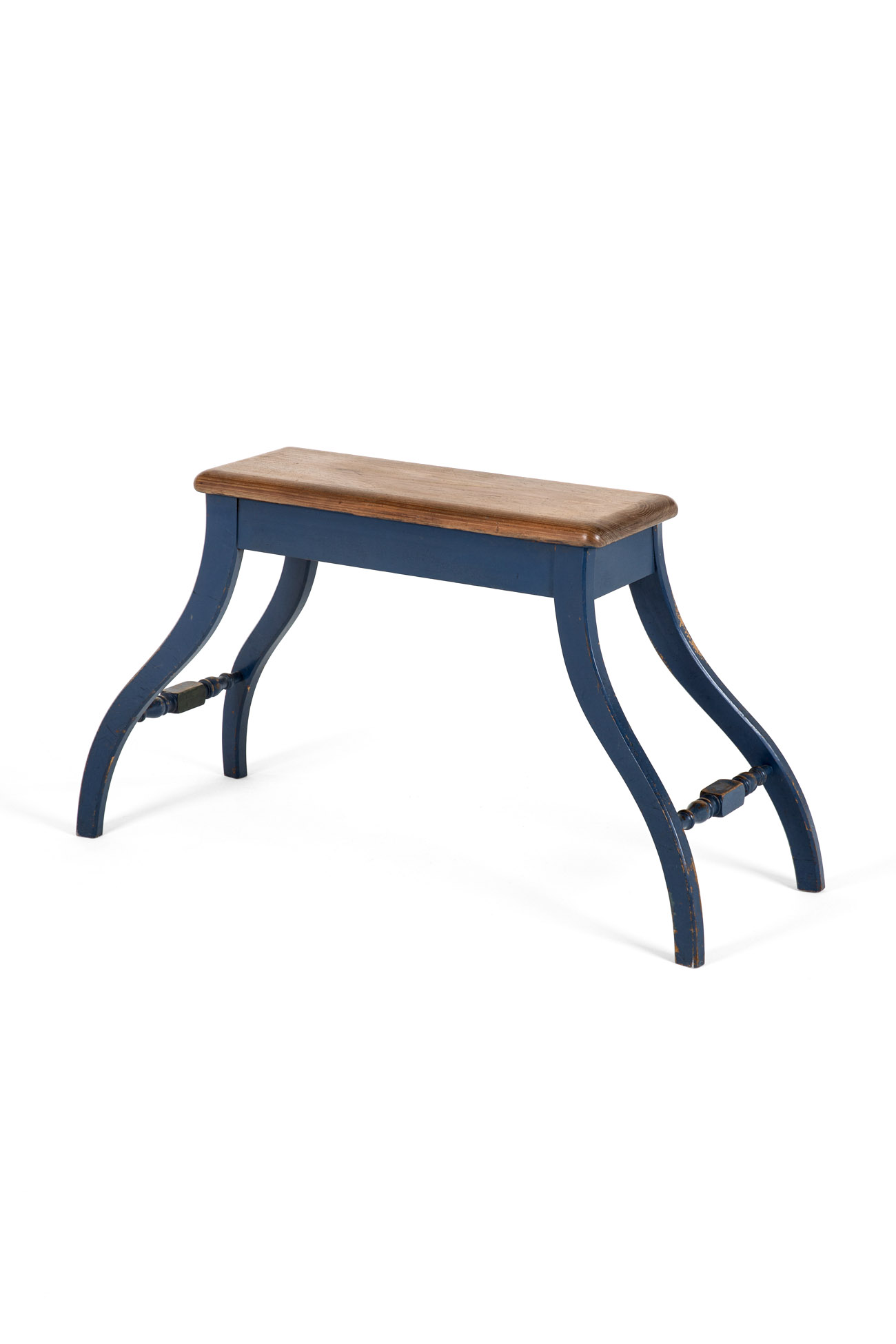 The base is made of a curvy pair of out swept legs united by turned stretchers in the original blue paint.