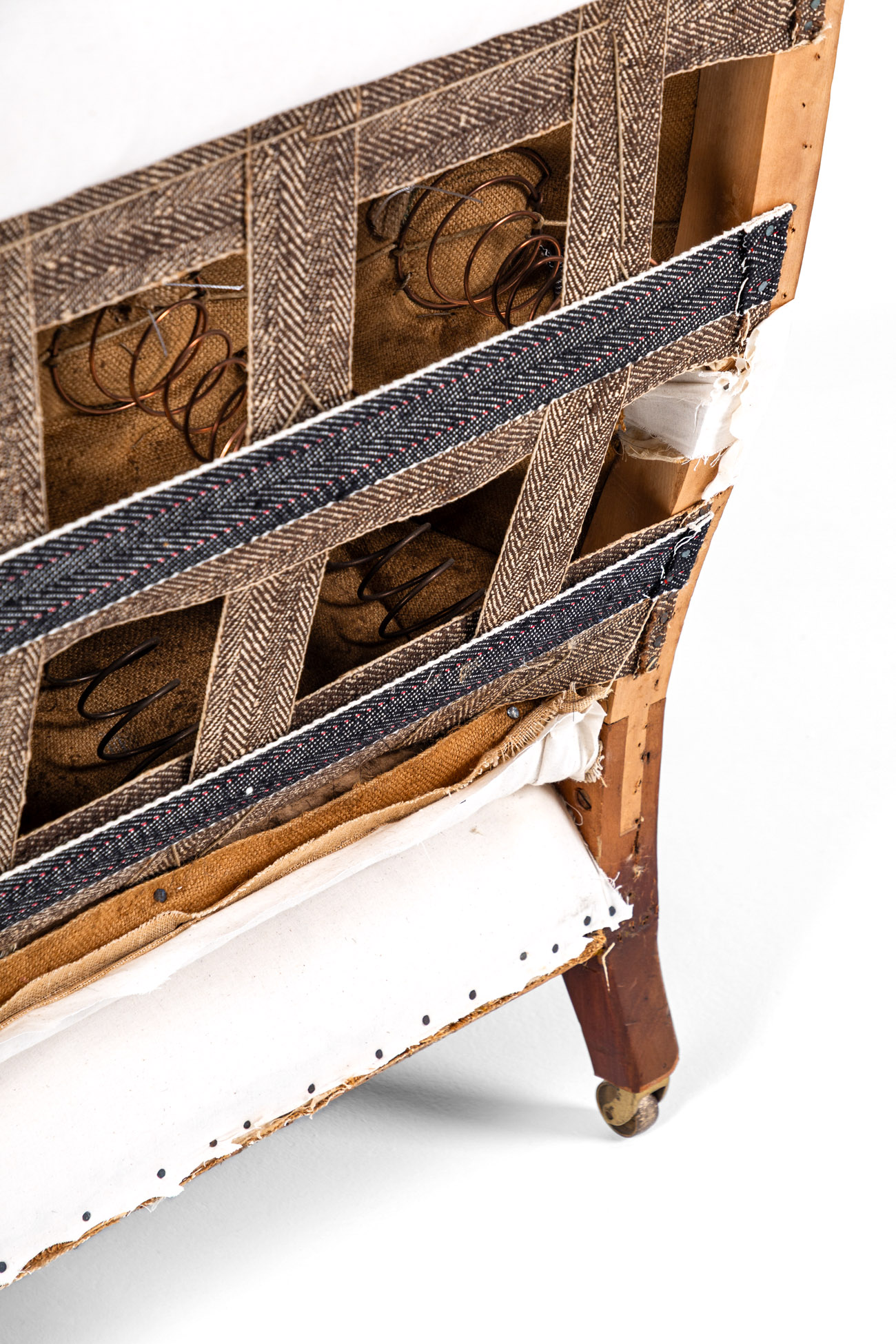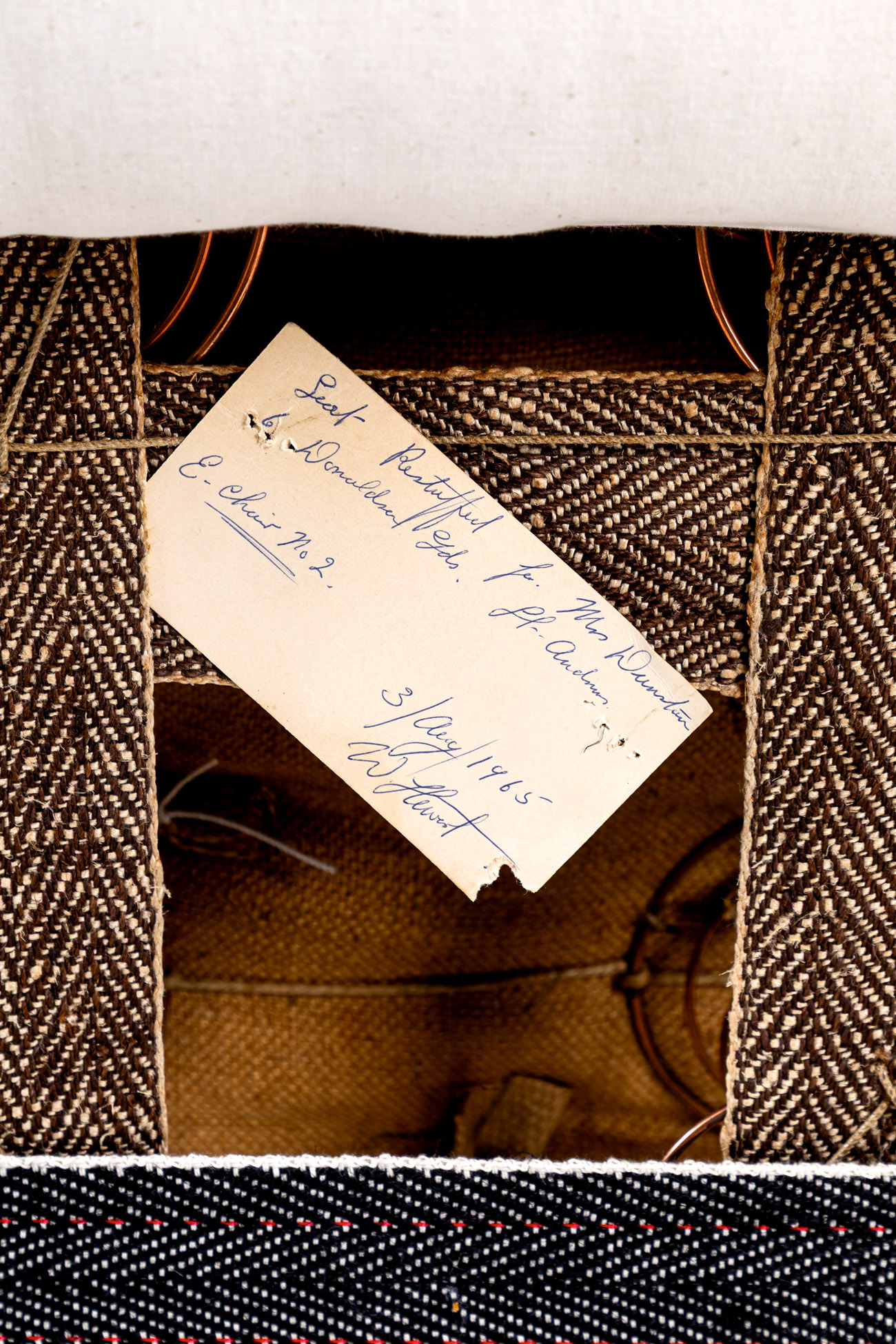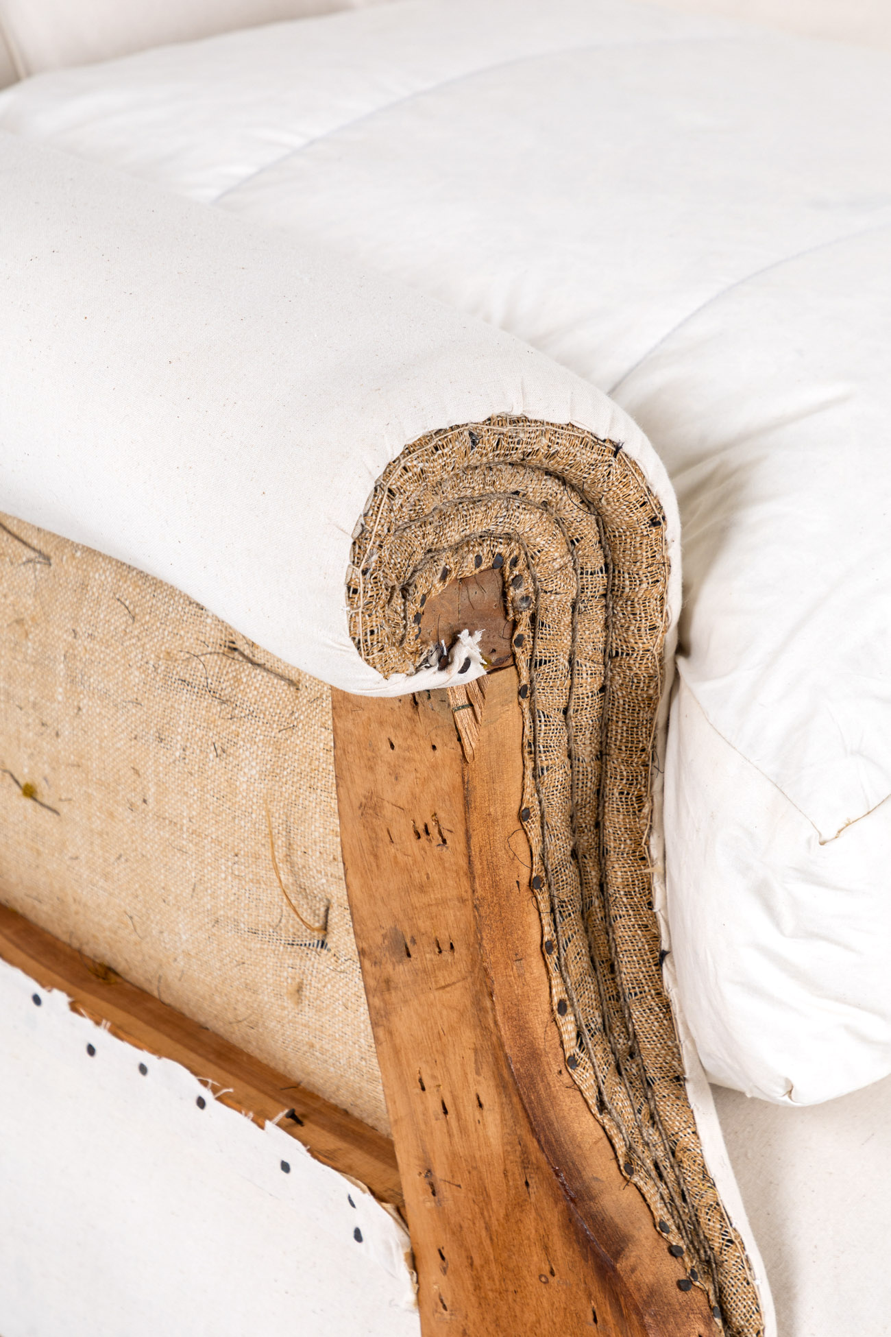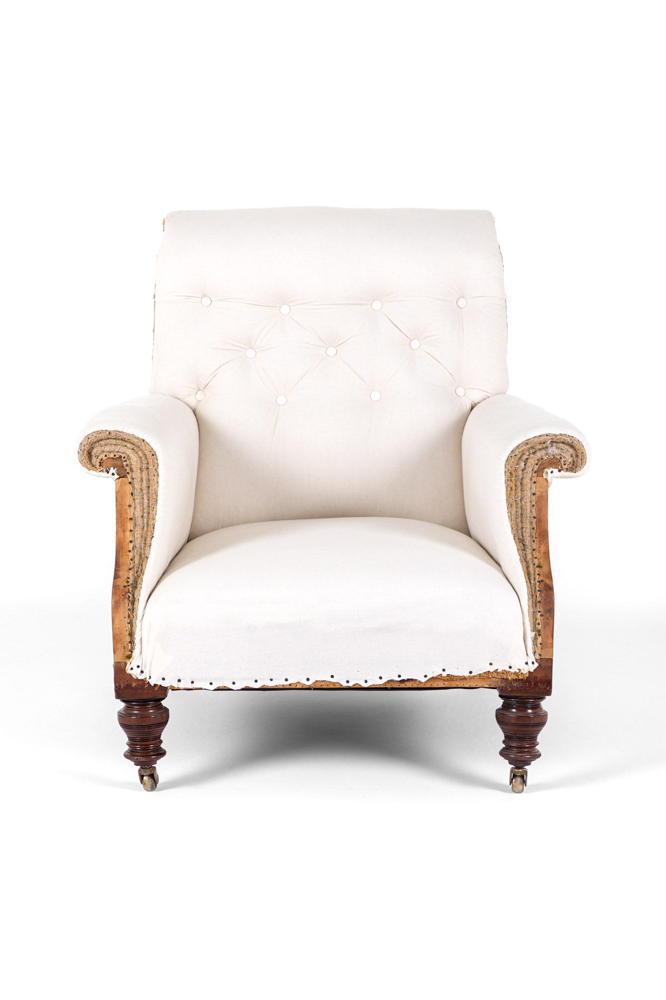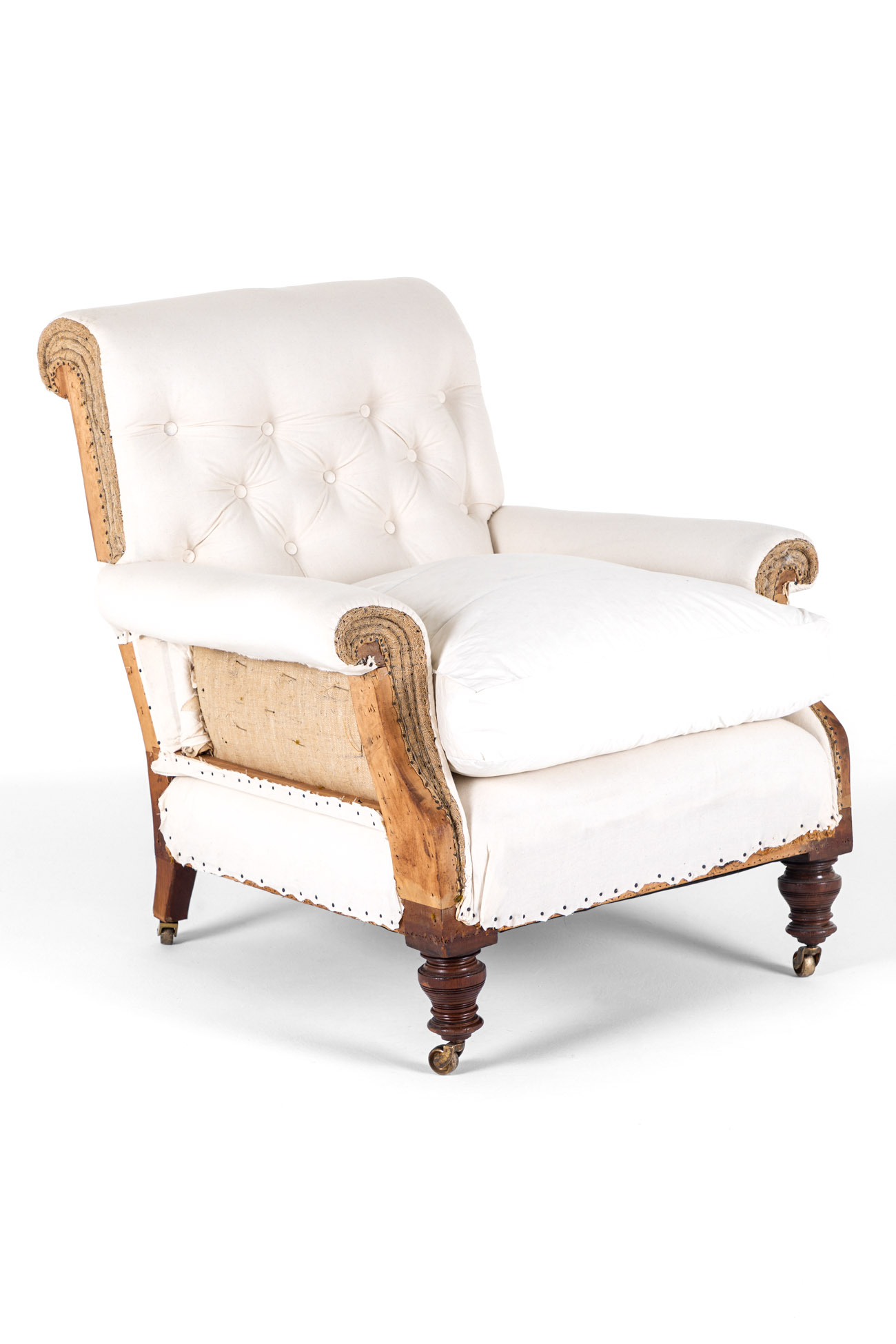 The armchair has been fully restored and stripped back to the solid mahogany frame for upholstery with a refurbished coil spring base, with hessian lining and calico coverings added and complemented with a duck feather seat cushion.