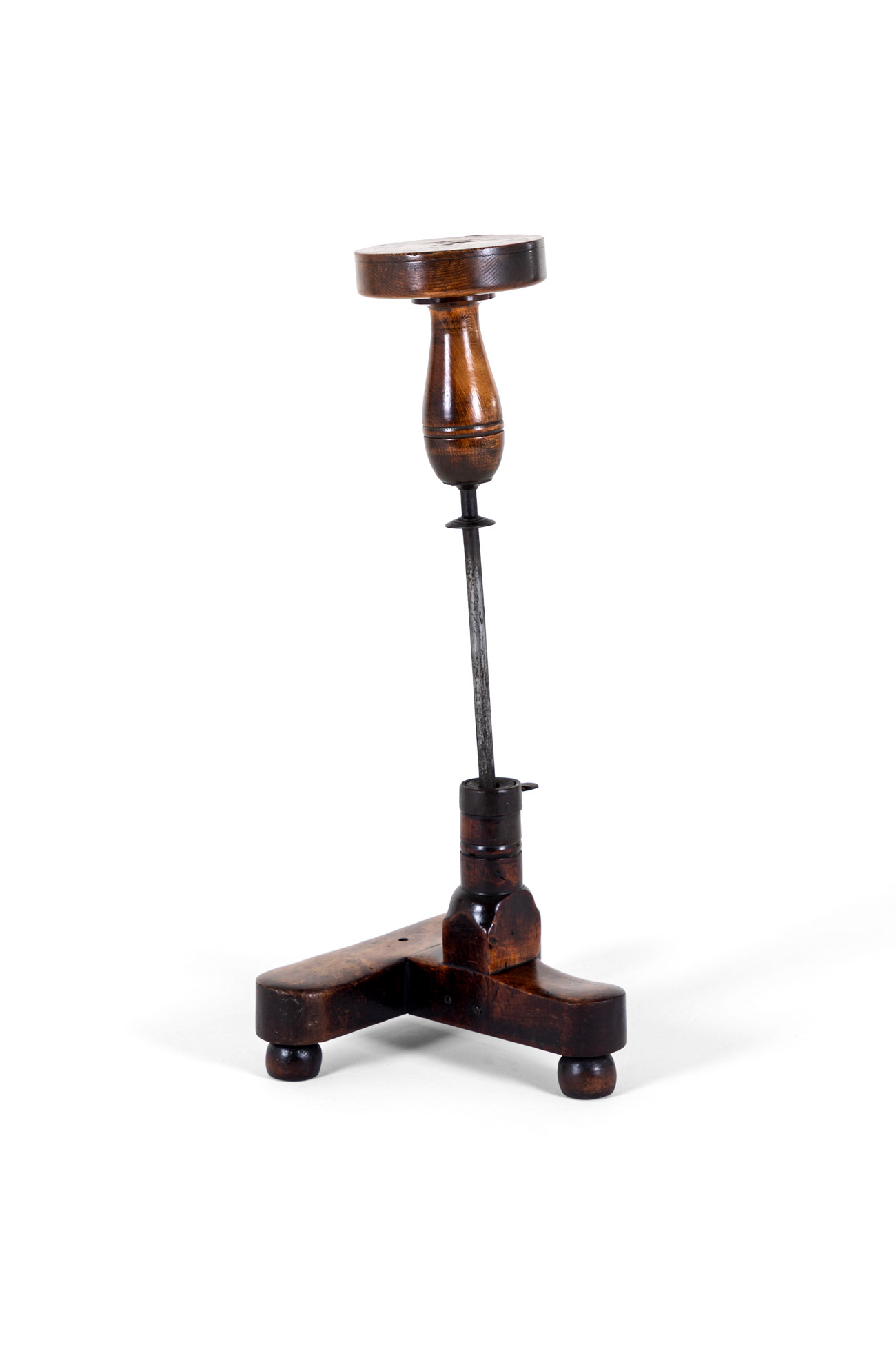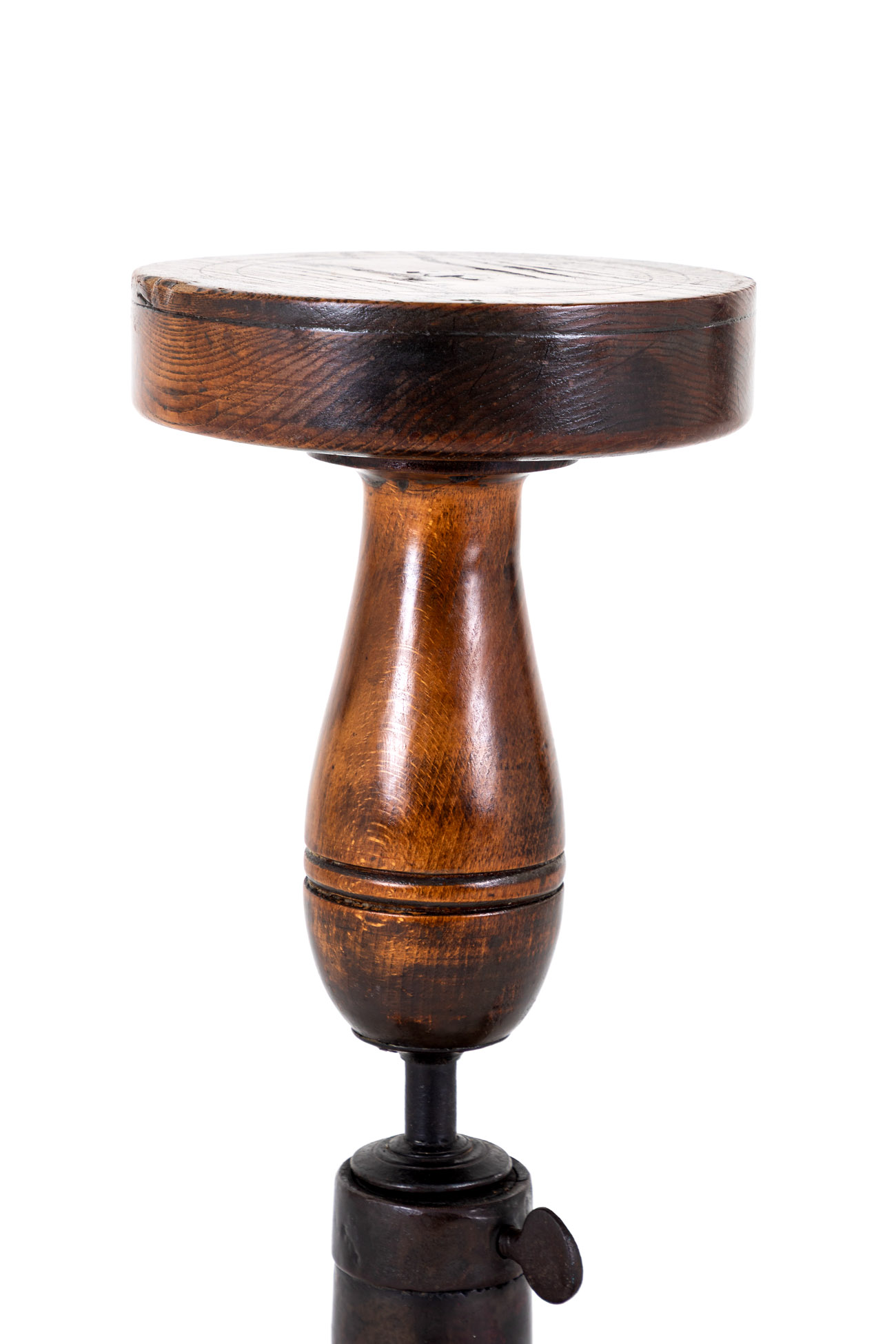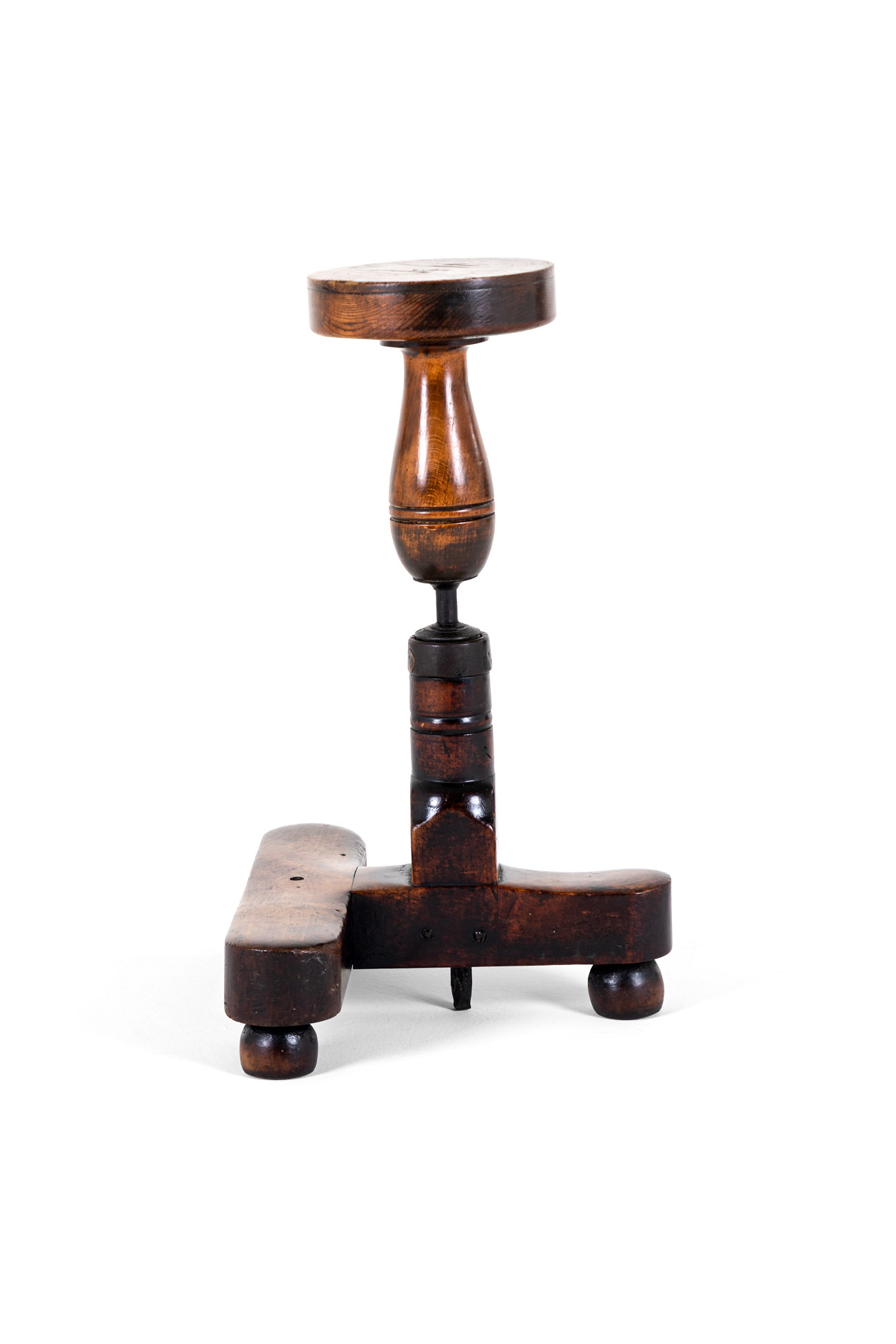 The thick top is made from a single piece of elm with a turned base with fine line detailing. The top has an iron mechanism that allows the wheel to turn 360 degrees.