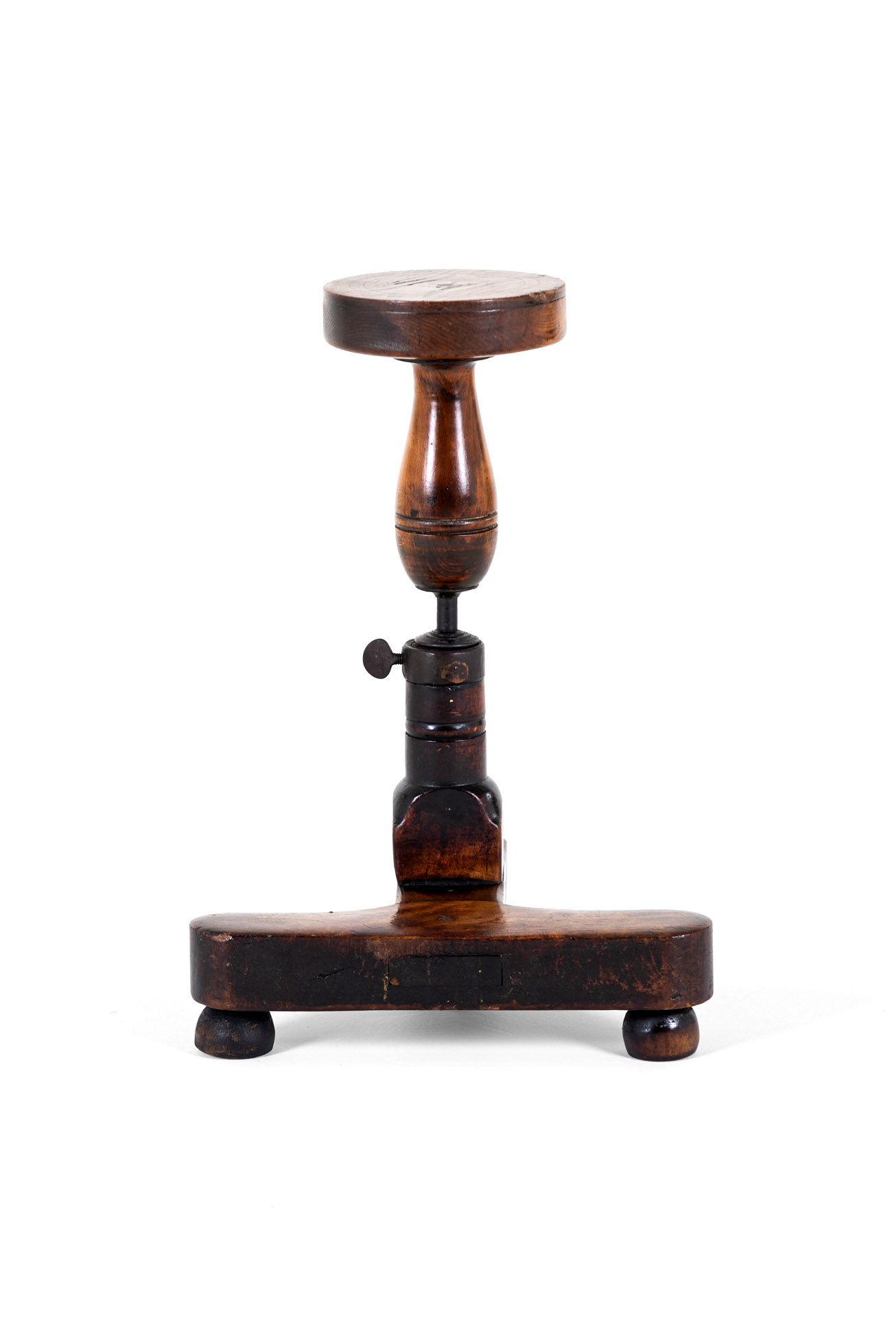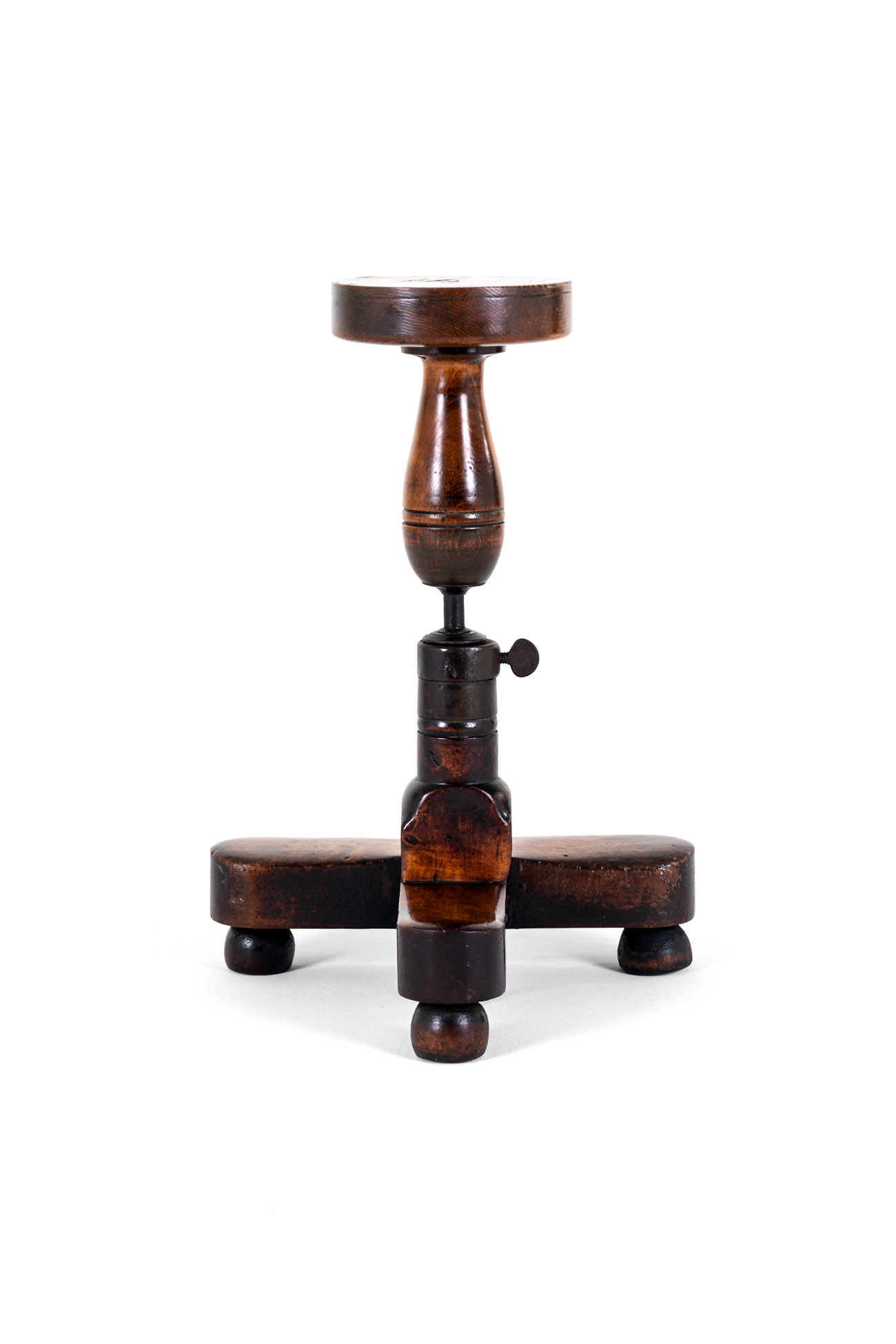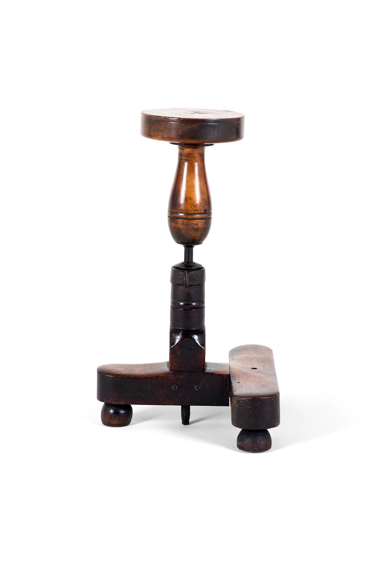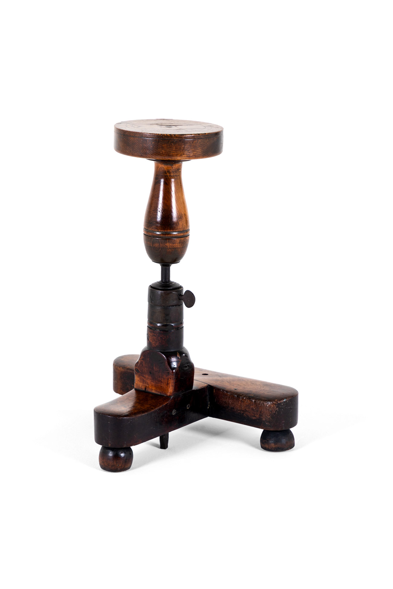 The thick top is made from a single piece of elm with a turned base with fine line detailing. The top has an iron mechanism that allows the wheel to turn 360 degrees.
