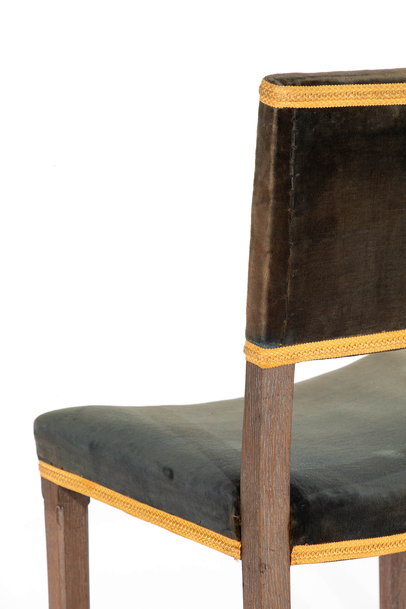 The chairs for the coronation of King George VI were made of limed oak and were upholstered in a green velvet or velour material.