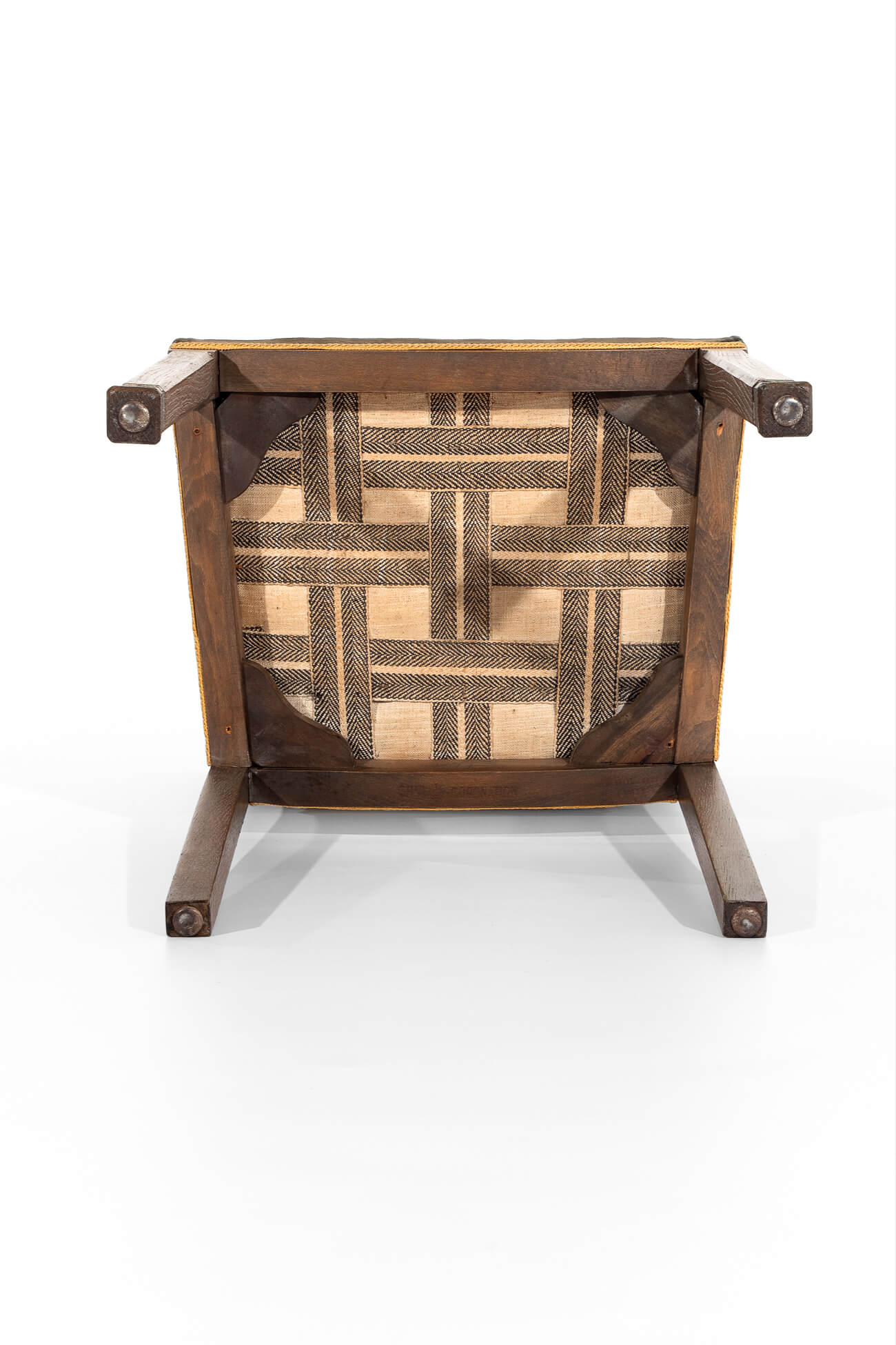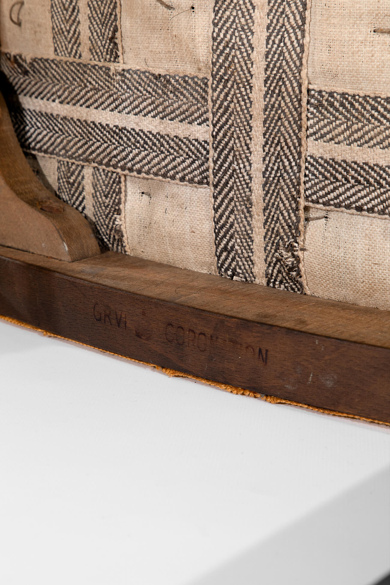 The chair has been hand-numbered with the initials ‘DG’ and the digit ’17’ which is a very low number for the coronation so this pair would almost have certainly been in the first rows of seats within Westminster Abbey. Both the chair and stool are stamped with the ‘GRVI CORONATION’ on the underside and both retain the original webbing used by the makers B. North & Sons, West Wycombe. The stool with original metal slot brackets underneath.