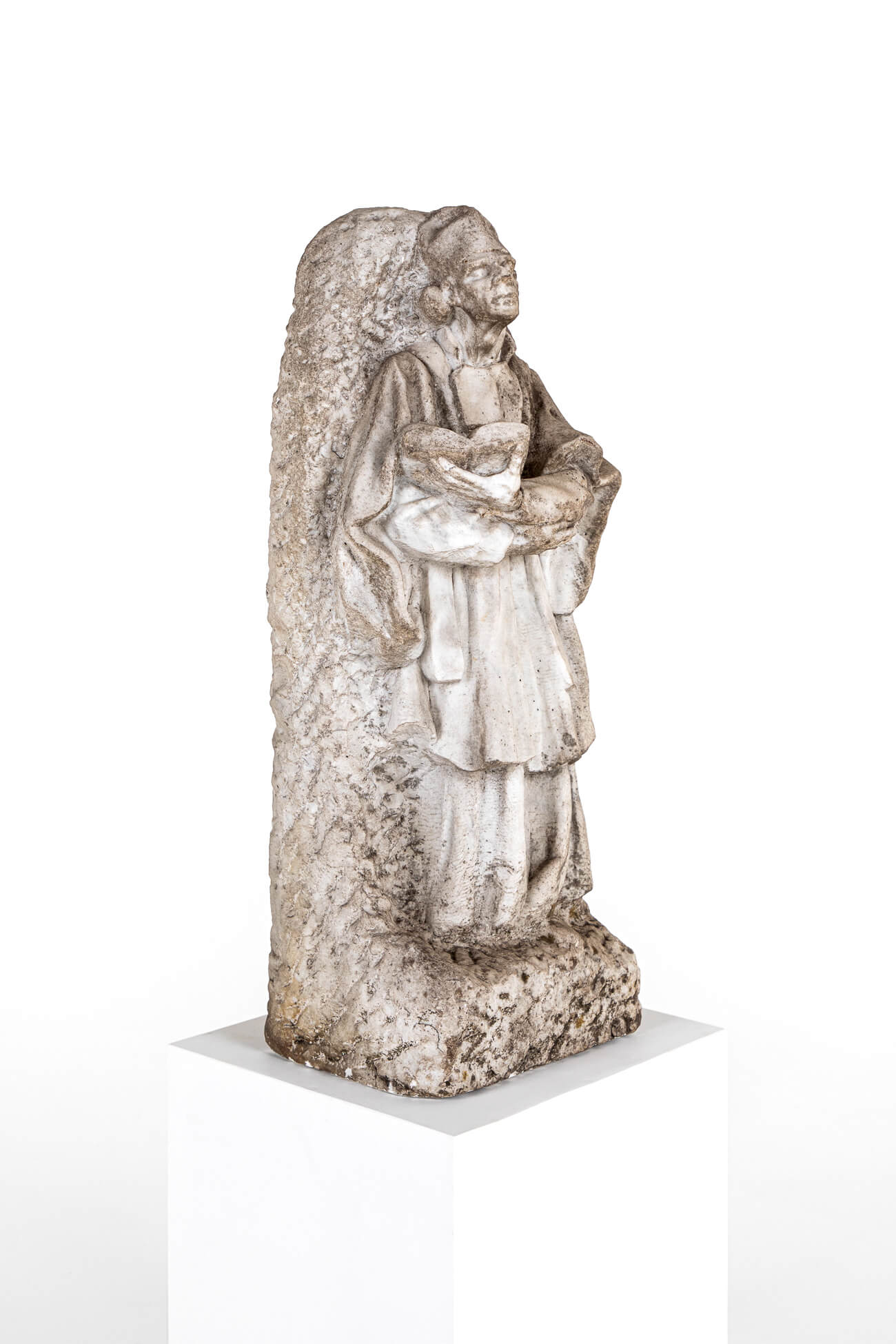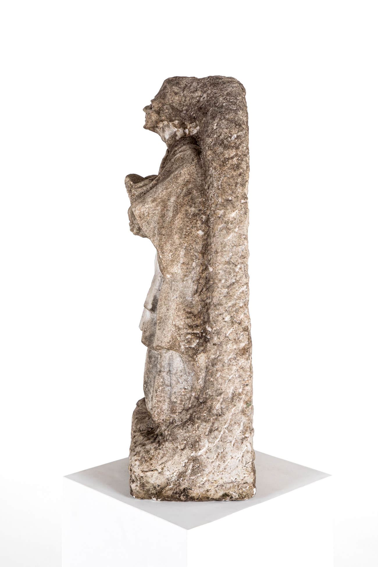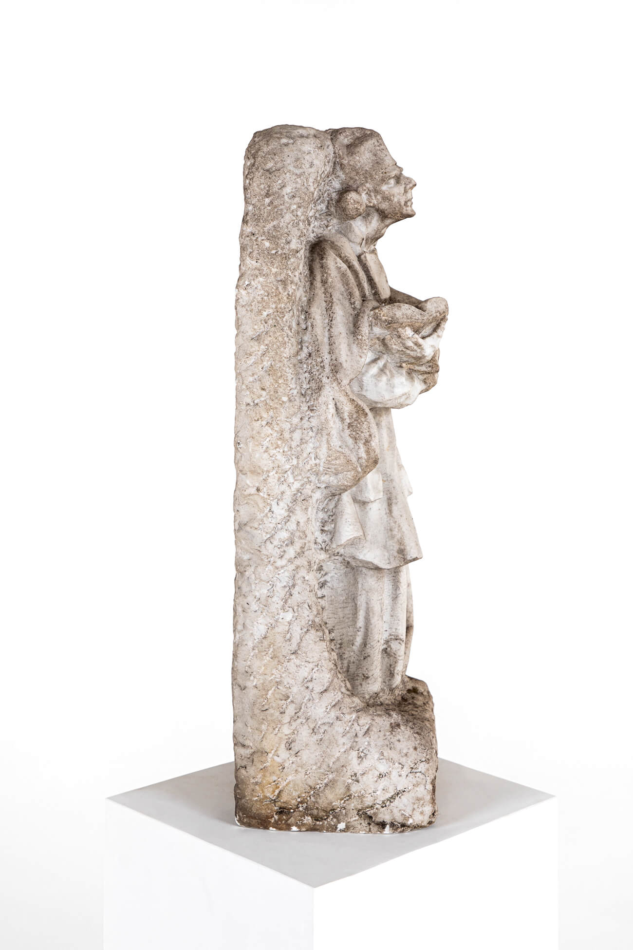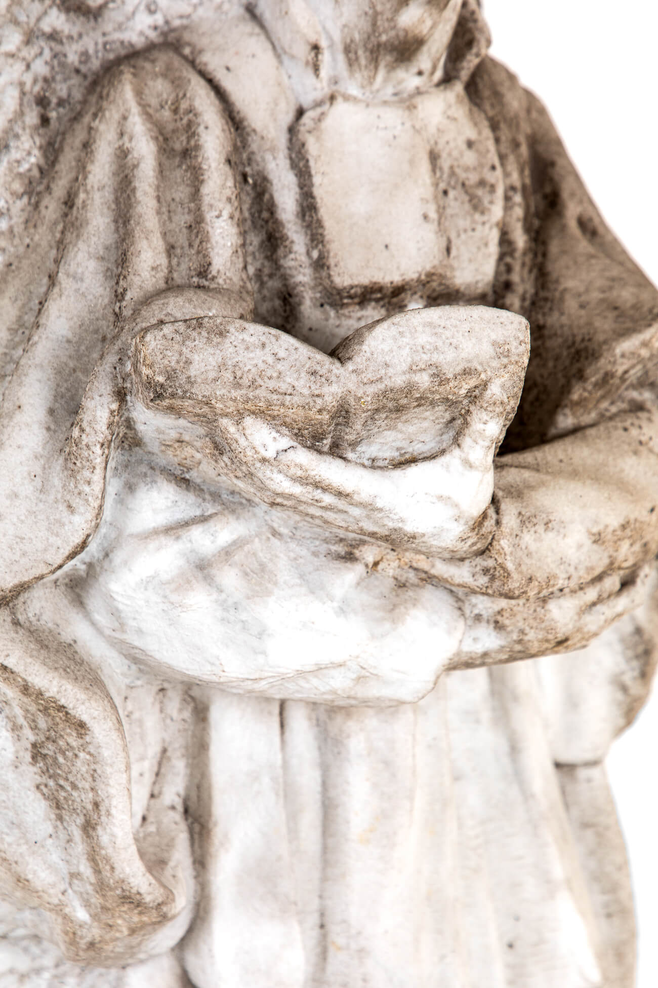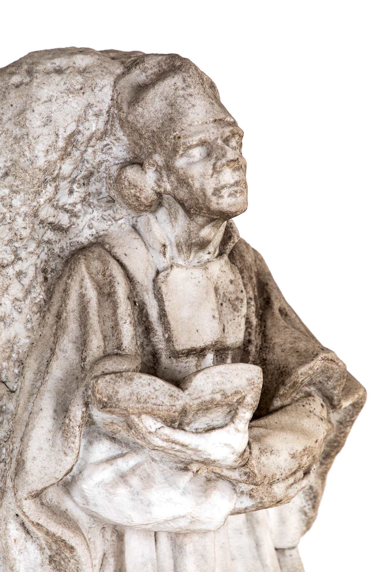 An imposing carved statue of a saint or ecclesiastical figure hewn from a single piece of white marble.