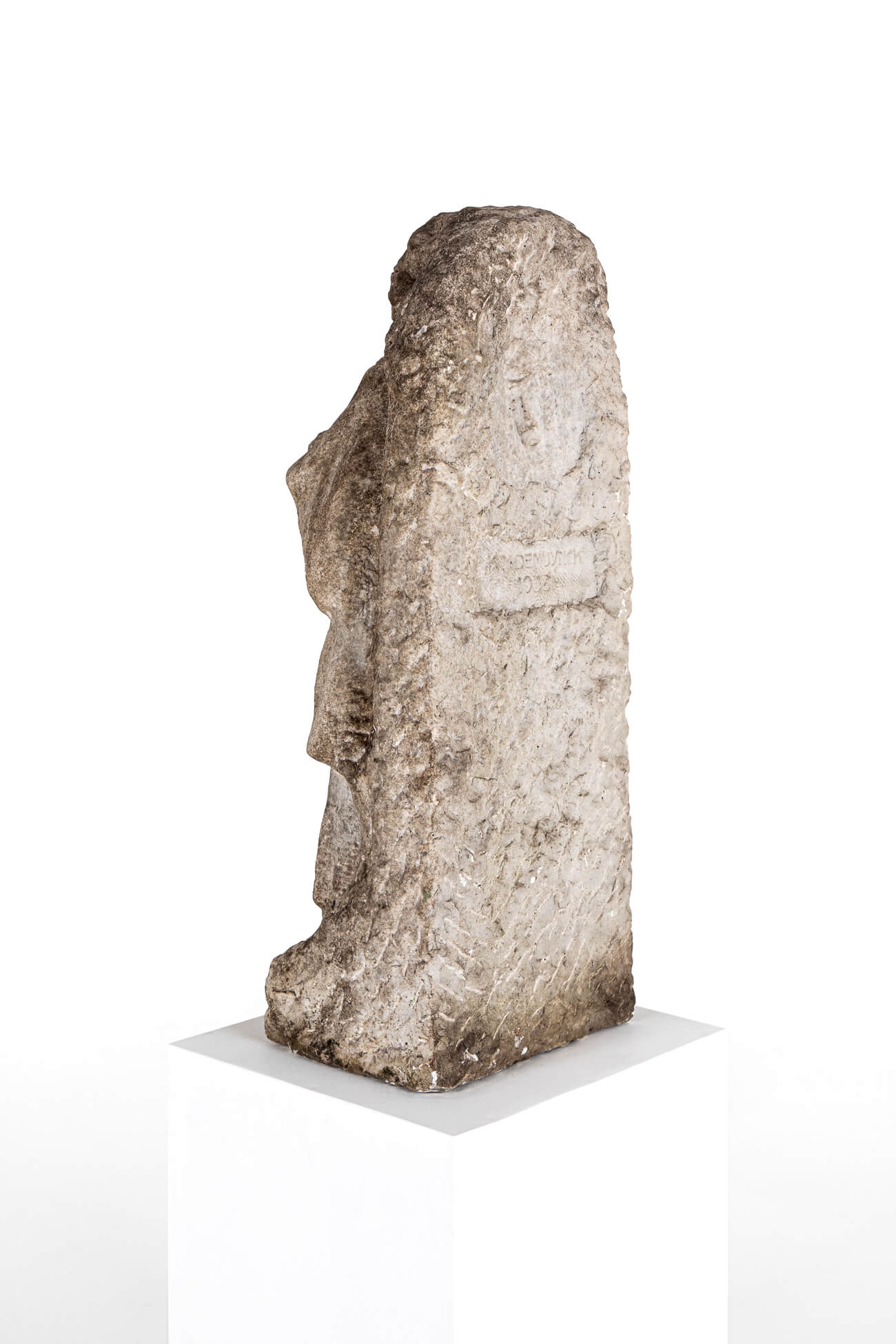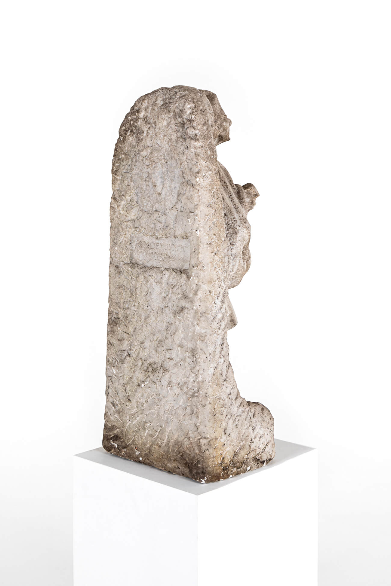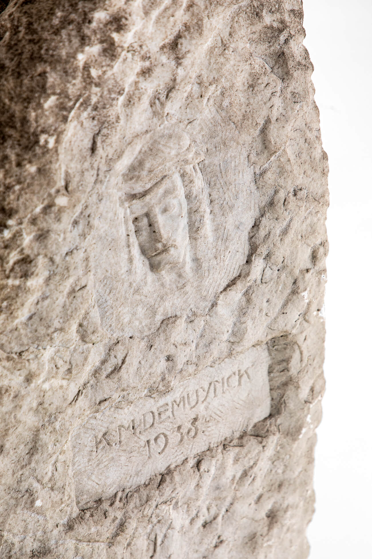 The figure is signed and dated to the rear with the name K.M.Demuynck and dated 1938. A finely carved figure depicting a head with a crown of thorns that almost certainly represents Christ features above the inscription.
