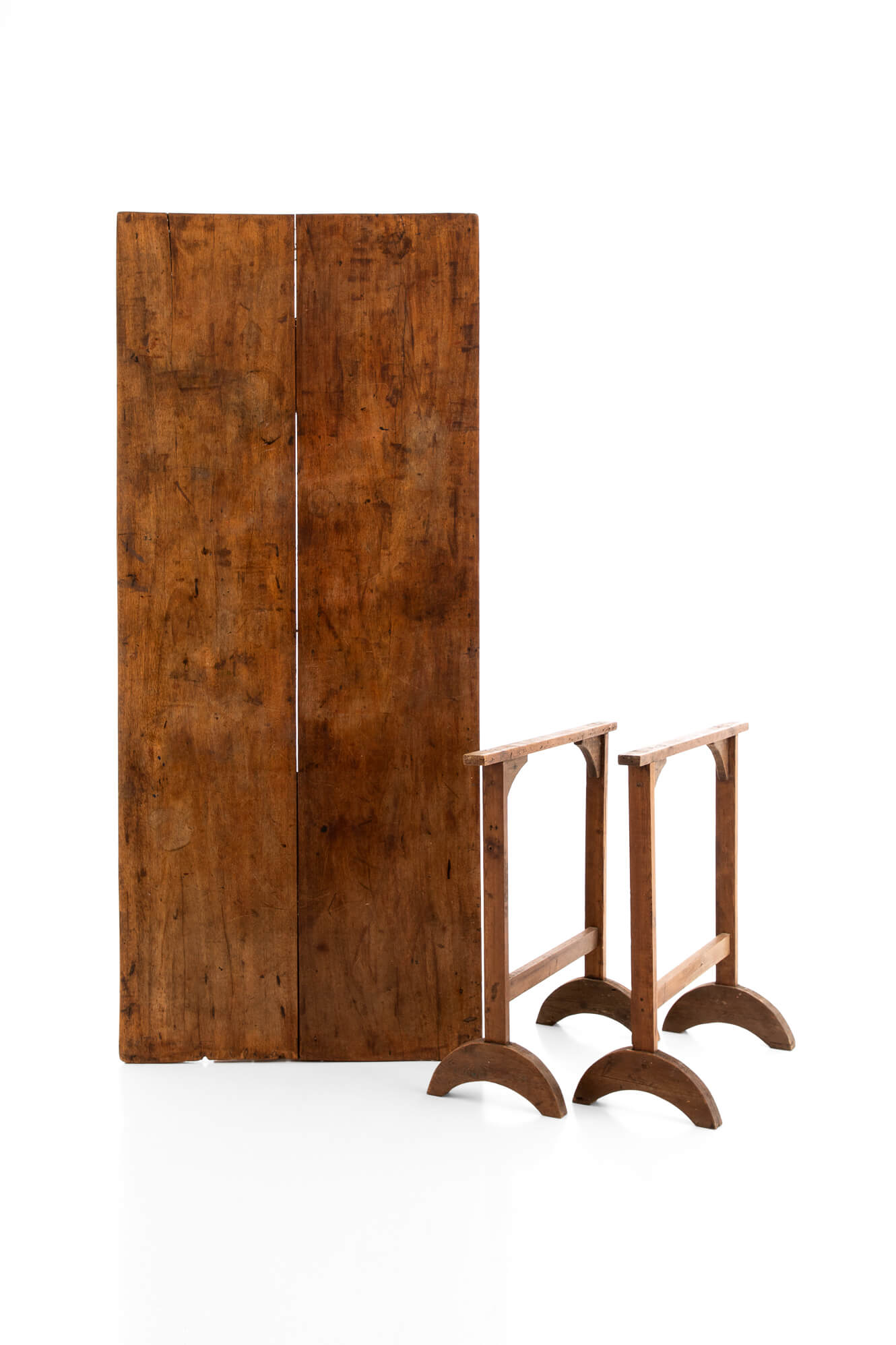 With a two plank top raised over two rounded trestle bases on curved feet.