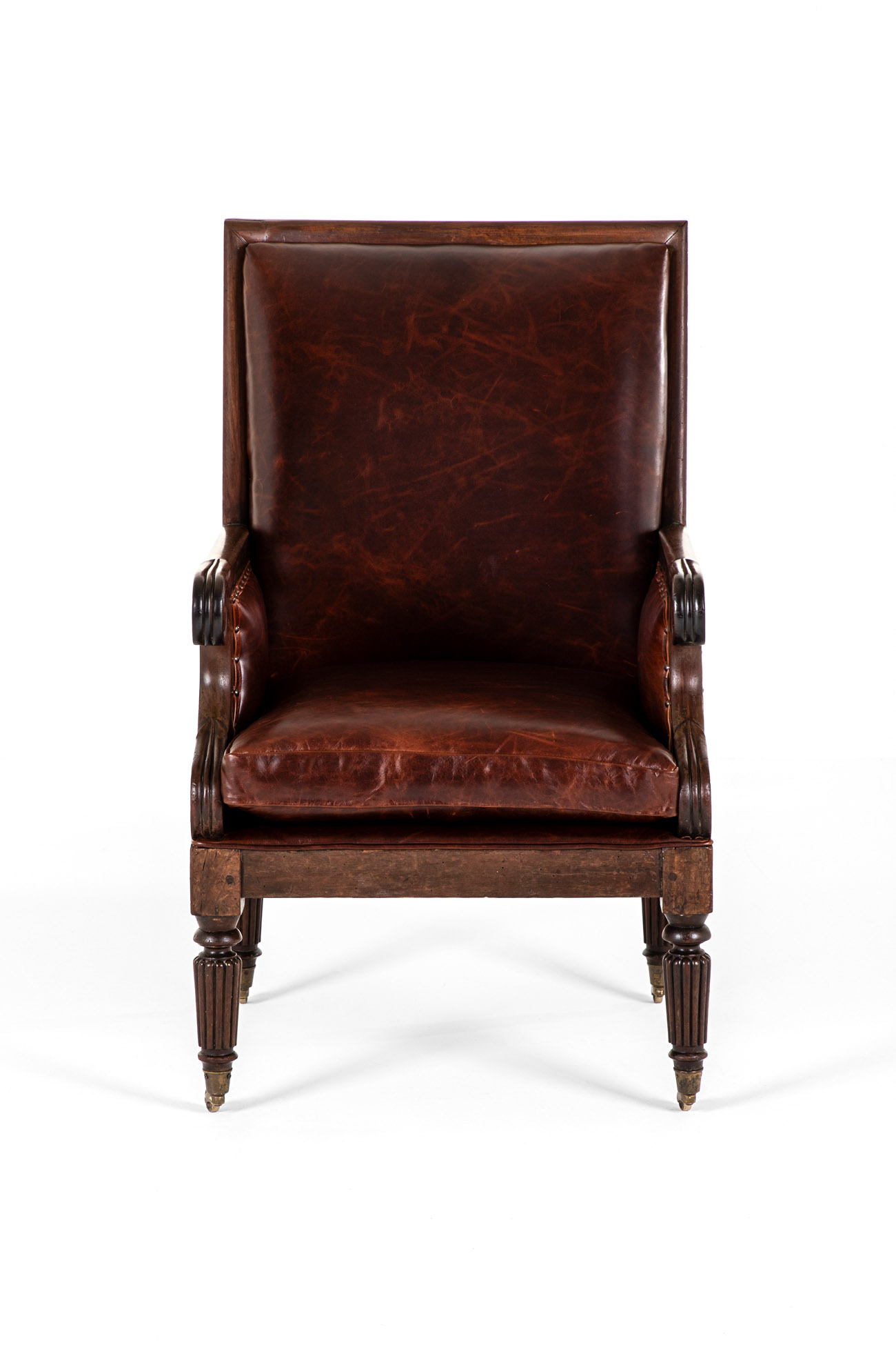 A wonderful George IV mahogany library chair upholstered in chestnut brown soft leather.