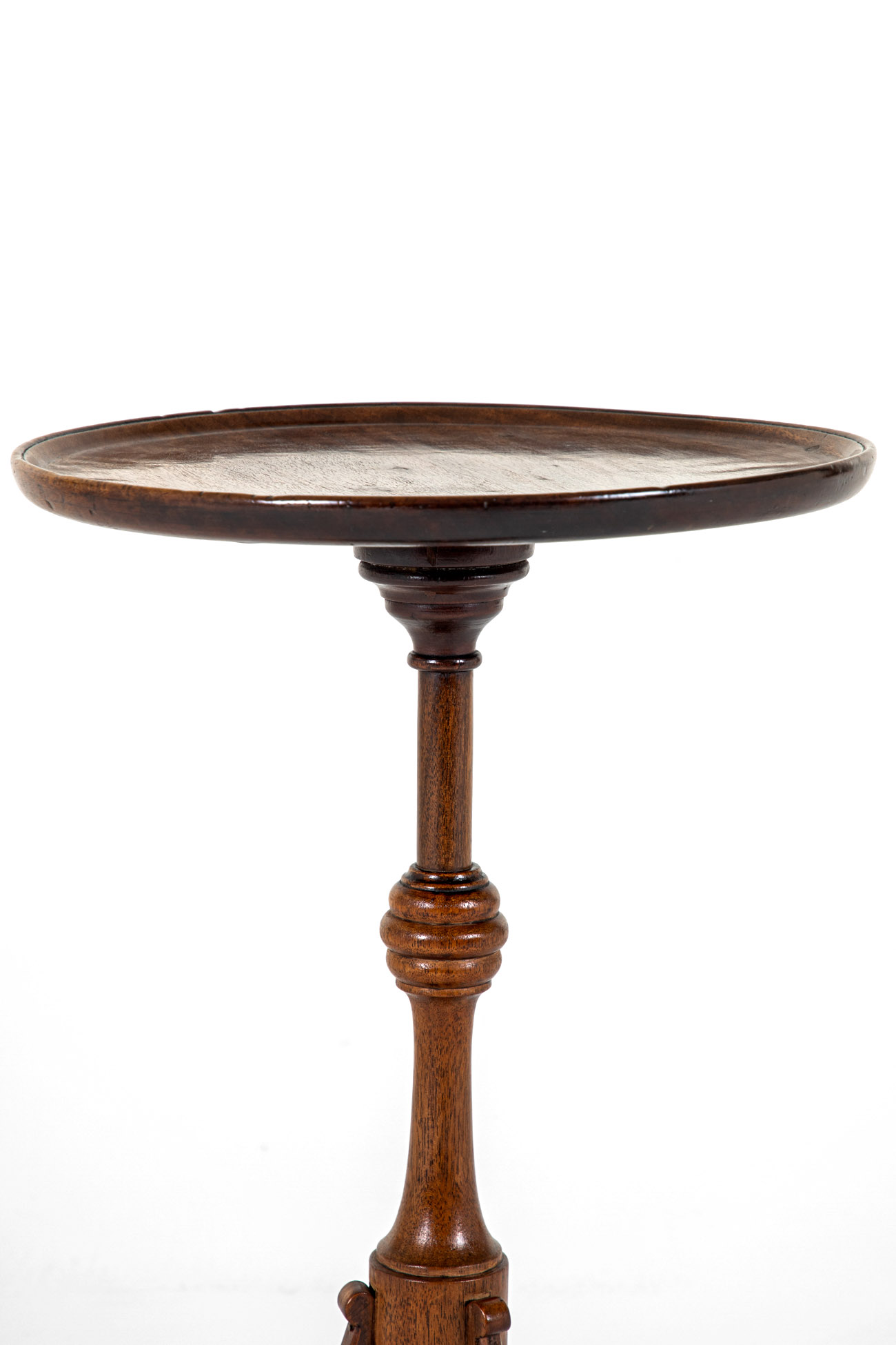 The table has a circular mahogany dished top raised on a turned column with three down splay supports finished with ball ends.