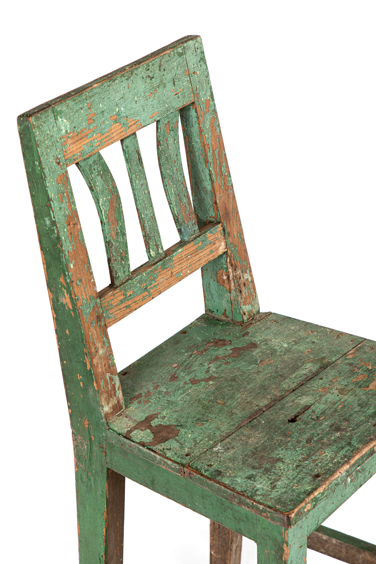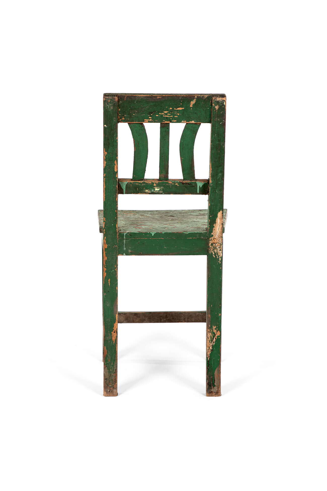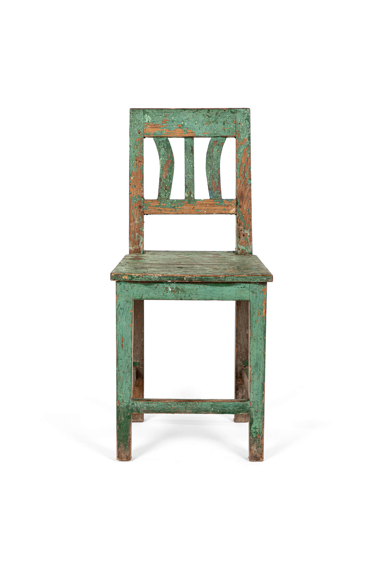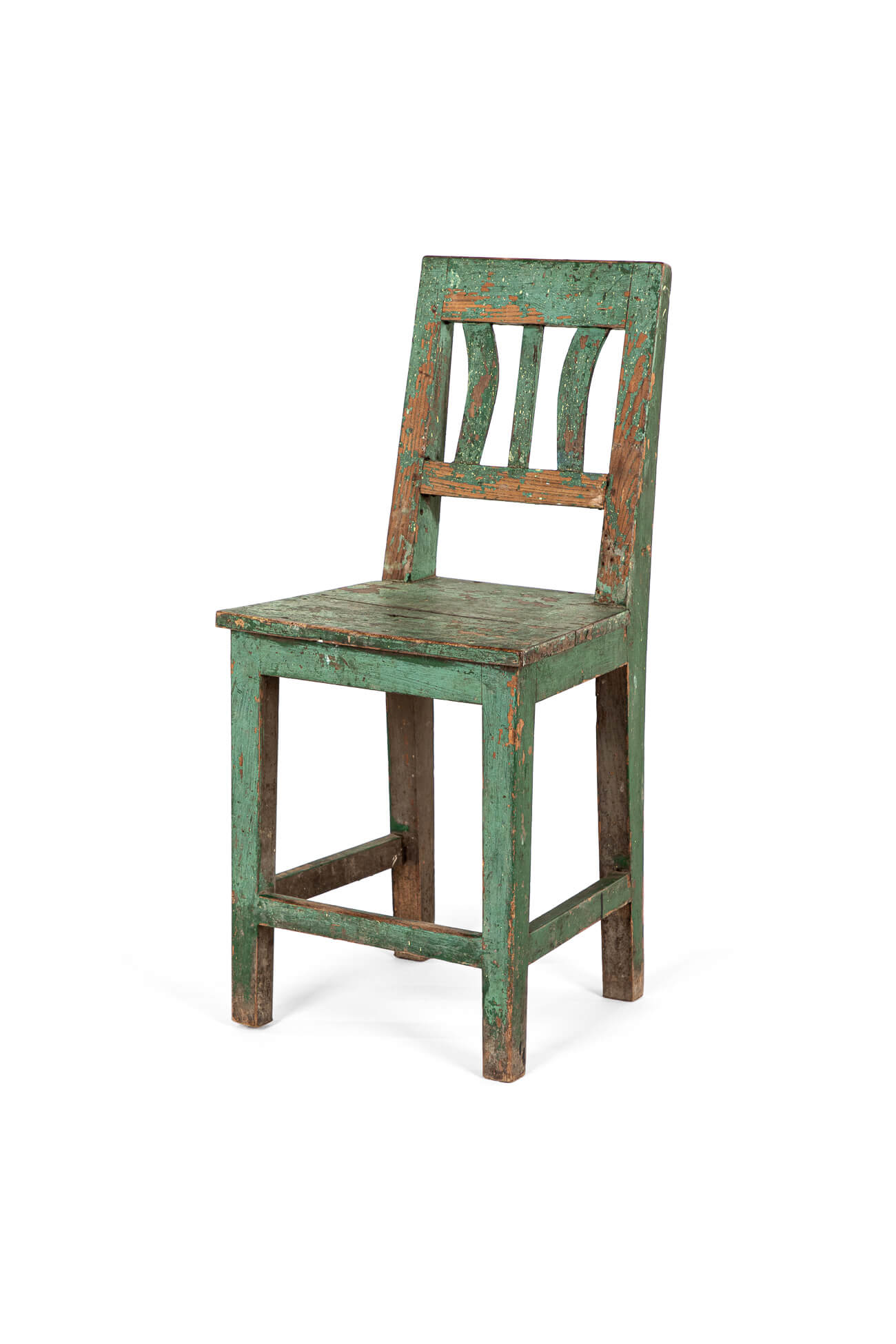 A simple Scandinavian side chair in pine in an olive green paint finish.