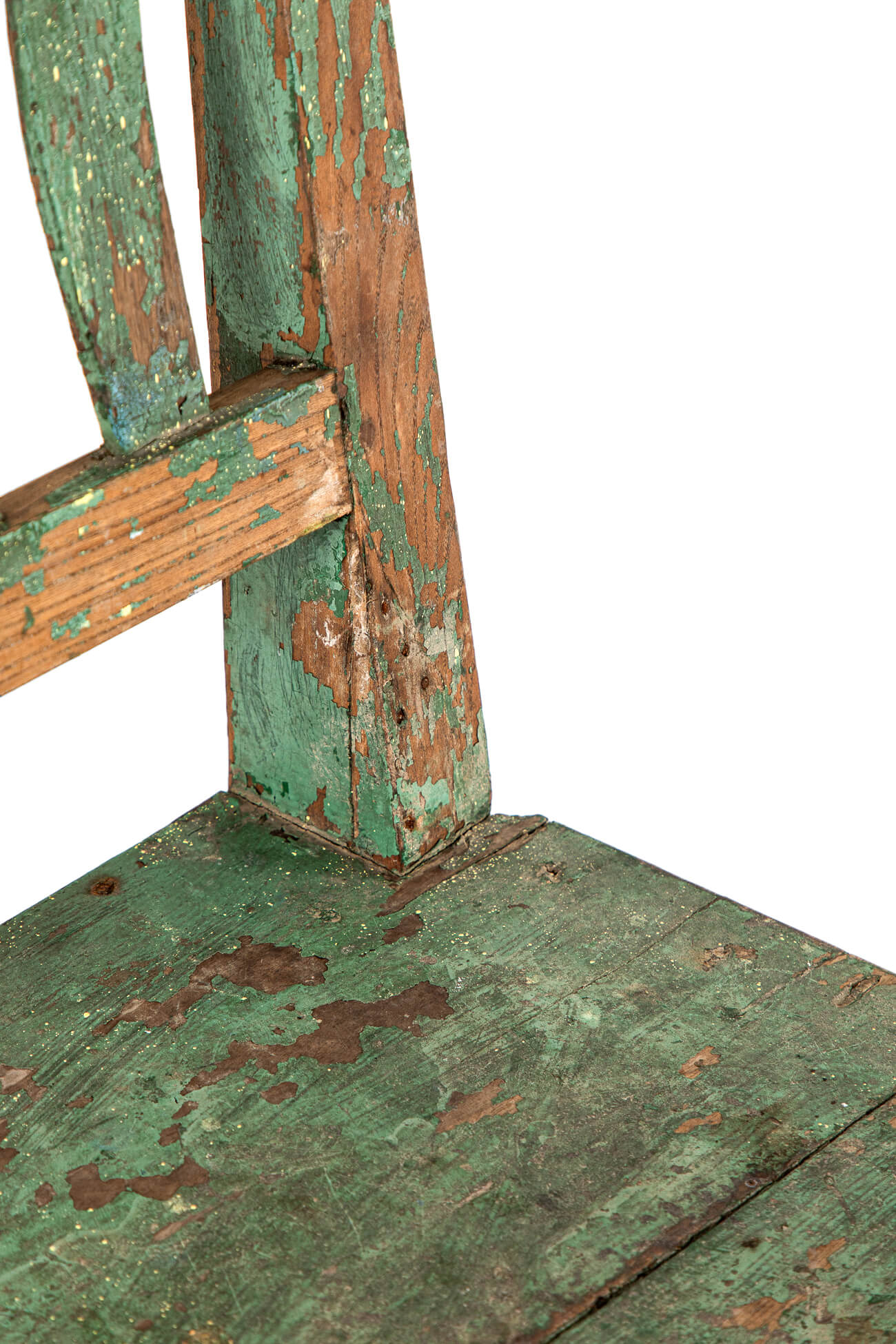 The back rest with decorative curved slats and a straight back with a time worn two plank seat .