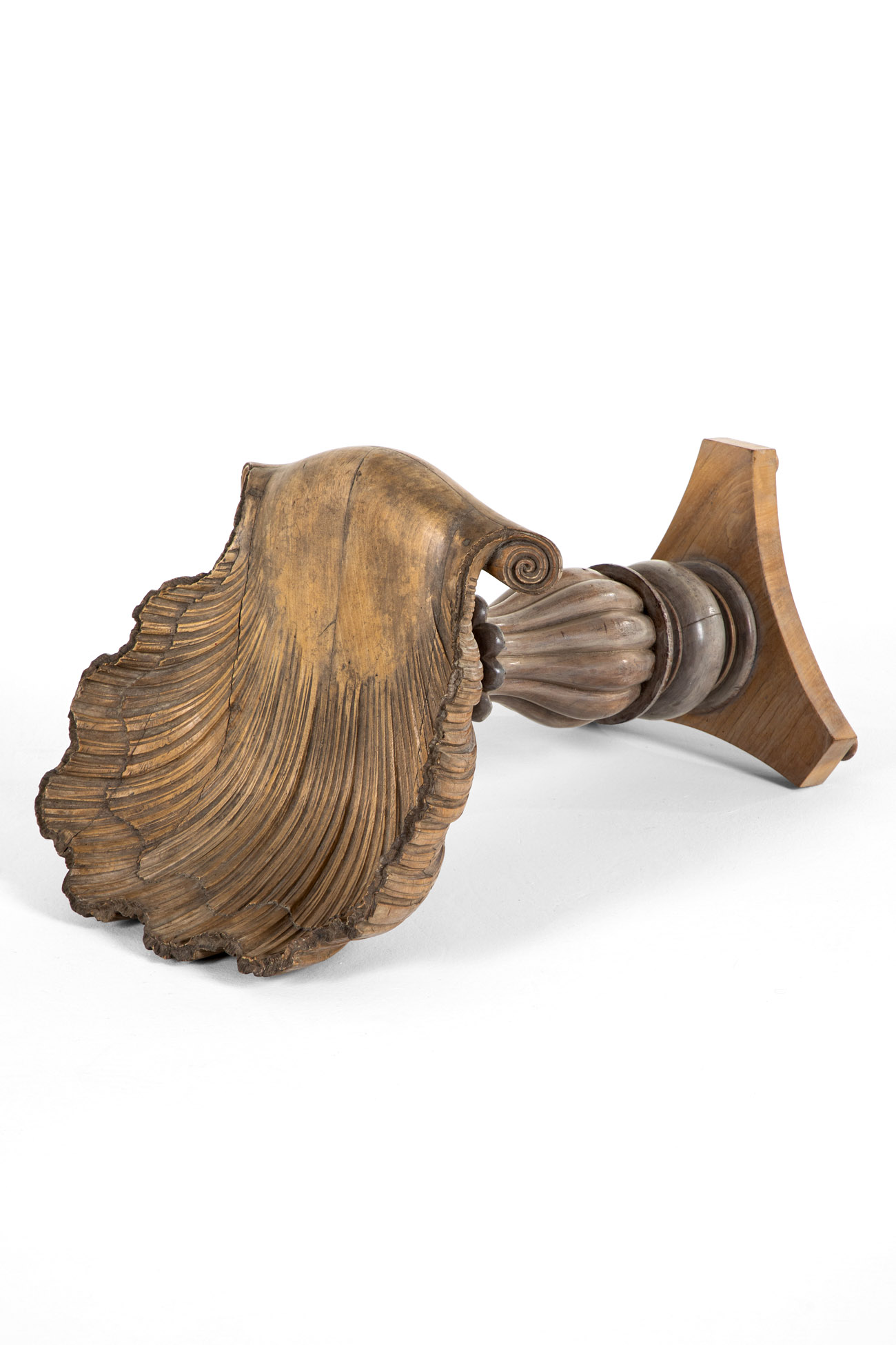 The chair features a large, scalloped shell-shaped backrest, hand-carved and finished with gentle scrolls to each side of the seat.