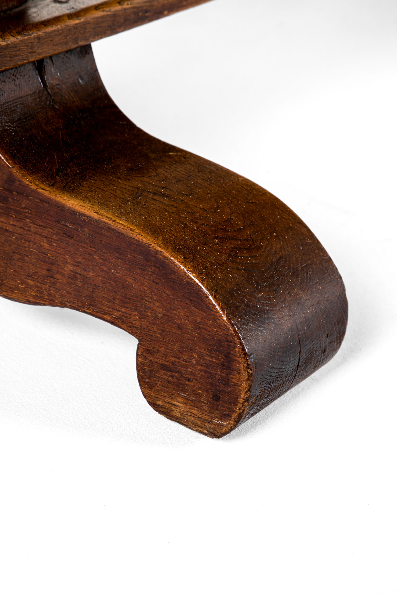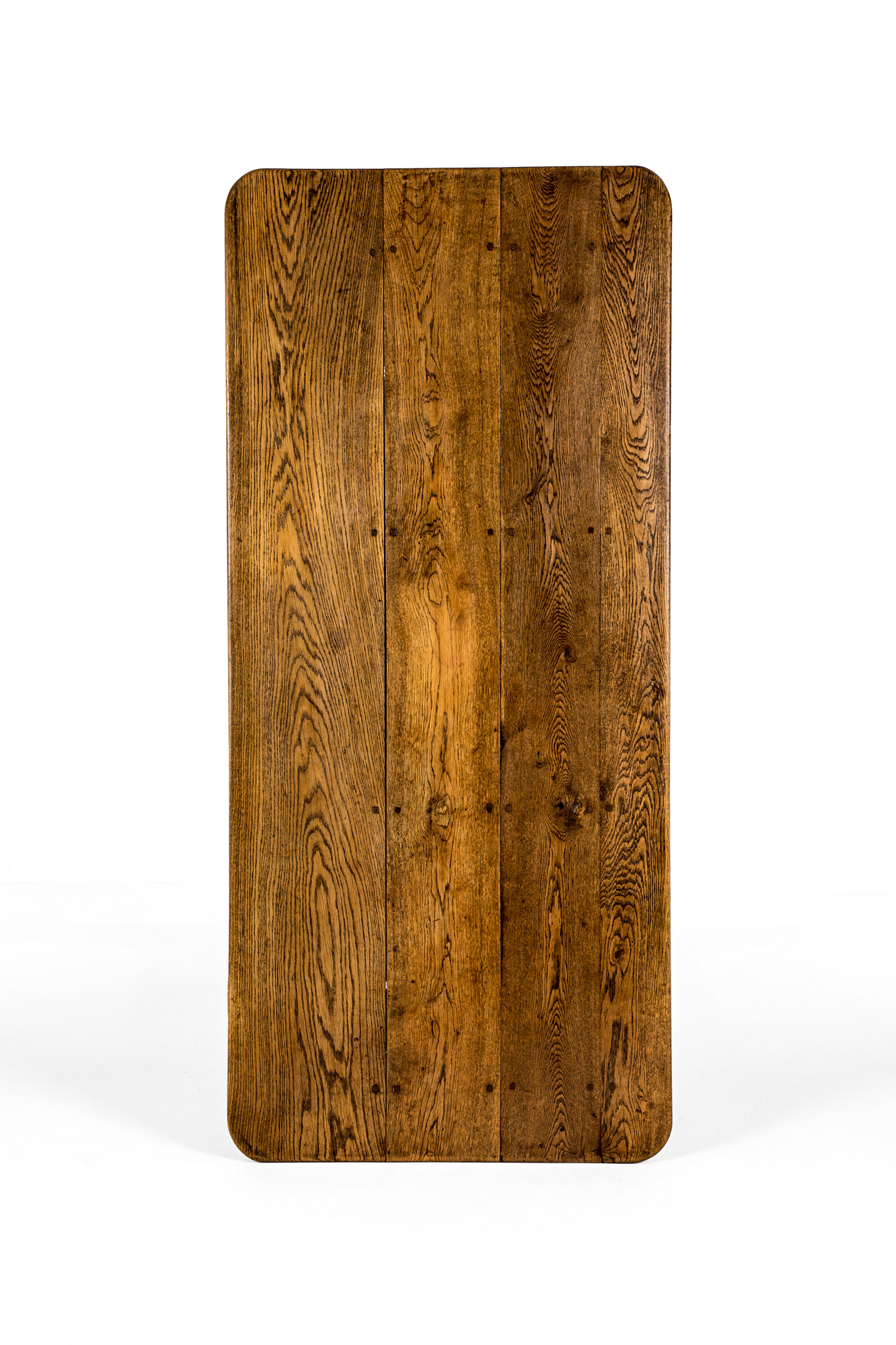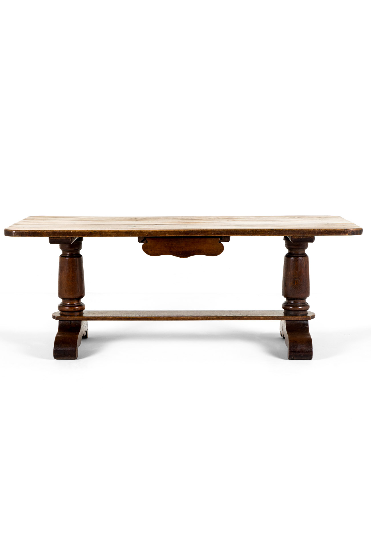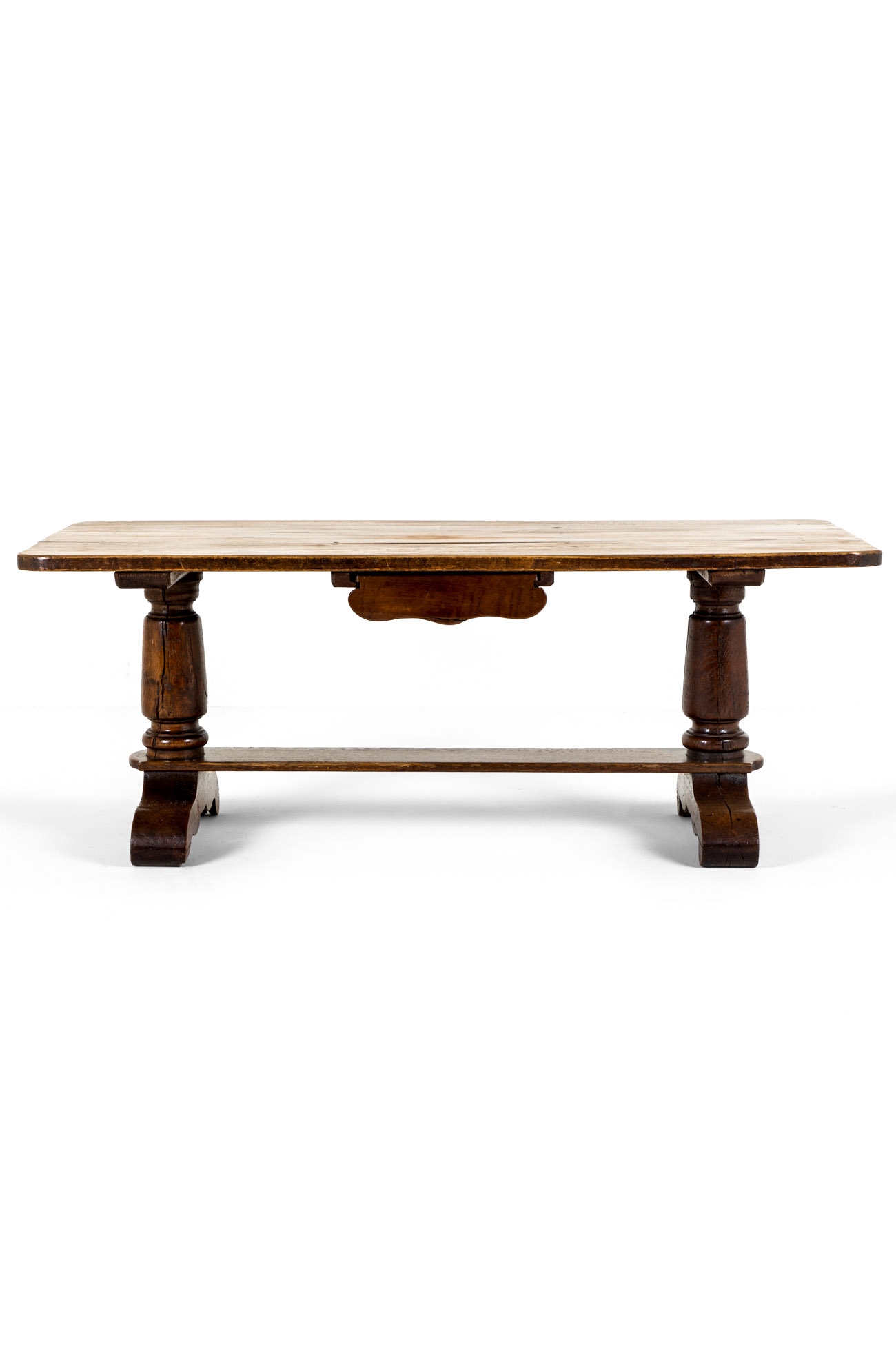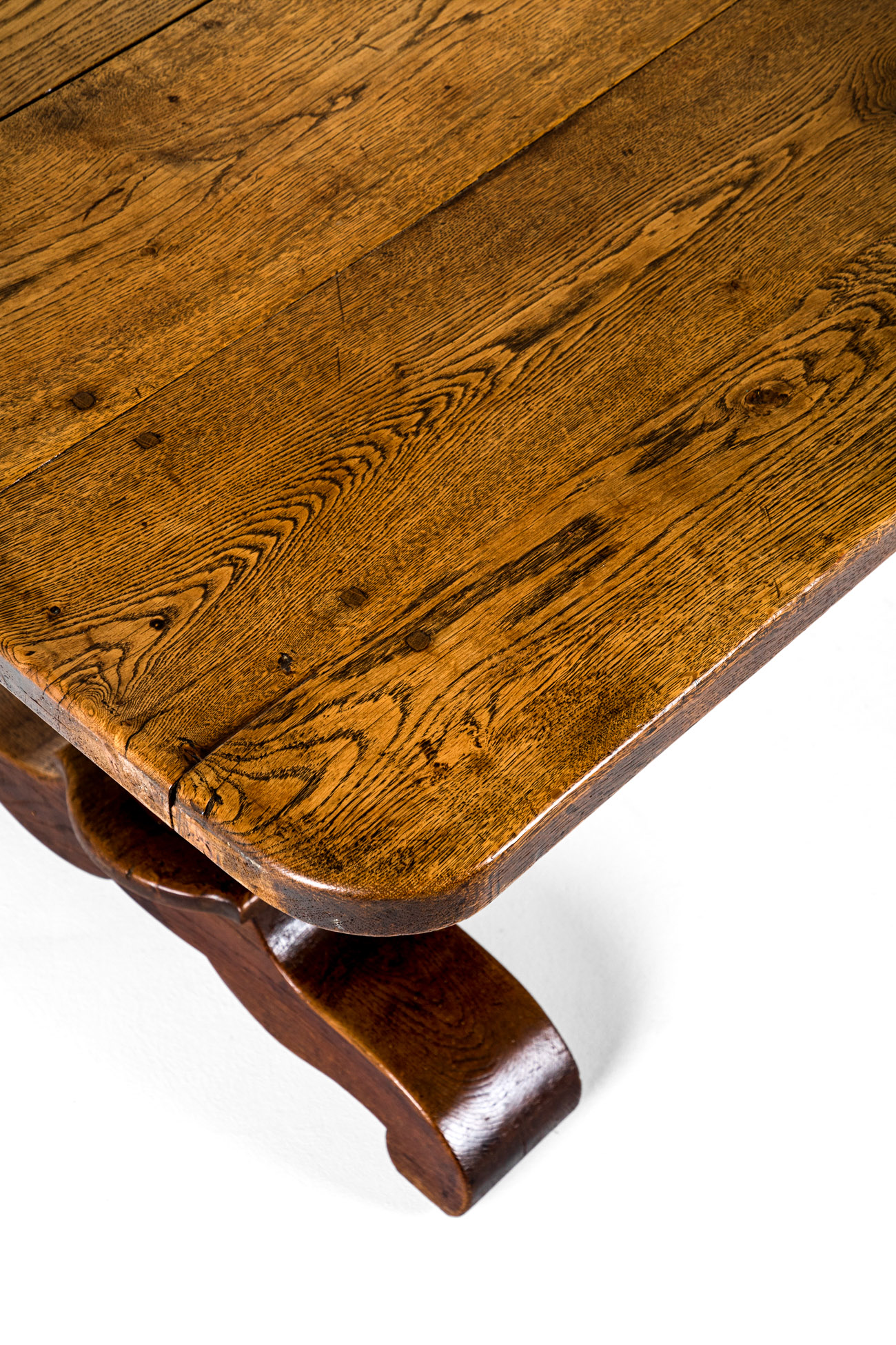 The top is supported by a pair of twin pedestal turned baluster supports with shapely sledge feet united by a thick flat oak stretcher.