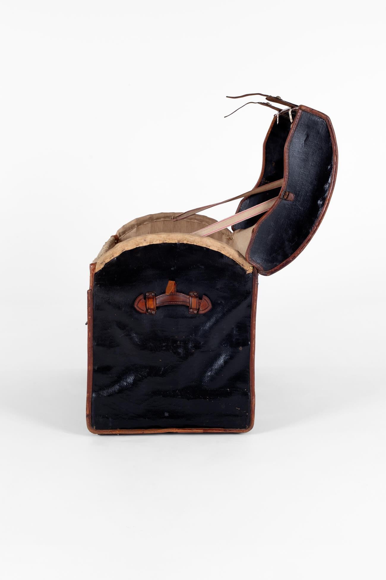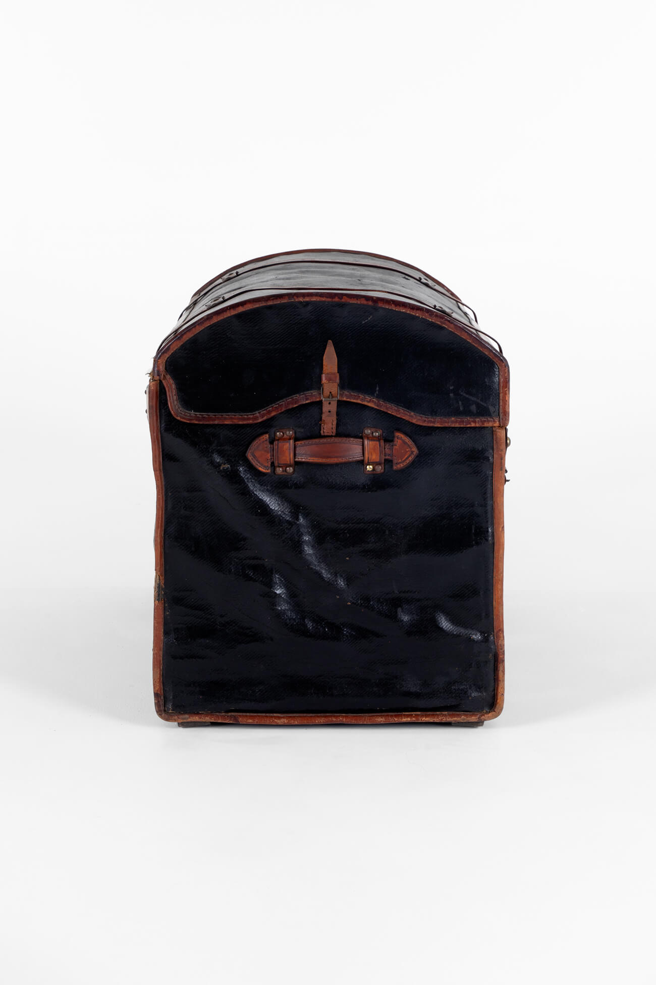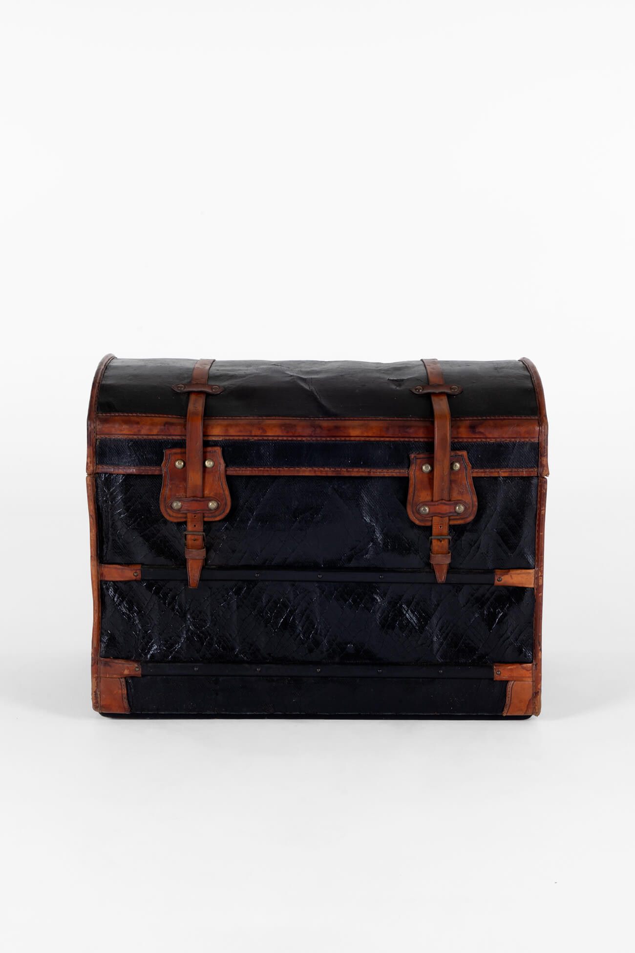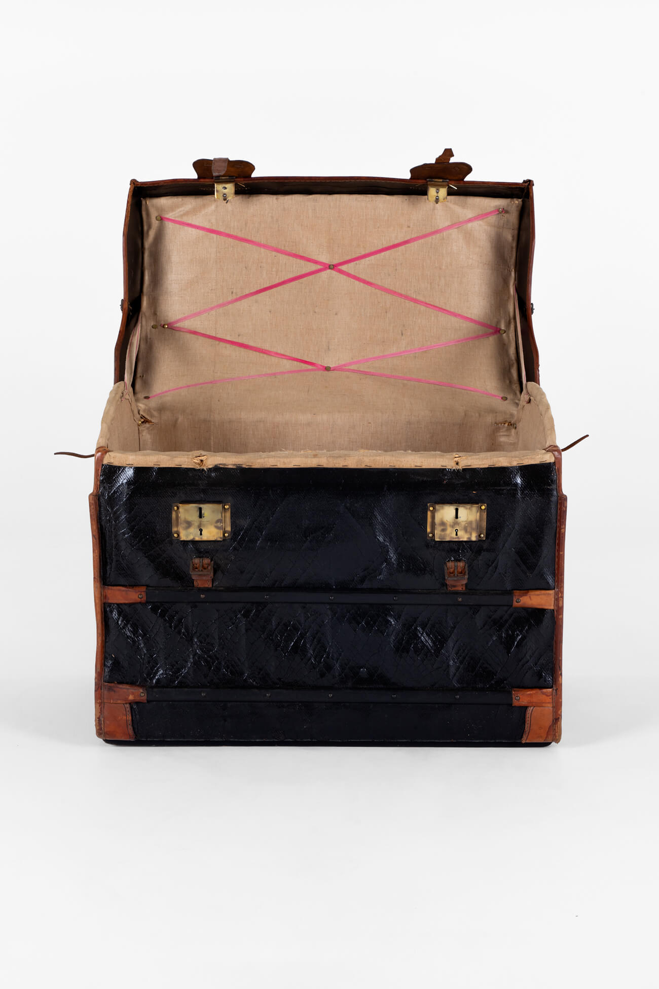 The trunk is made of canvas and has been leather-mounted around a wicker dome top. Two large buckles to the front of the trunk secure the lid coupled with a small buckle to either end. To the rear, the trunk has two large leather hinges with studded brackets.