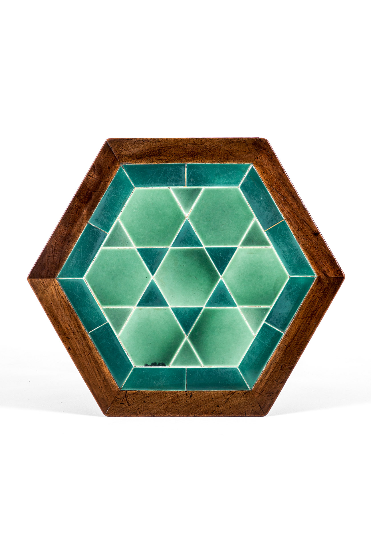 The top is inlaid with a geometrical pattern of two tone emerald coloured tiles offering a perfect juxtapose to the mahogany base.