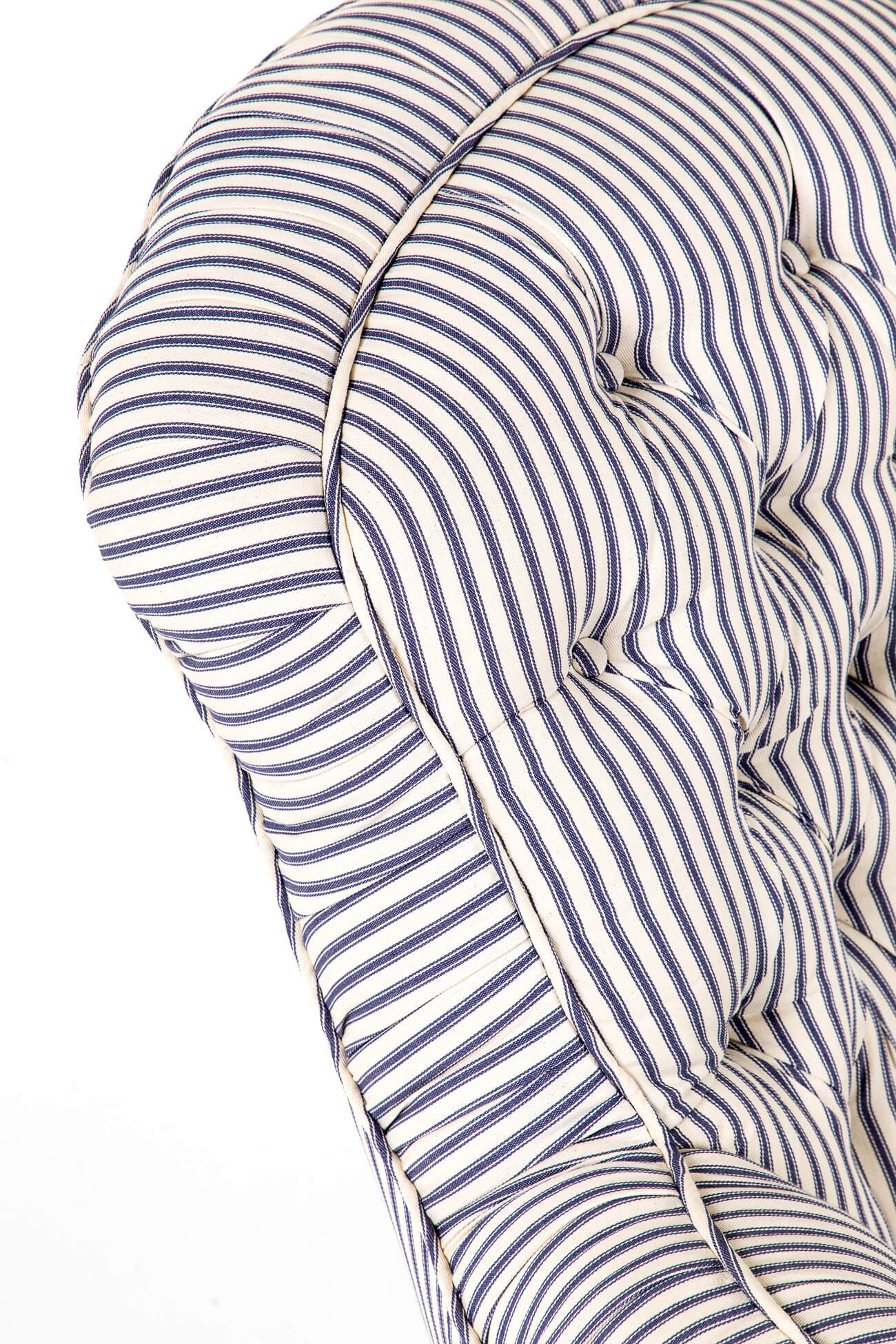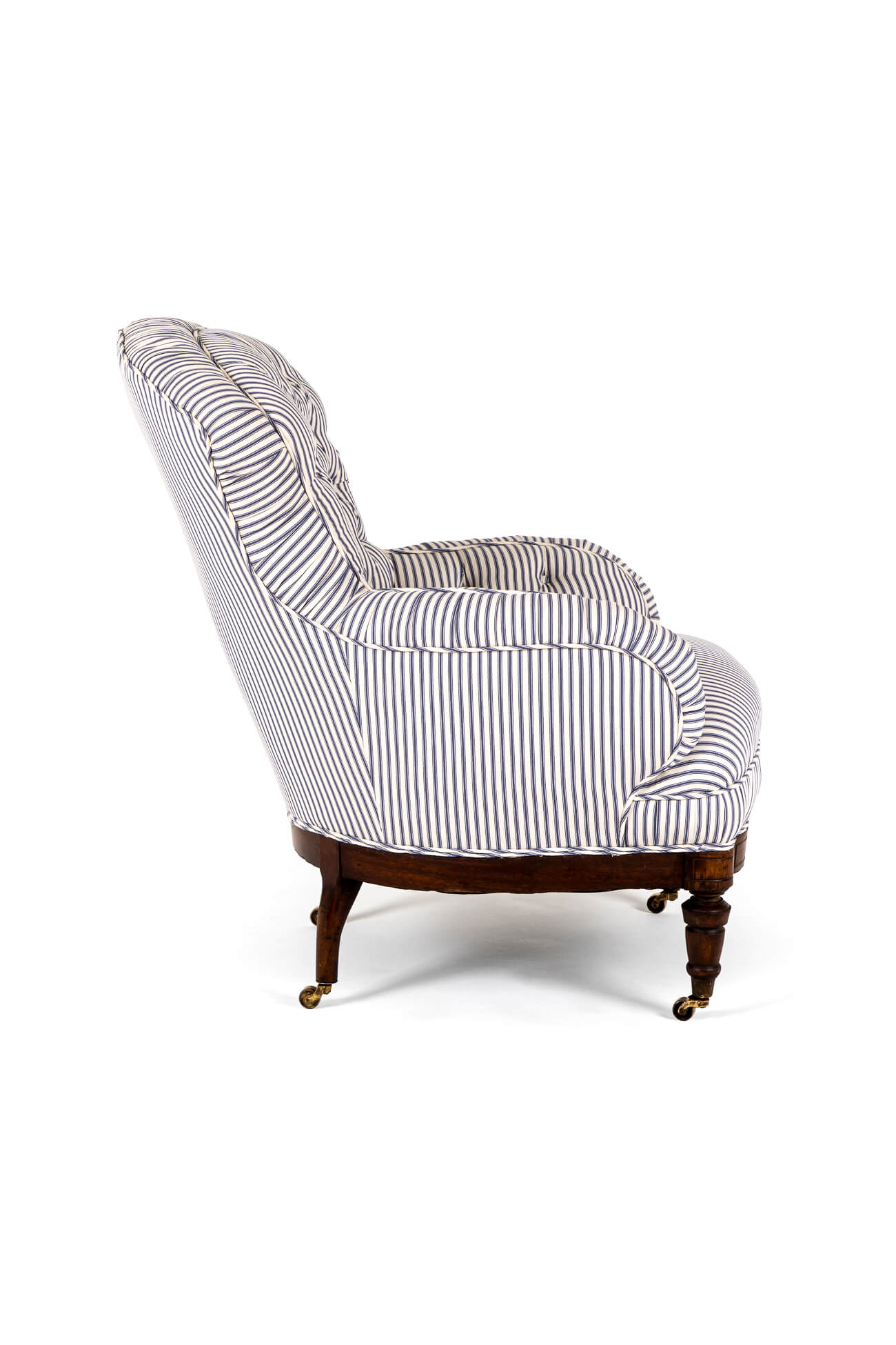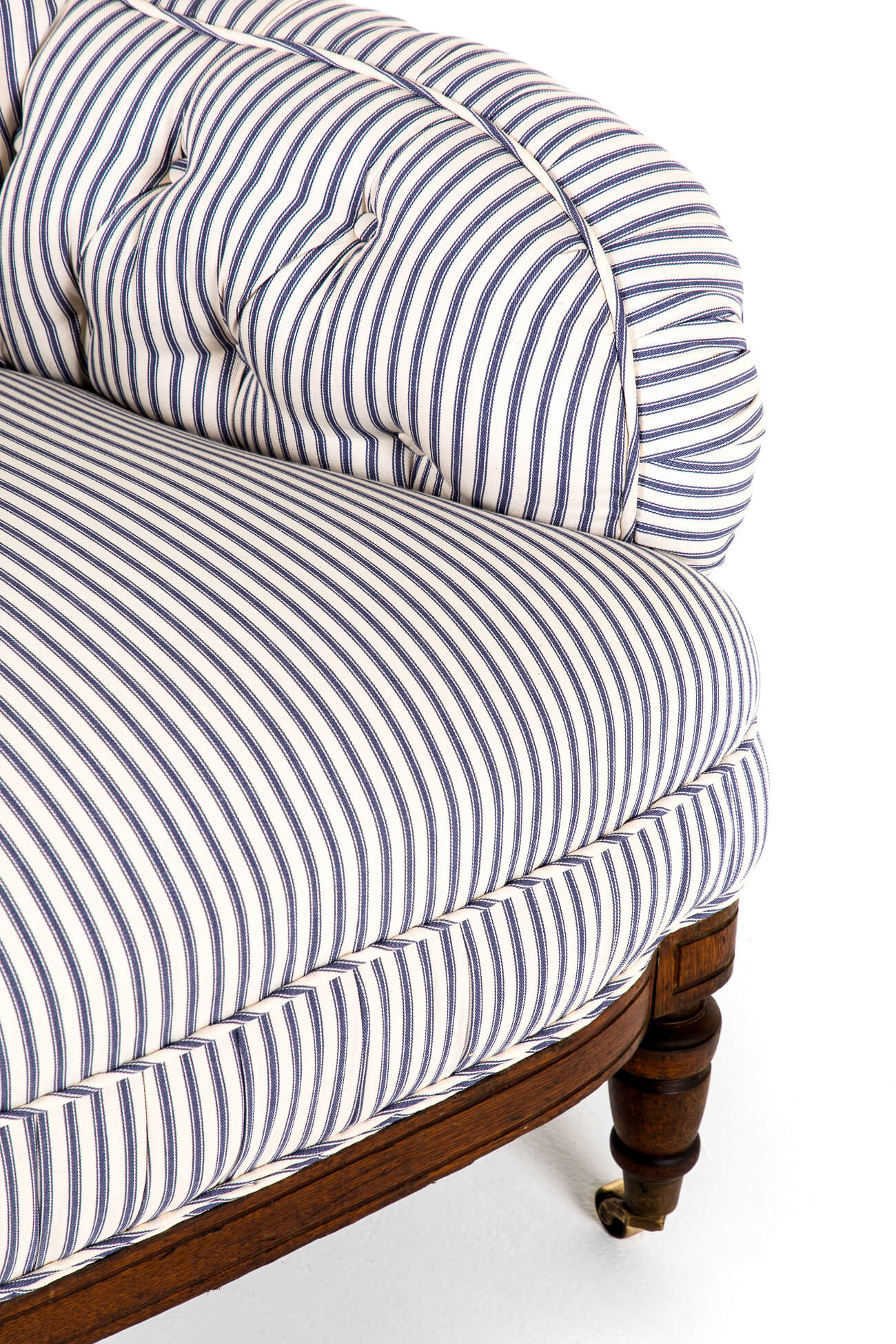A wonderful Victorian overstuffed button back armchair in blue stripe Cotswold Ticking.