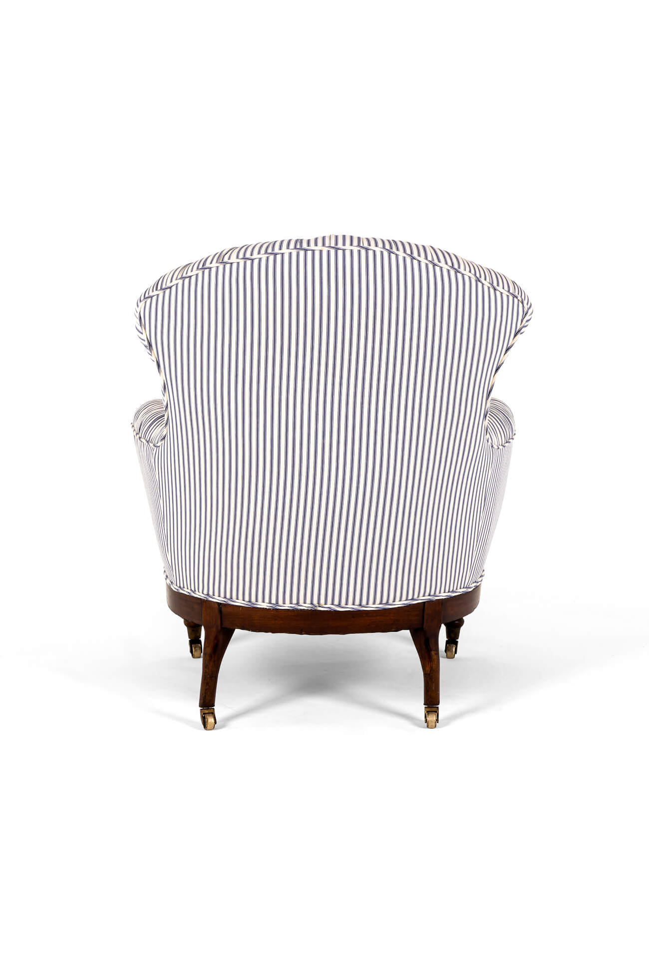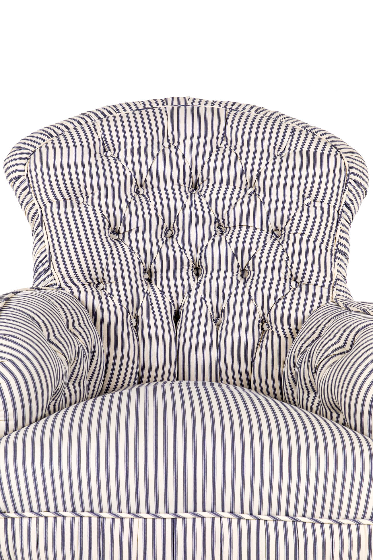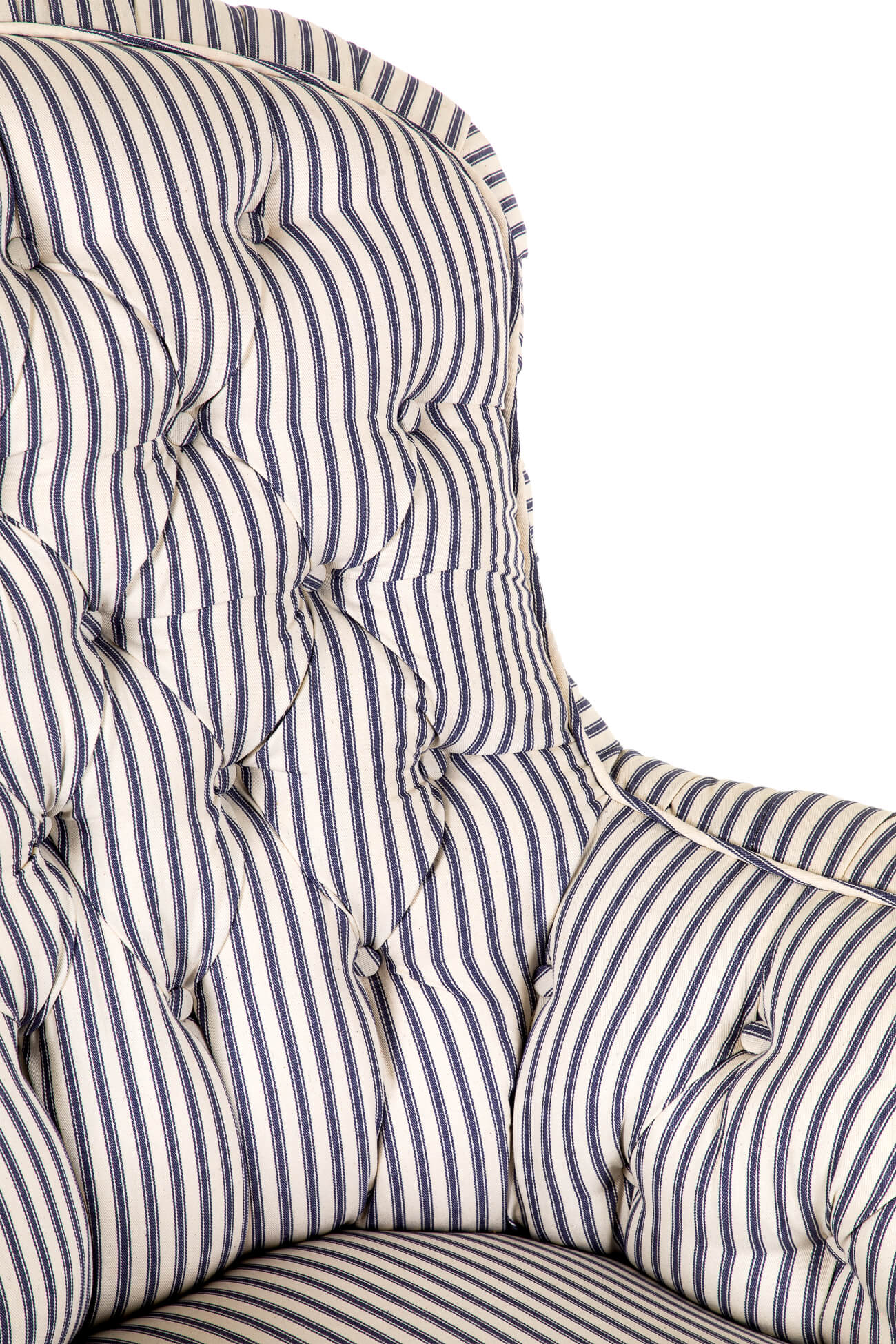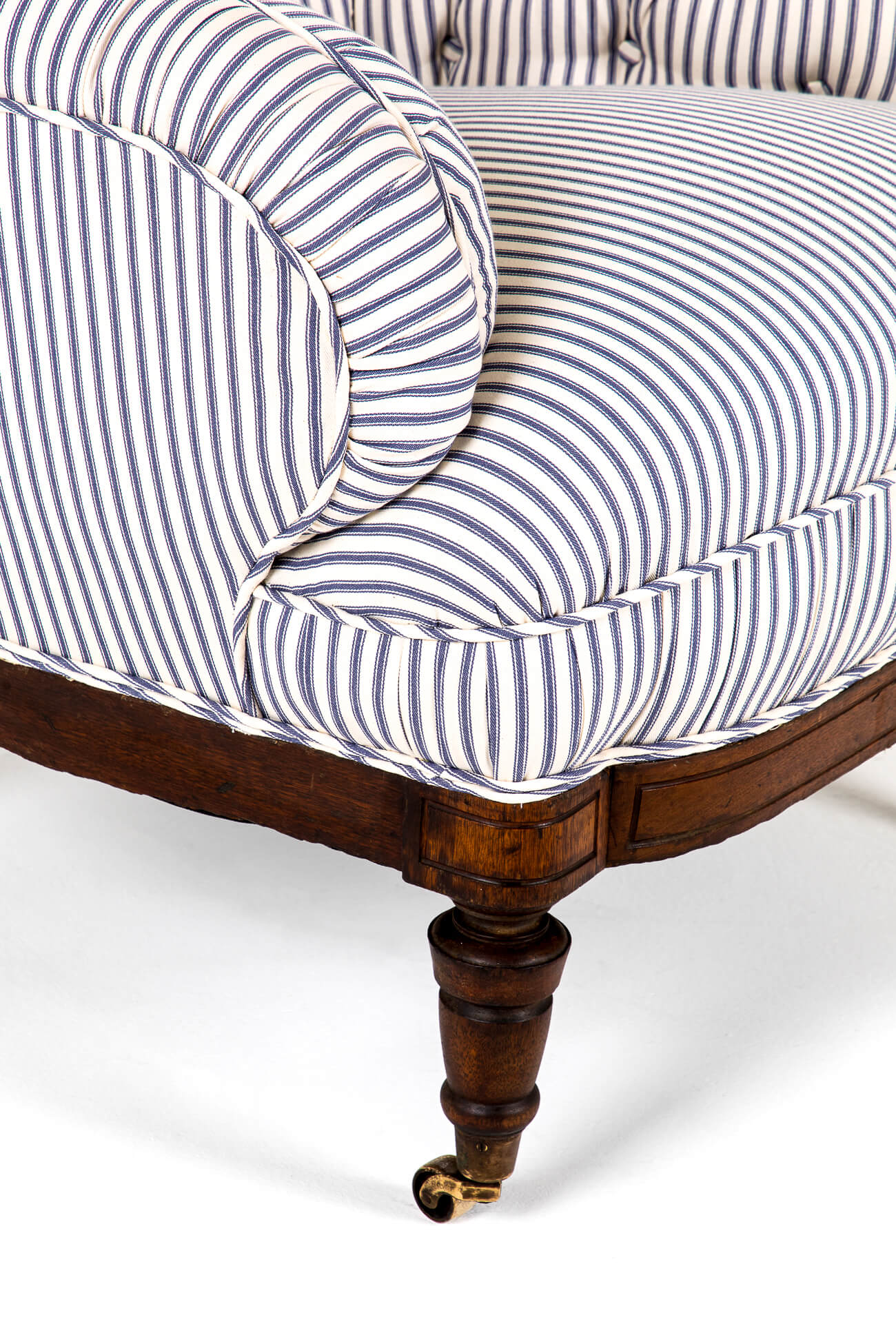 A wonderful Victorian overstuffed button back armchair in blue stripe Cotswold Ticking.