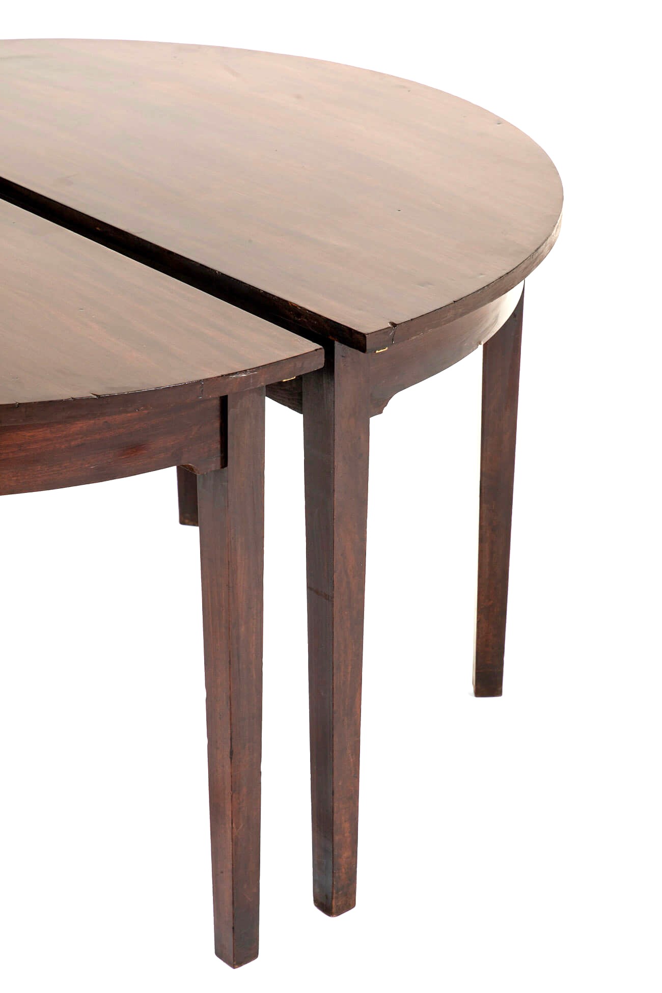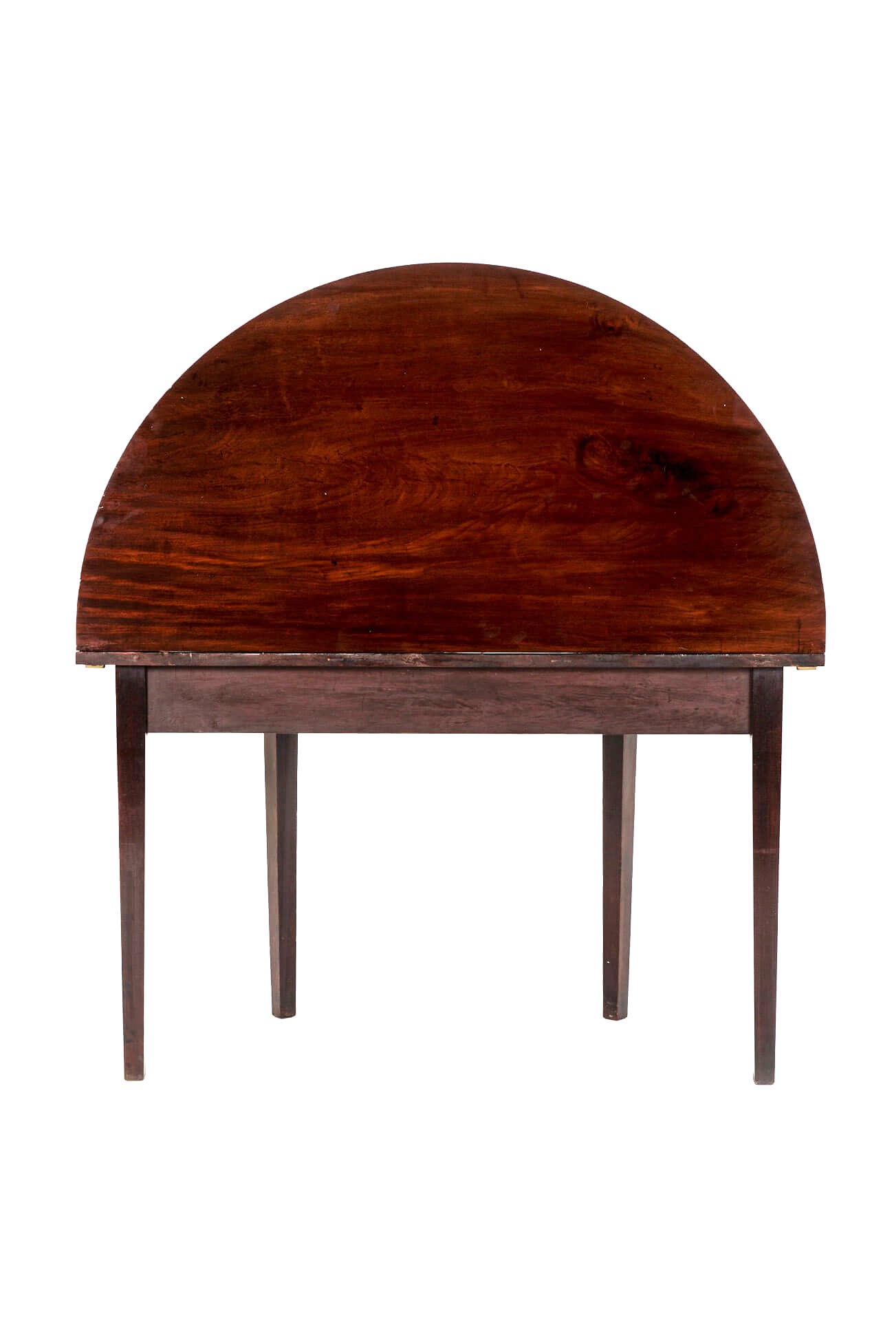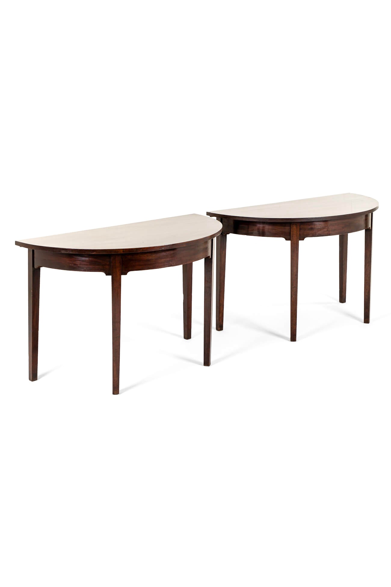 A pair of George III Demi Lune console tables in mahogany on square tapered legs.