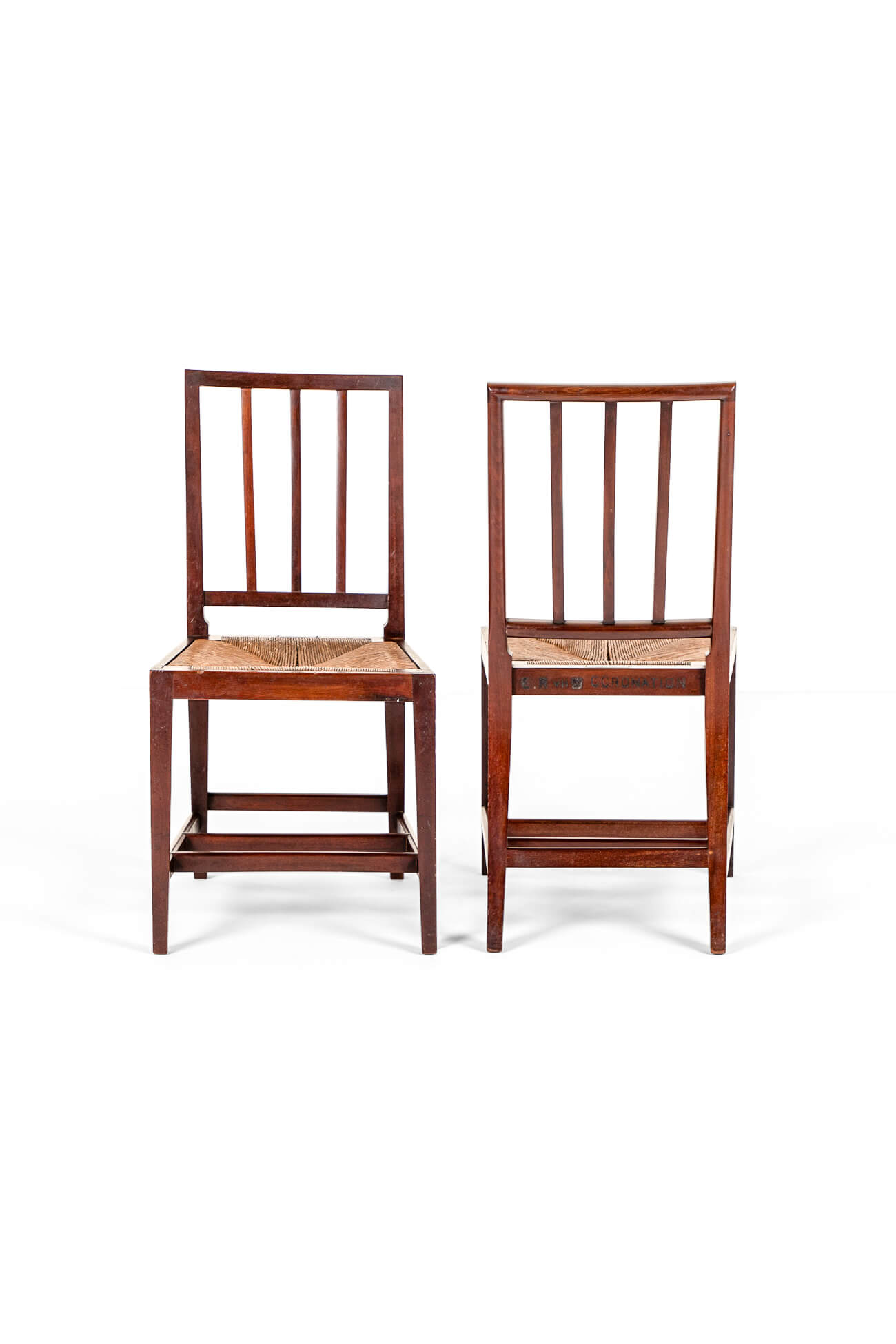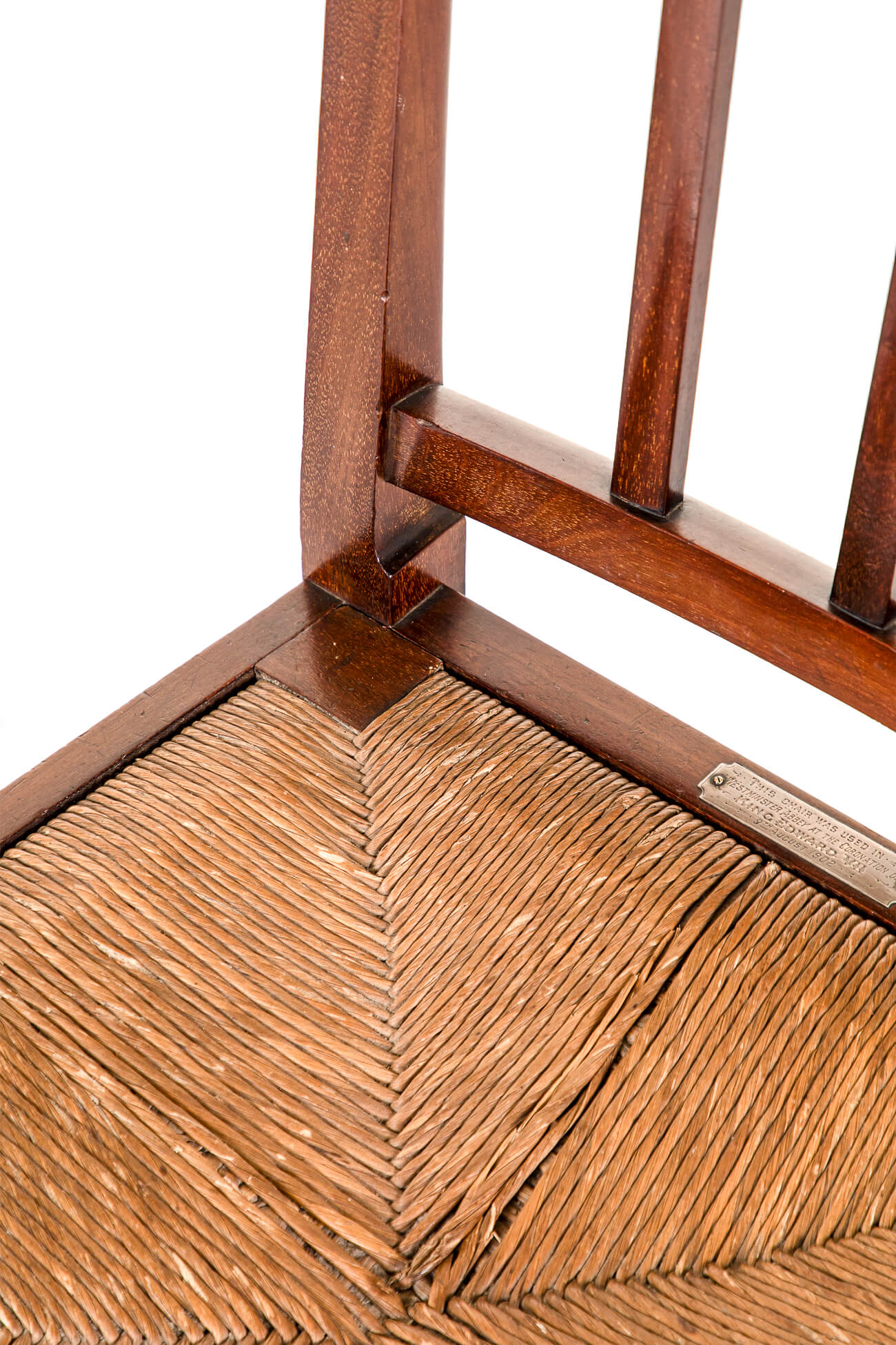 The chairs have simple triple vertical back splats with drop in rush seats with square tapering legs and finished with triple stretchers to the base.