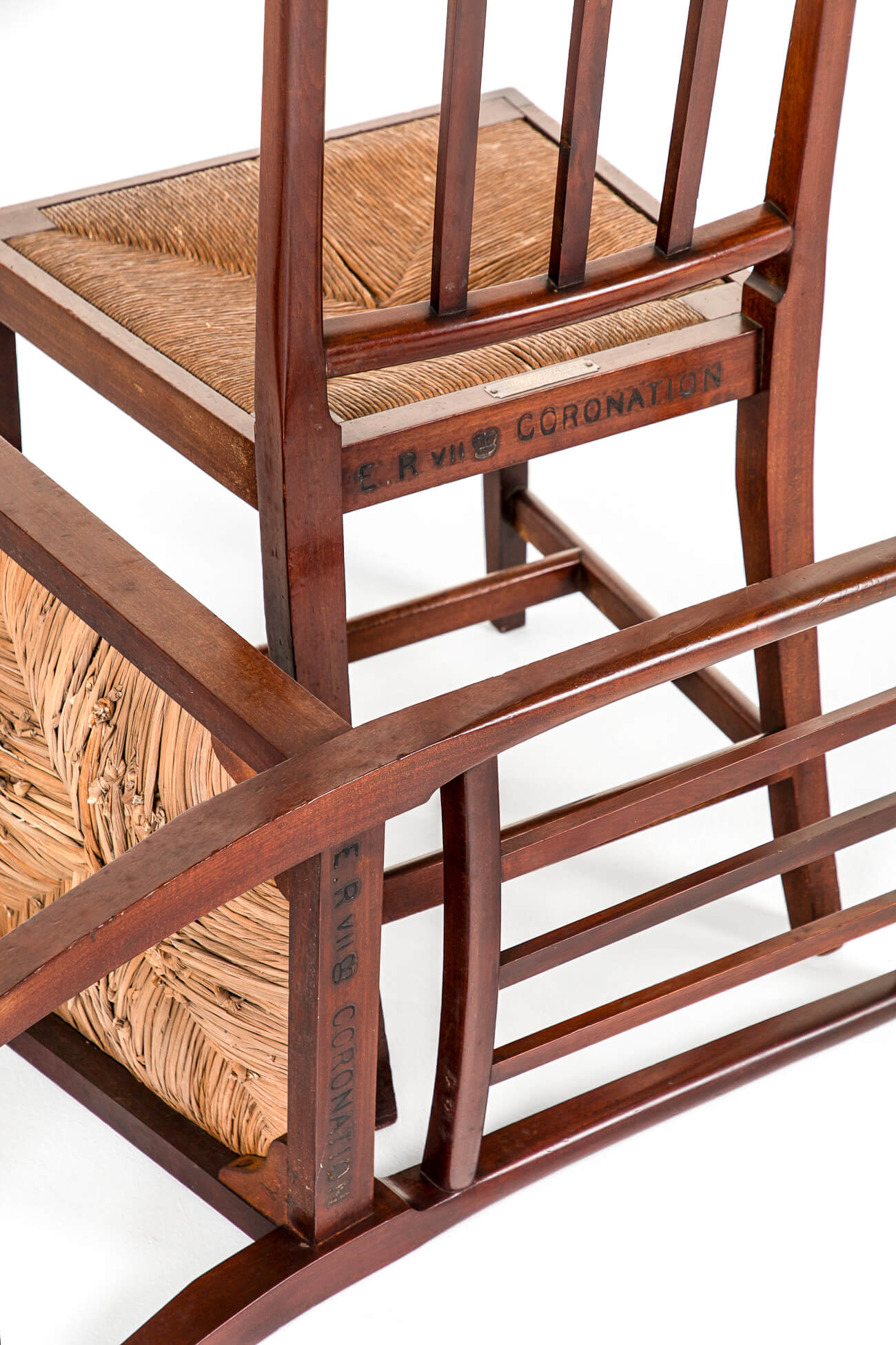 To the reverse of each seat rail is stamped with ‘E.R VII Coronation’ with the stamp of the crown also present. The chairs are accompanied with applied white metal plaques stating provenance. Each plaque reads, ” This chair was used in Westminster Abbey at the coronation of King Edward VII, 09th August 1902″.