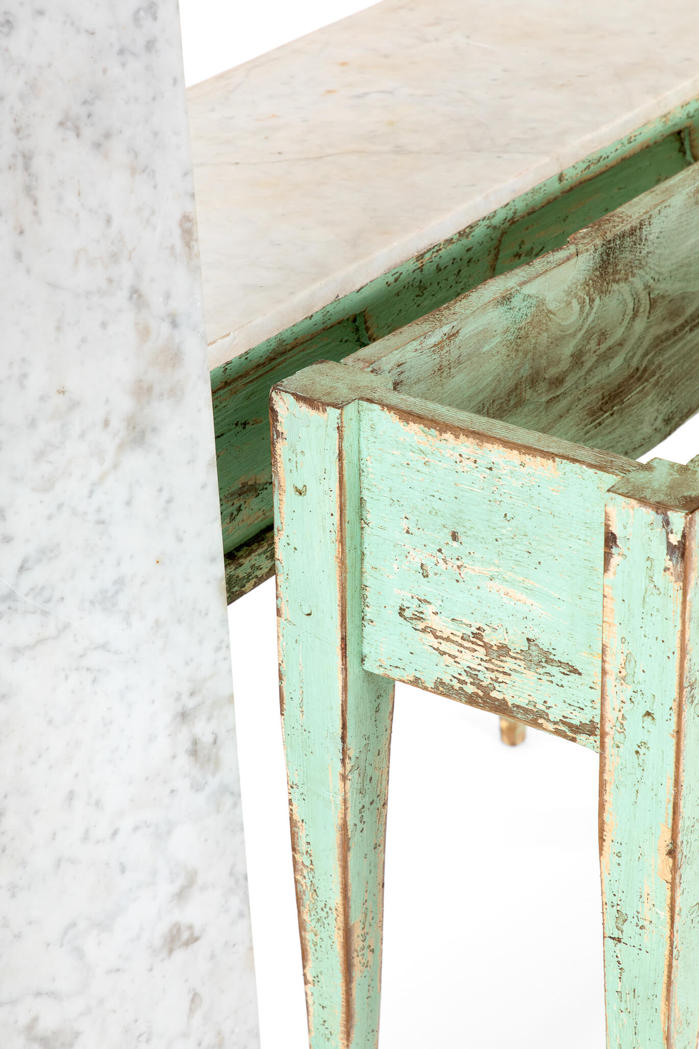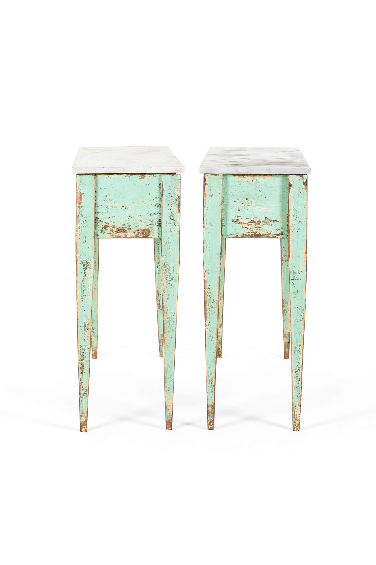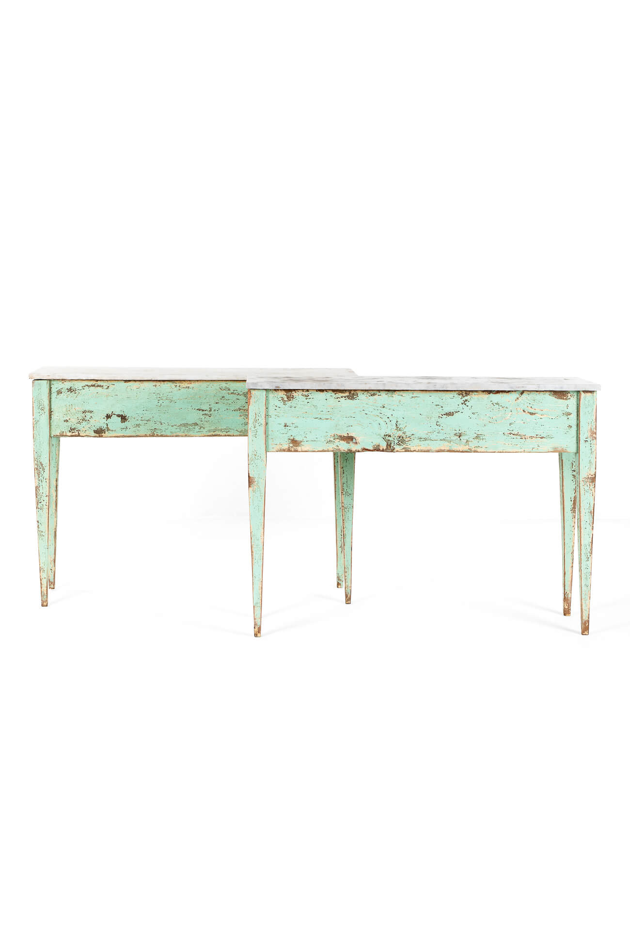 The bases in a chipped mint green finish both have a molded freize to the front and are raised on carved tapered legs.
