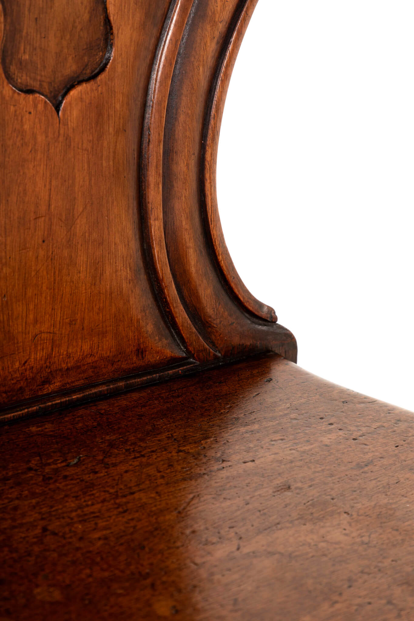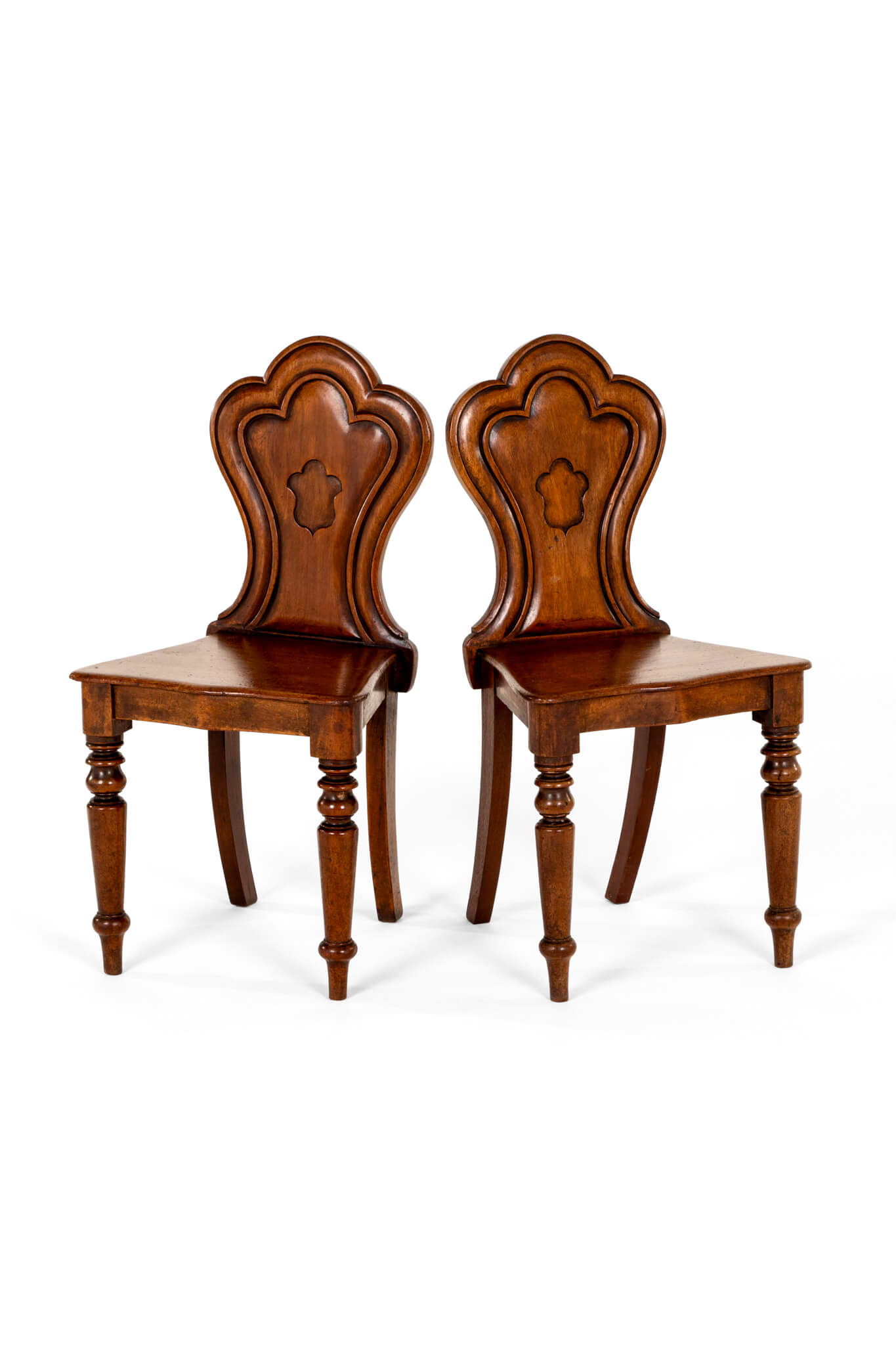 A pair of Victorian hall chairs in mahogany with shield backs complemented by decorative molded scroll work.