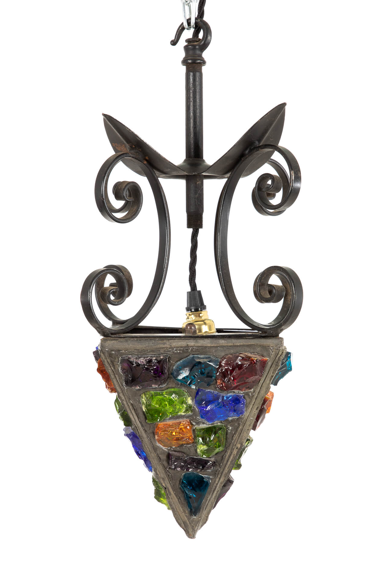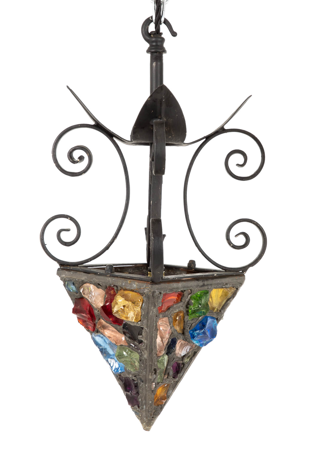 The four triangular sides are comprised of coloured slab glass set into lead.