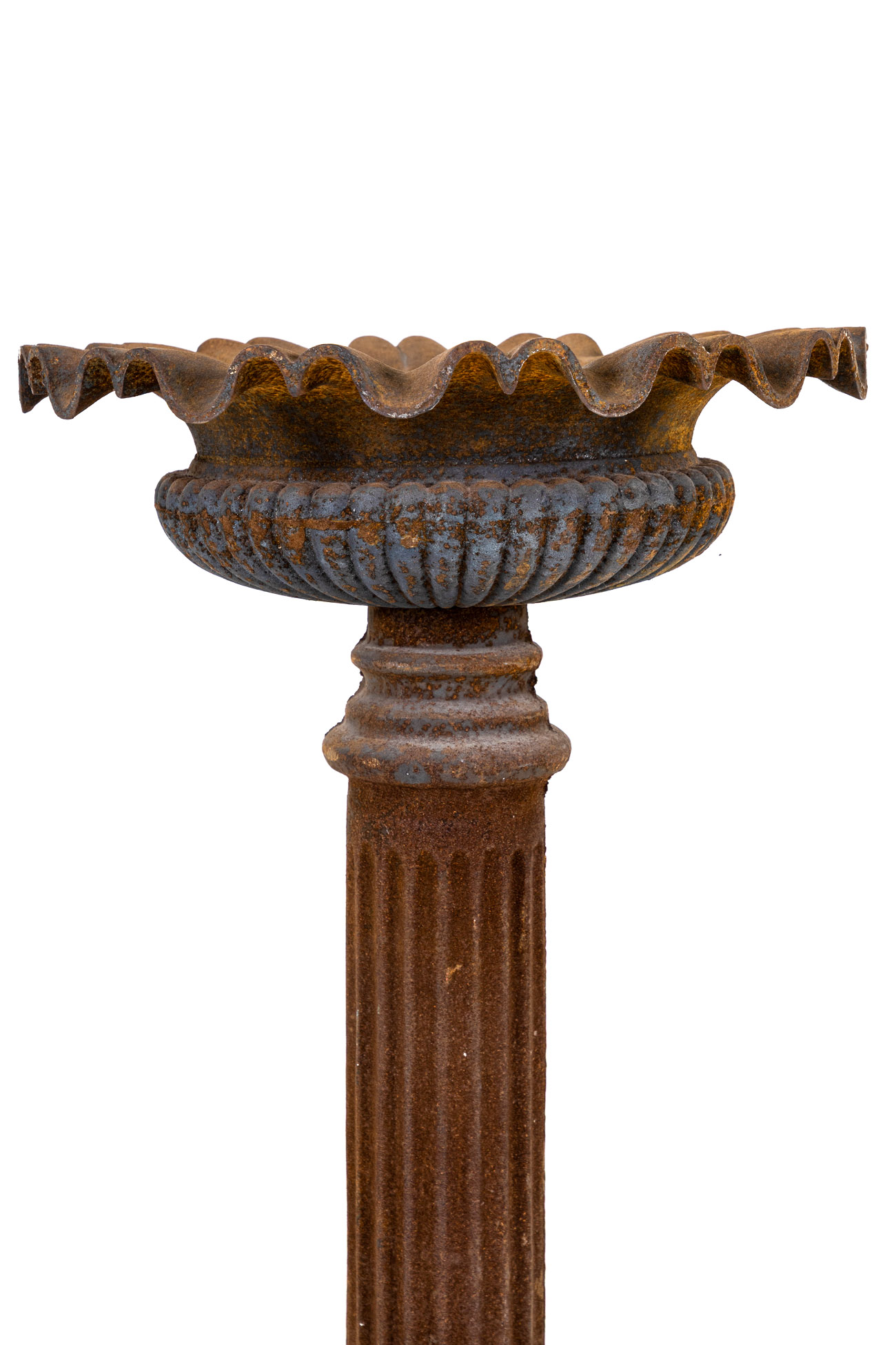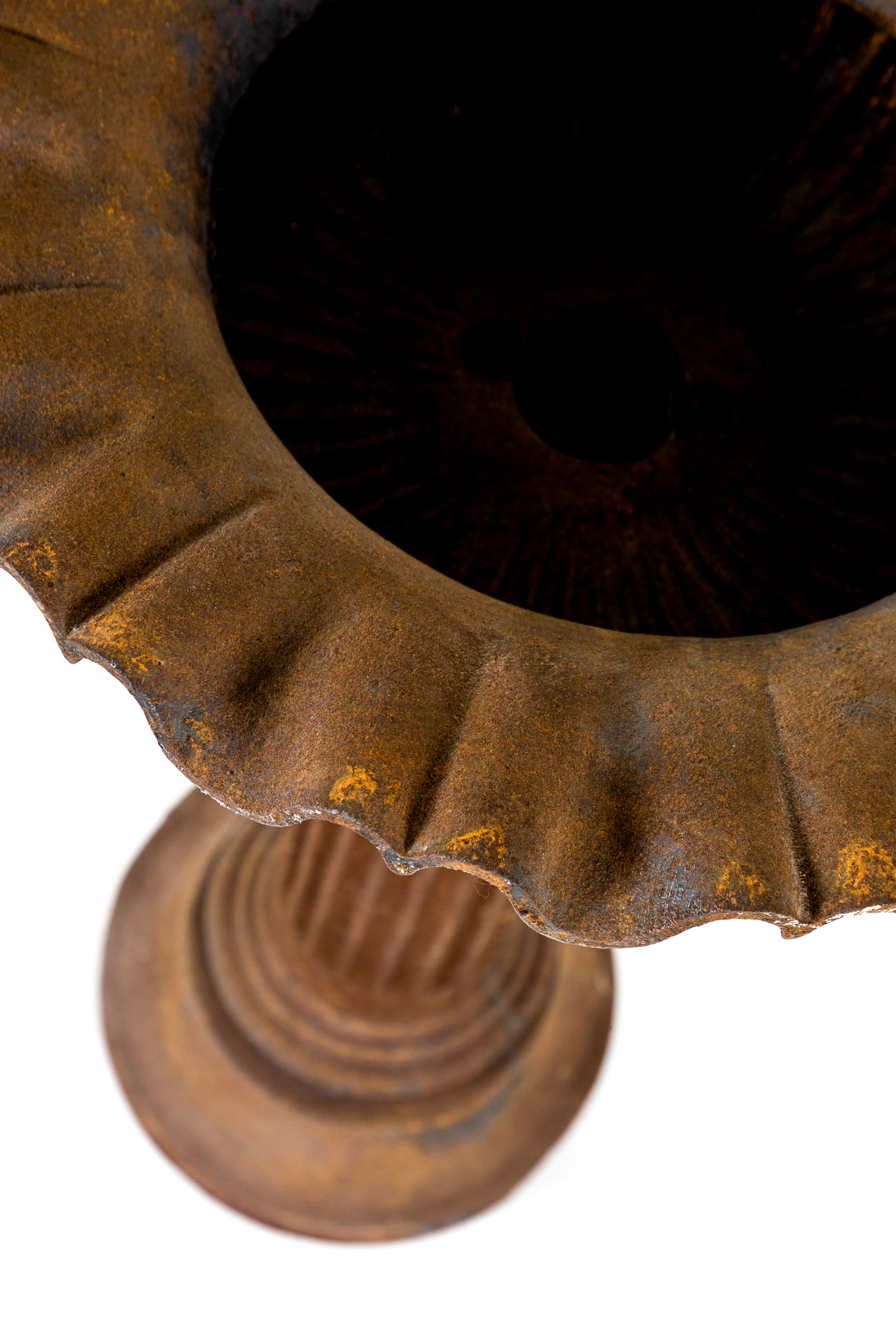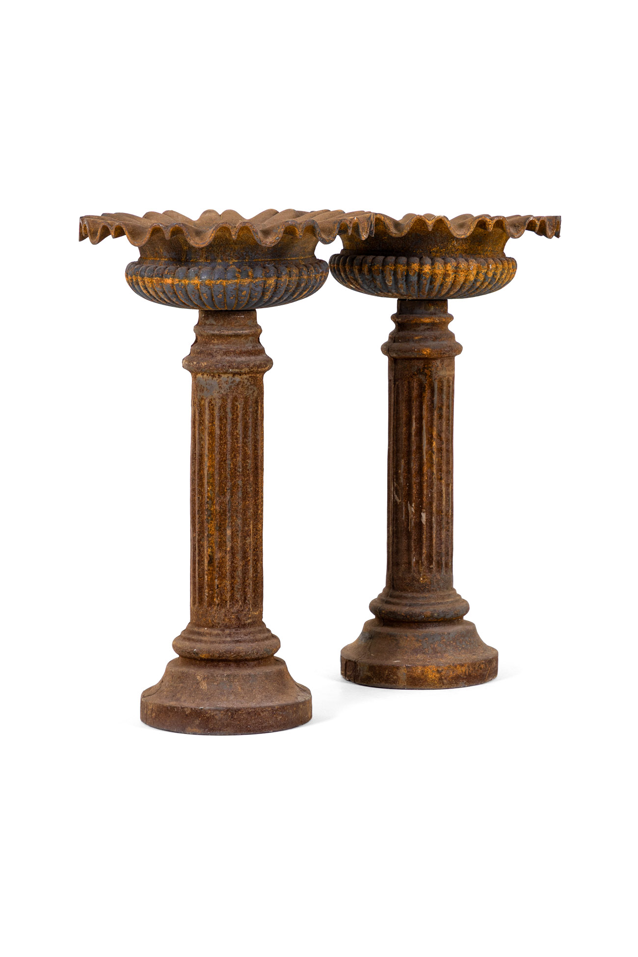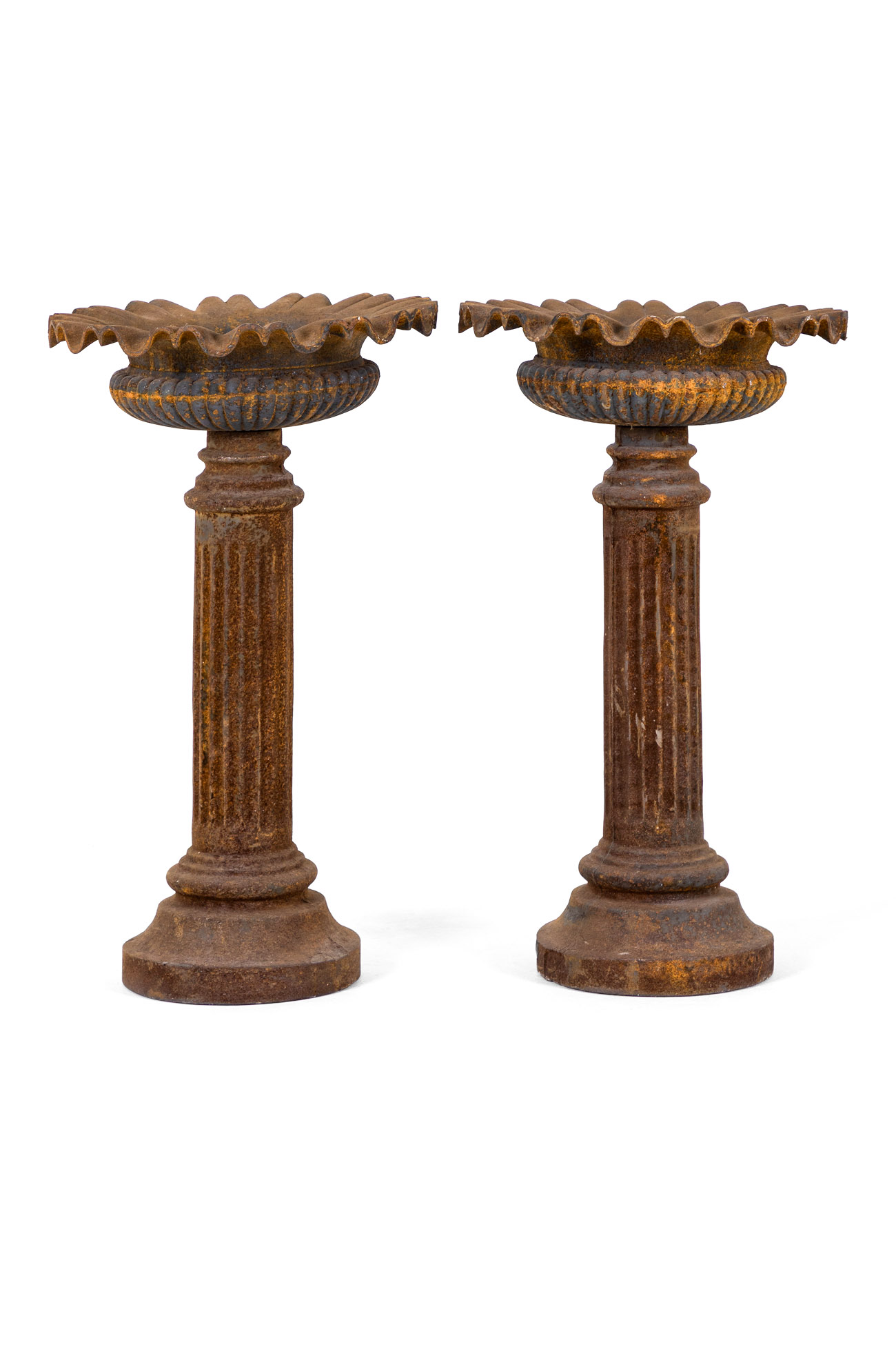 A striking pair of tall cast iron garden planters featuring two large fluted columns with circular crinkled bowl rims, akin to that of a sunflower.