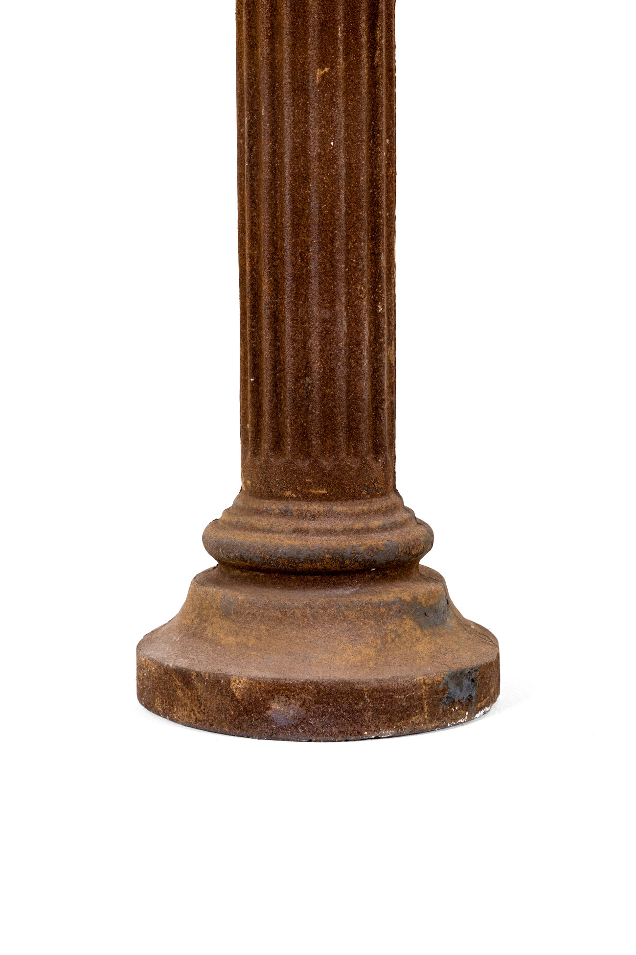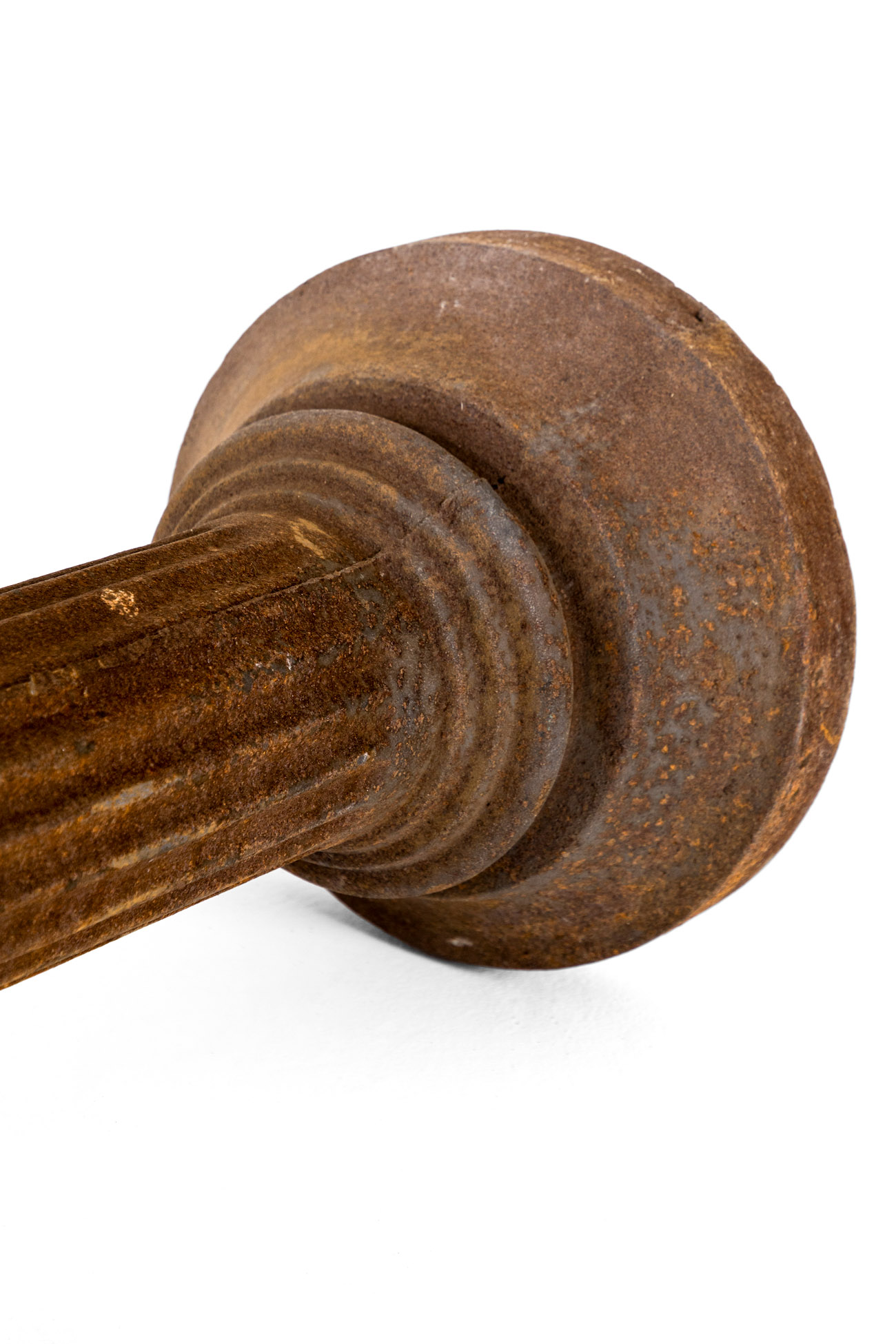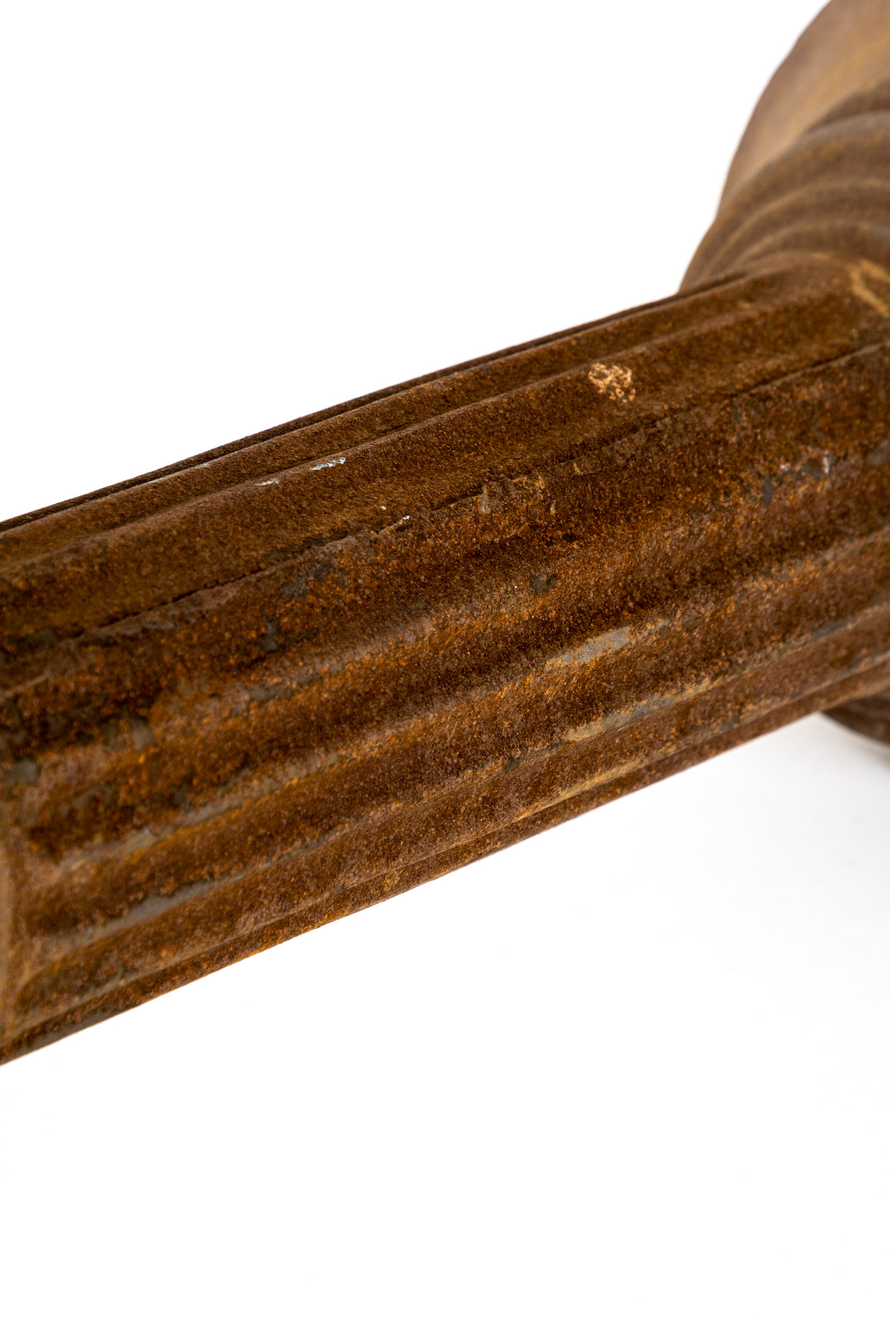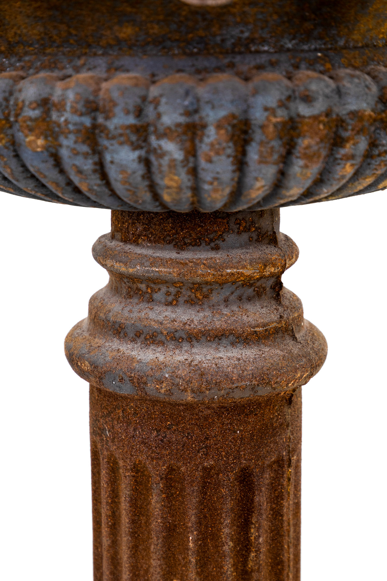 A striking pair of tall cast iron garden planters featuring two large fluted columns with circular crinkled bowl rims, akin to that of a sunflower.