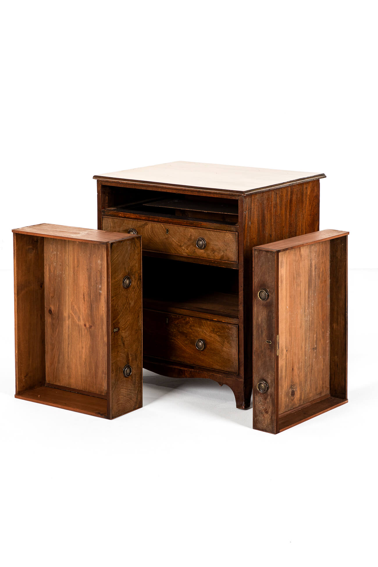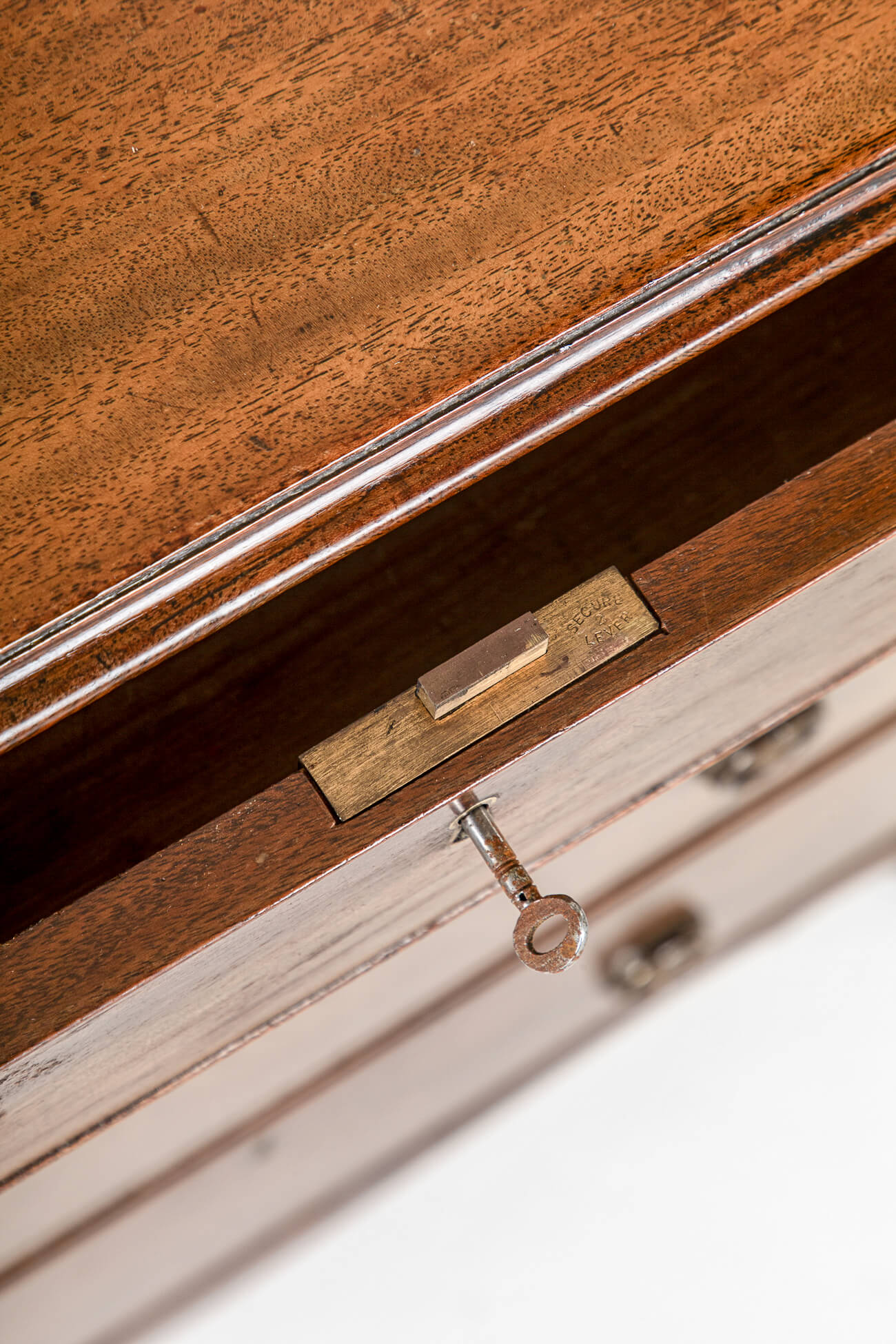 Each drawer has the original working brass locks and key complemented with brass escutcheons and two brass ring handles to each.