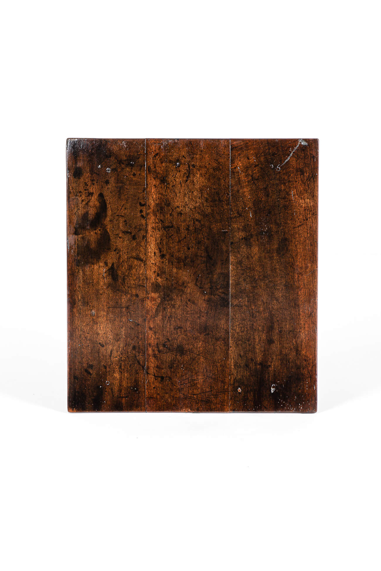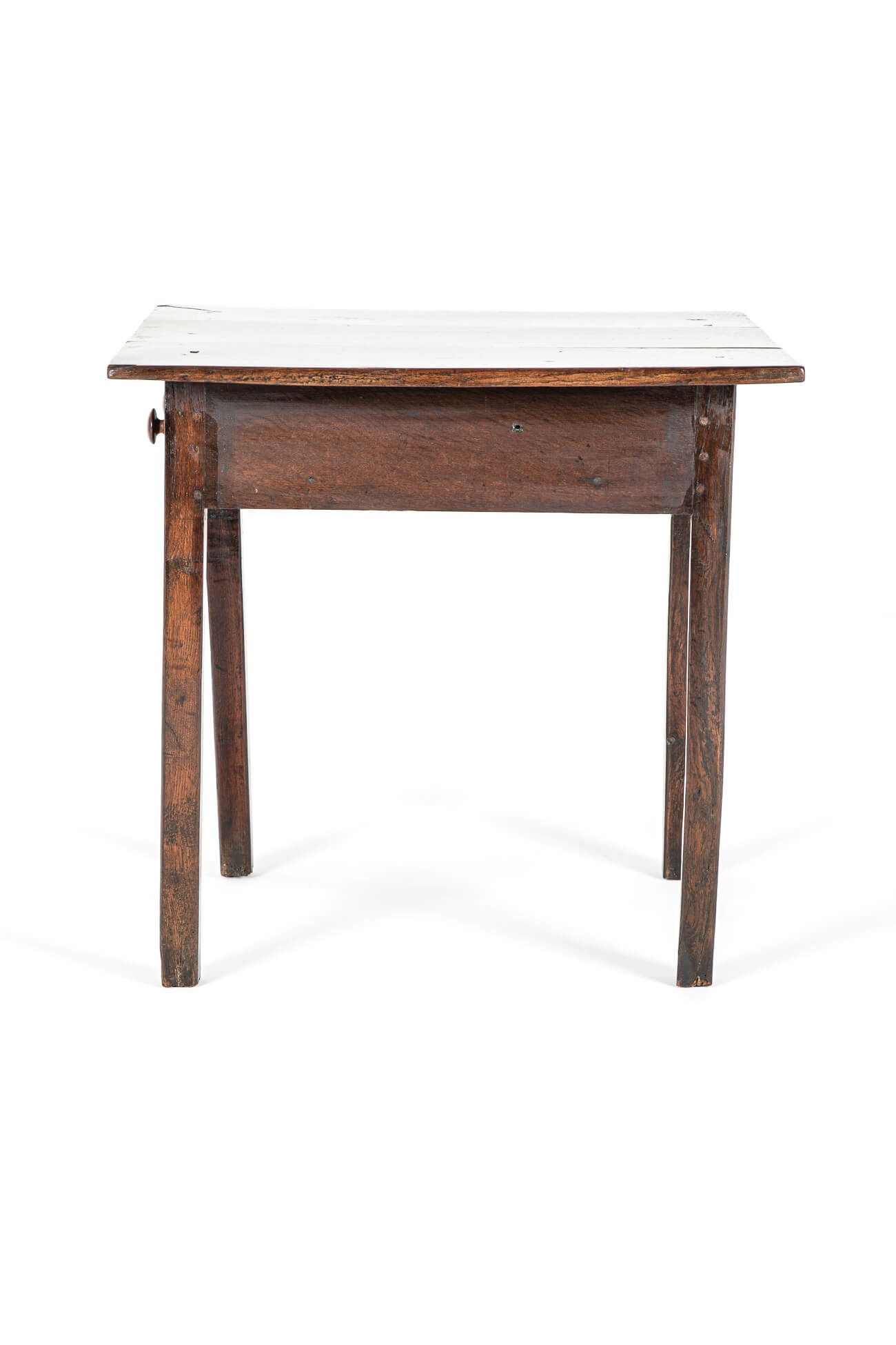 The table displays a rectangular gently over sailing ebonised top with a long sectioned freize drawer with two original knob handles.