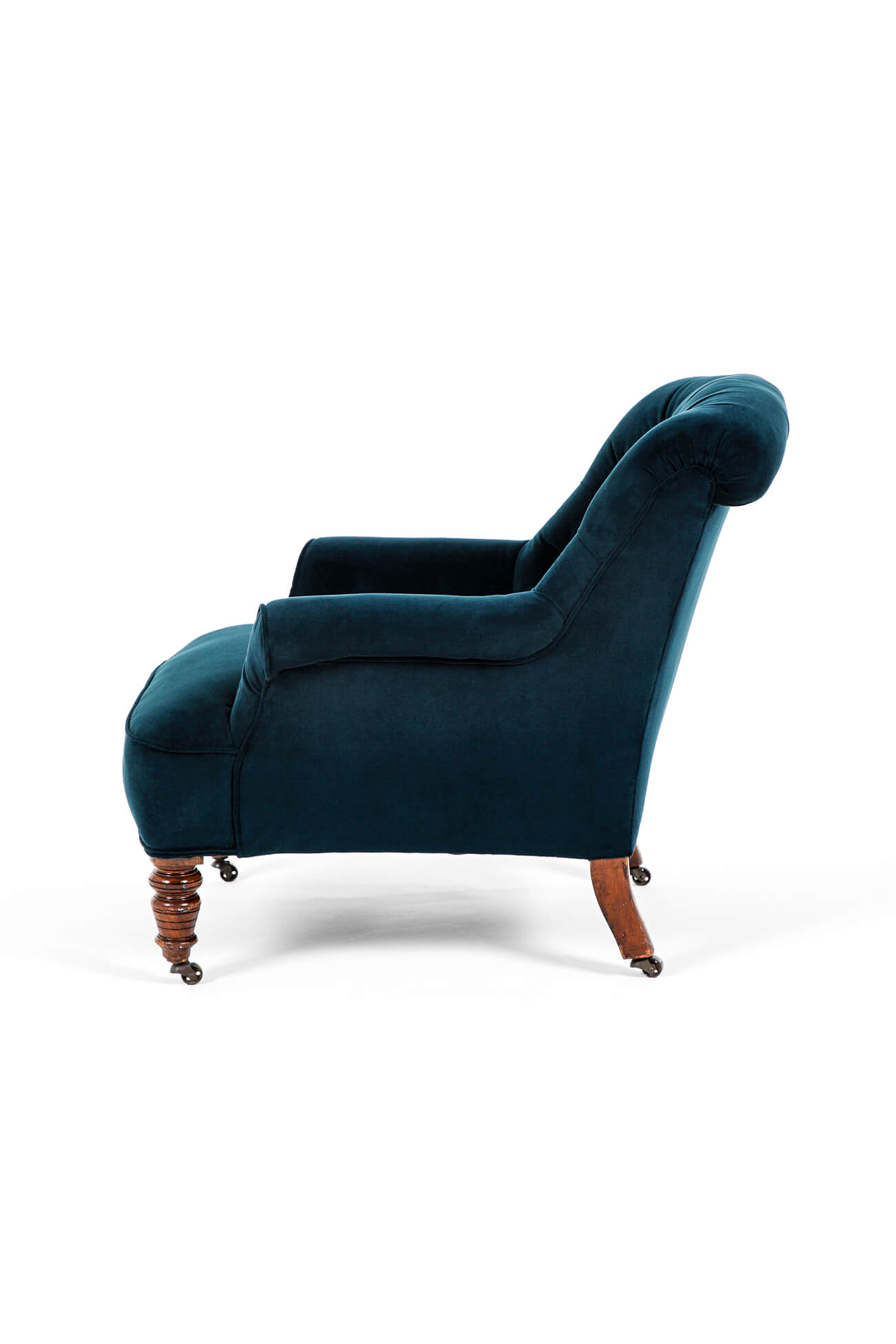 The armchair has been fully restored and stripped back to the solid mahogany frame for upholstery with a new coil spring base, with hessian lining and calico coverings added before being finished in sumptuous navy blue velvet upholstery.