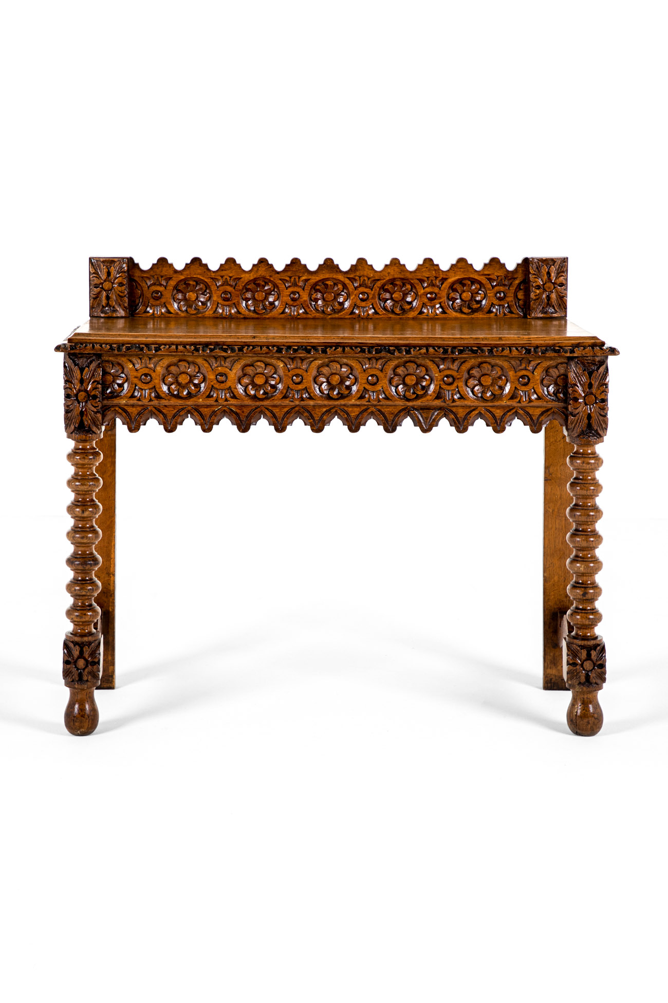 A Victorian hall bench crafted from oak and designed in the neo-gothic style, featuring a deeply carved edge and shapely upstand.