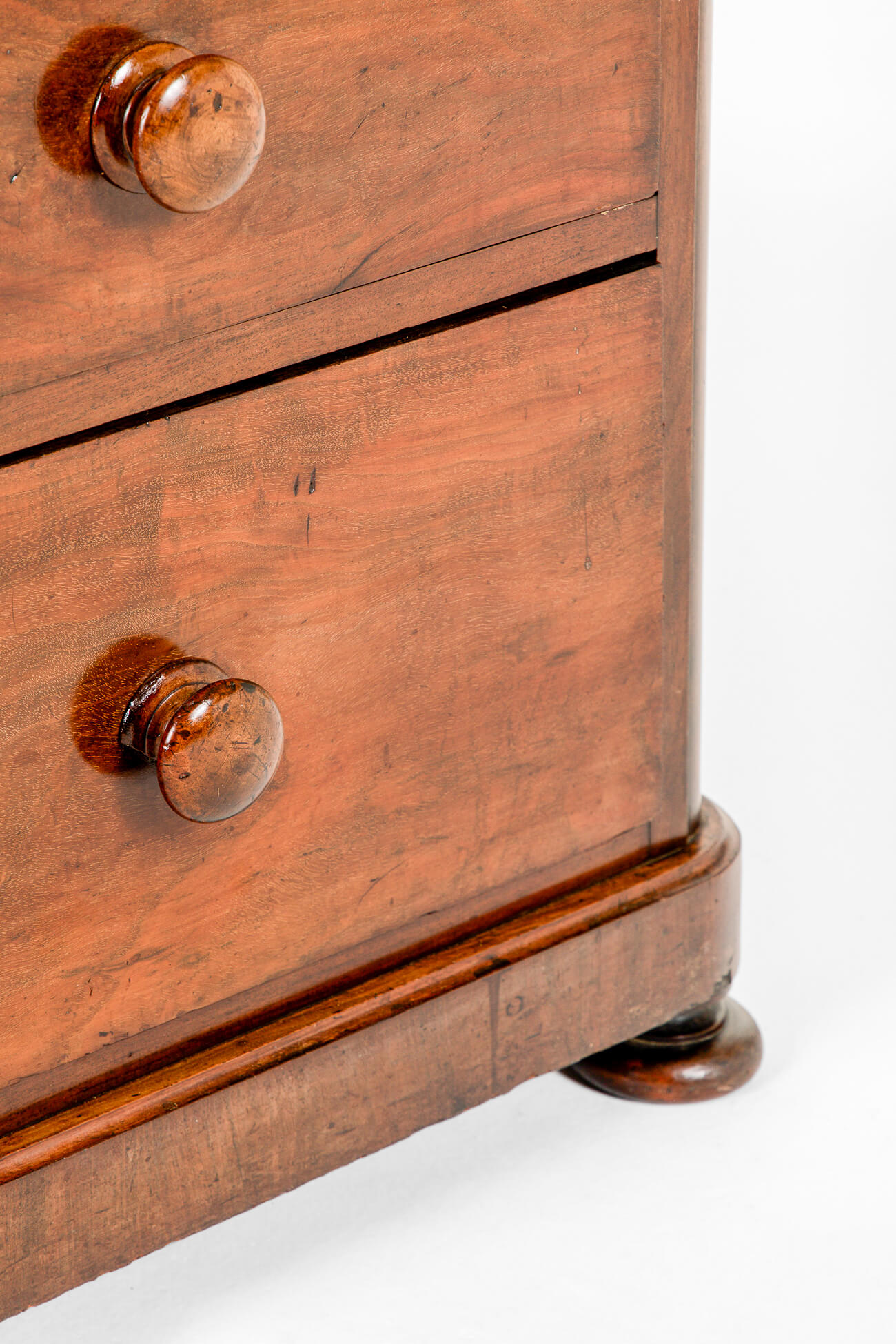 Two short over two long graduating drawers with original handles below a moulded plinth and raised on low bun feet.
