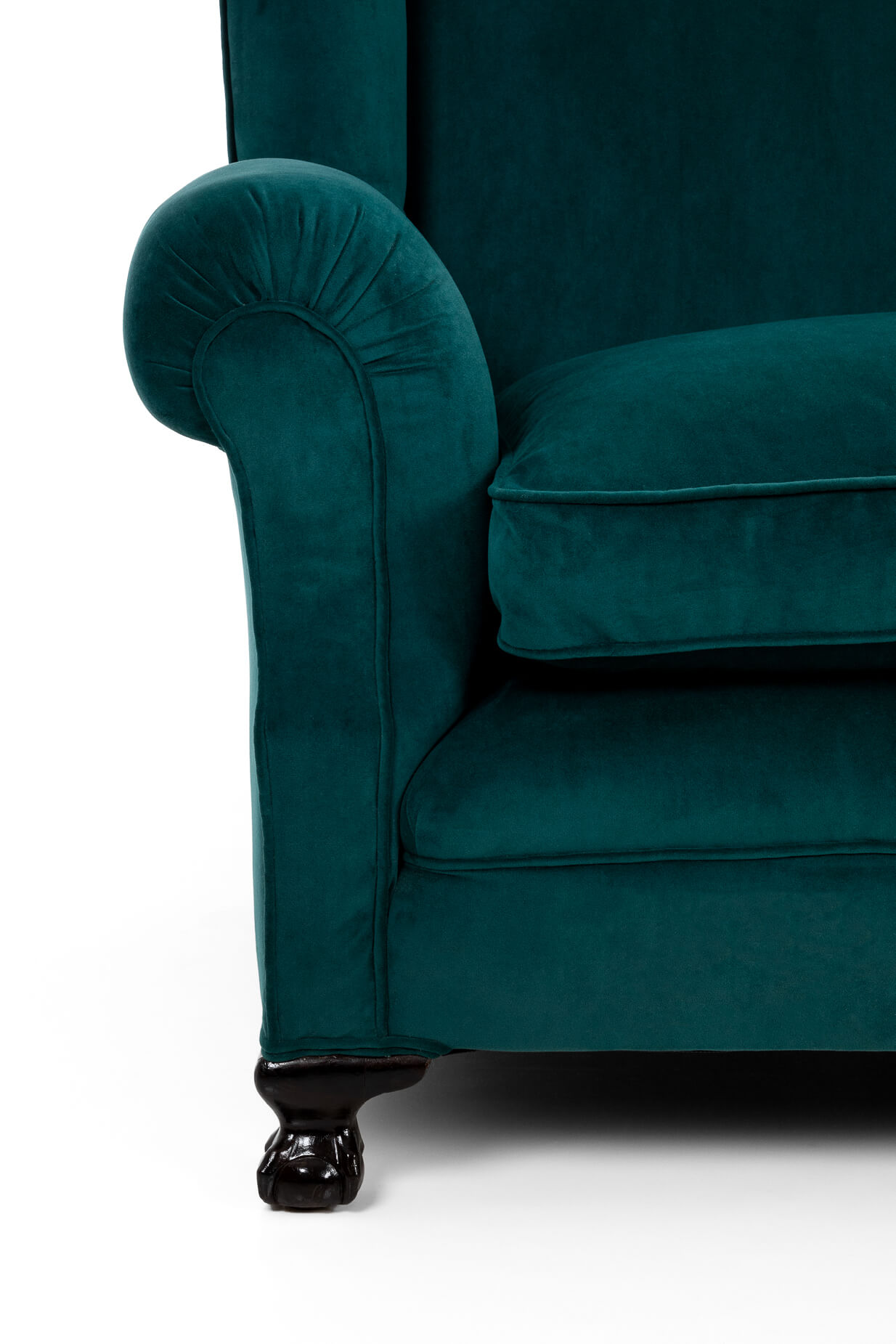 Deep seated with a commanding high back and scrolling arms on ball and claw feet.