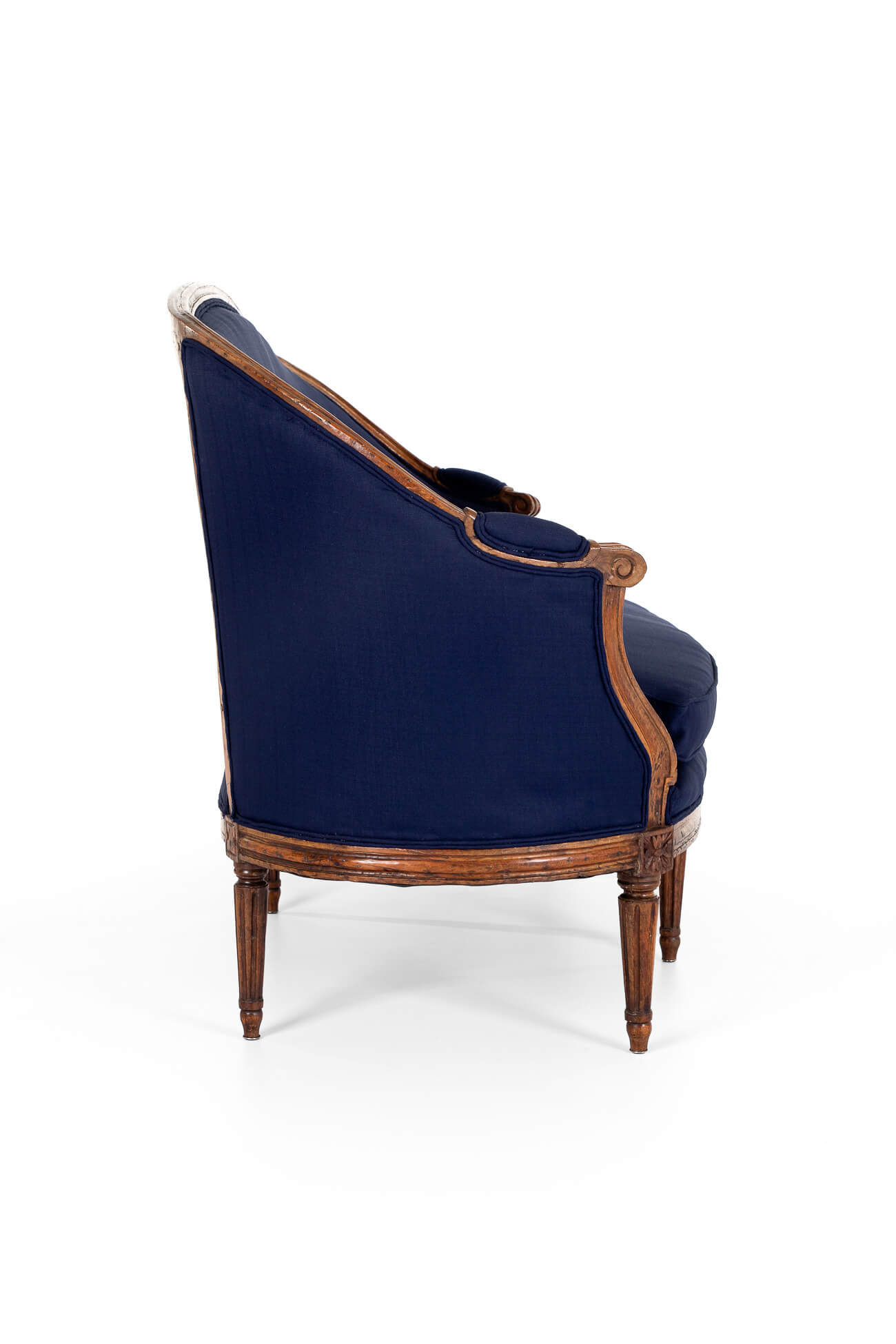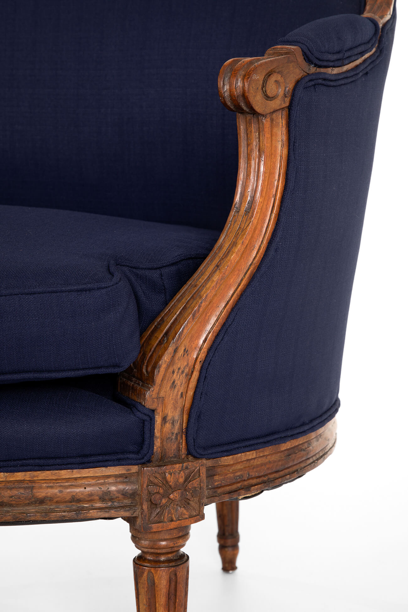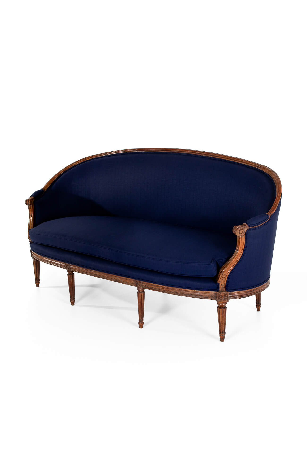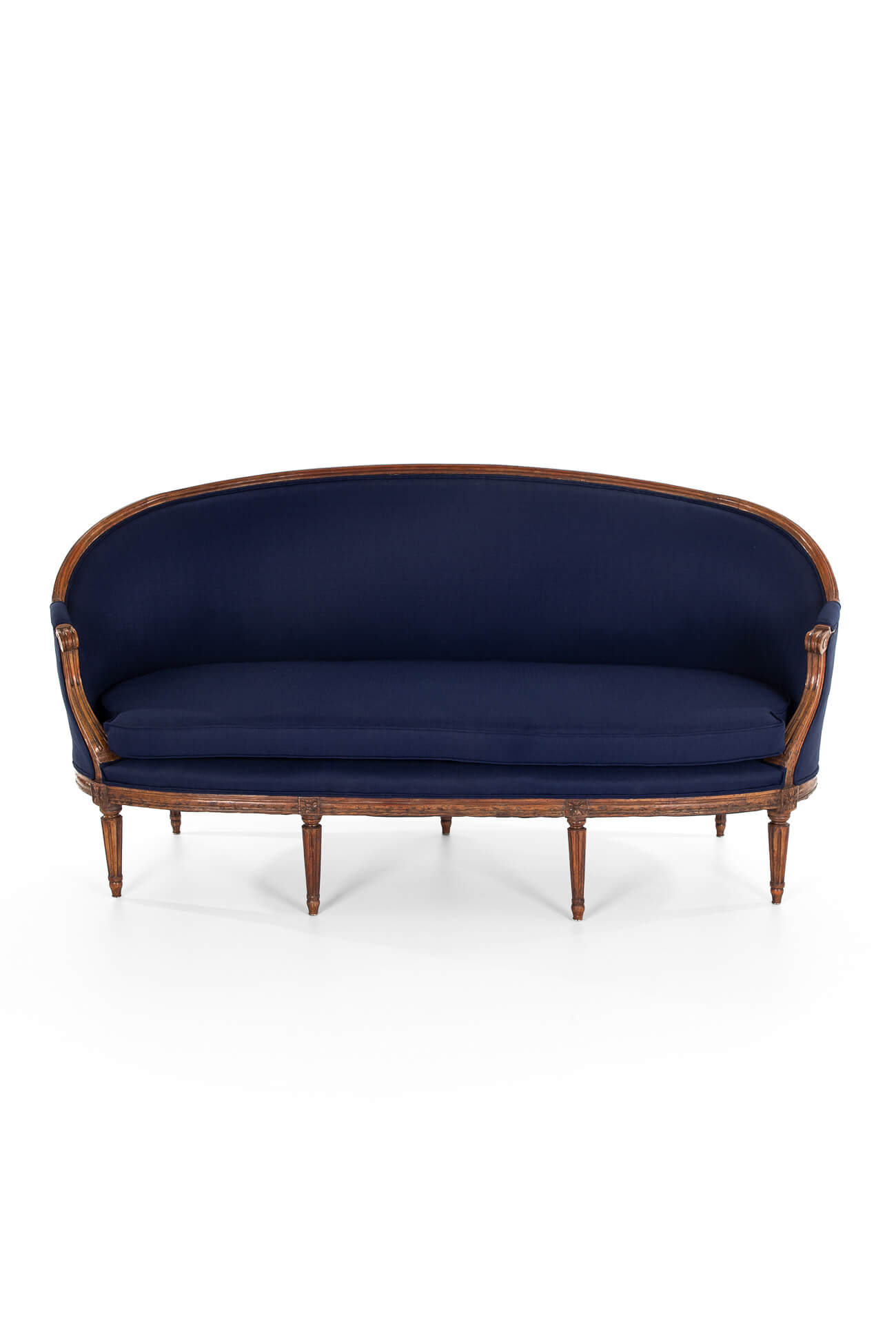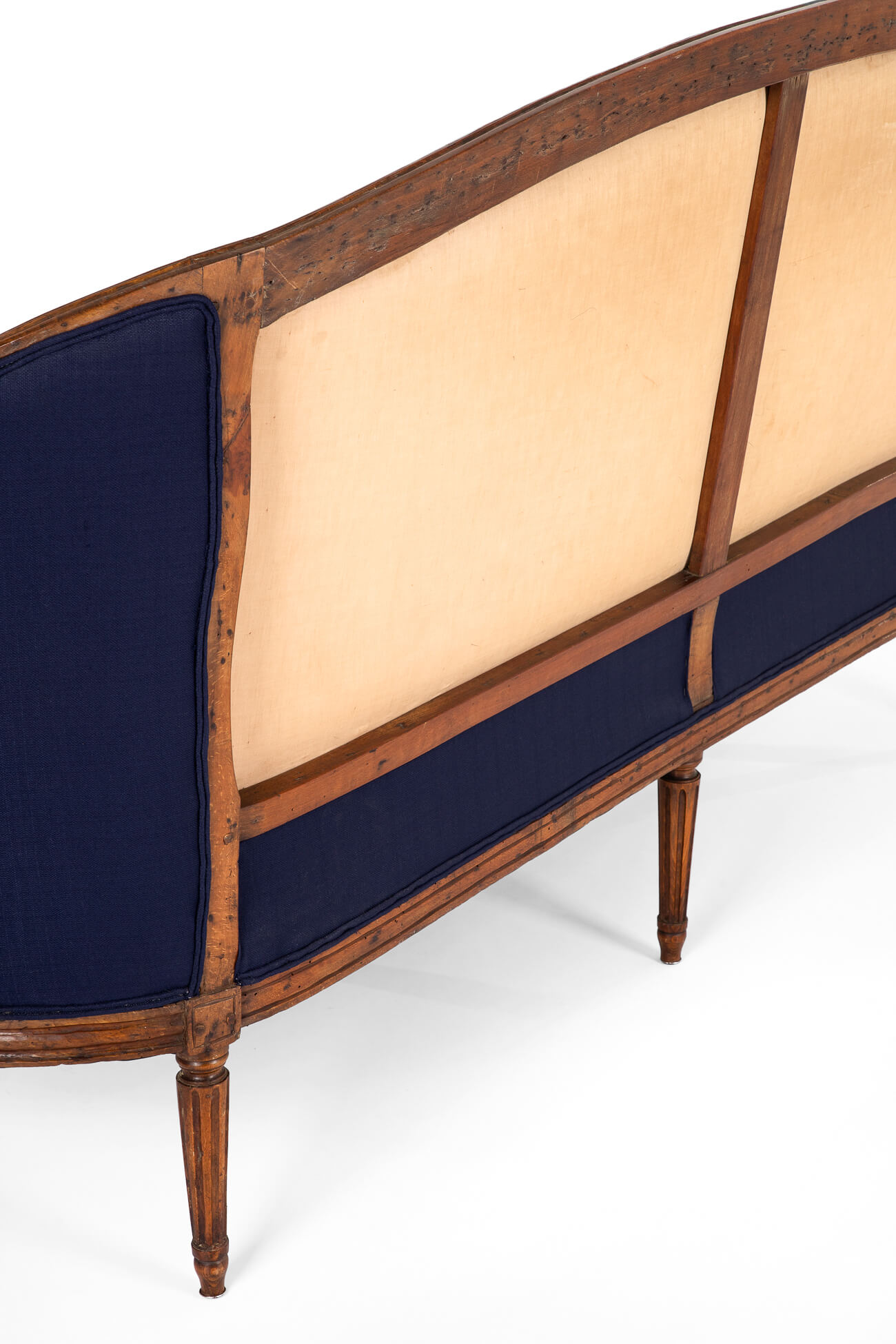 The sofa has been fully restored and stripped back to the solid walnut pegged frame and horse hair cushioning. The original cushioning on the backrest and sides has been complemented with extra padding for comfort. A new padded squab cushion has been made for the seat to the exact dimensions of the original. Finished in a deep blue navy linen.