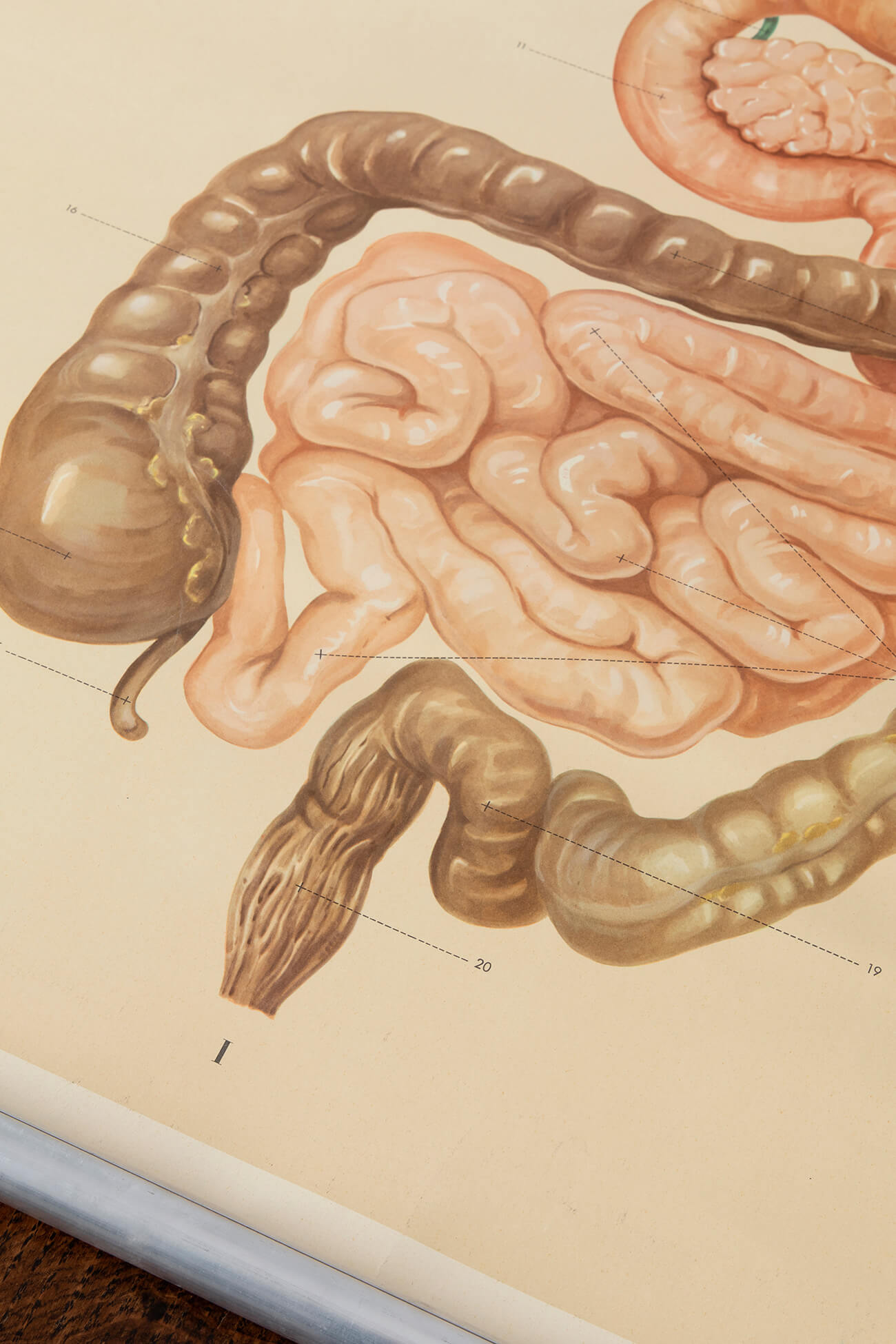 Vintage anatomical wall chart illustrating the human digestive system.