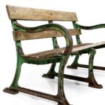 Heavy cast iron ends in their original flaky green paint and original wooden oak slats.