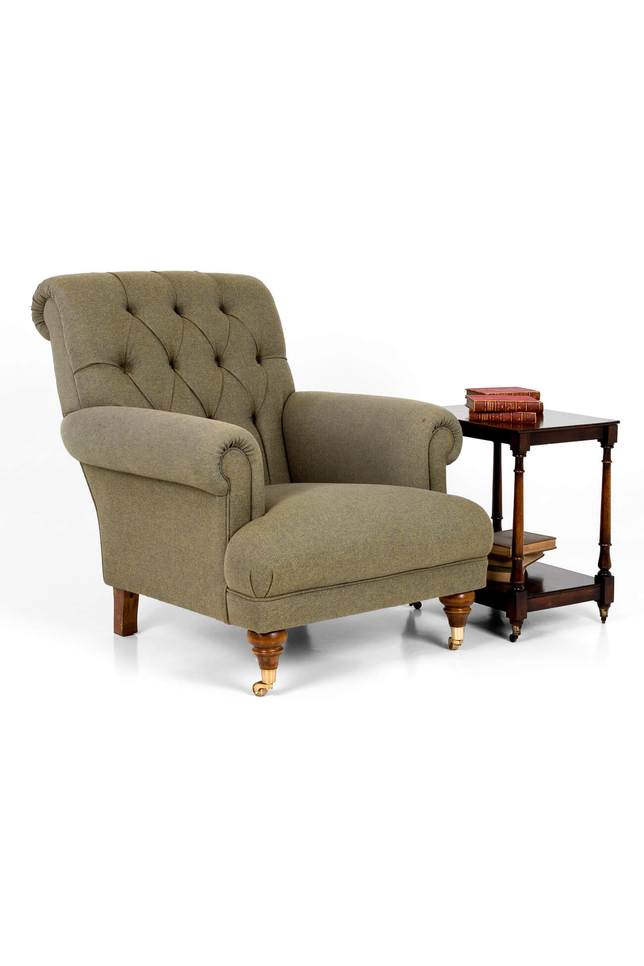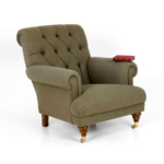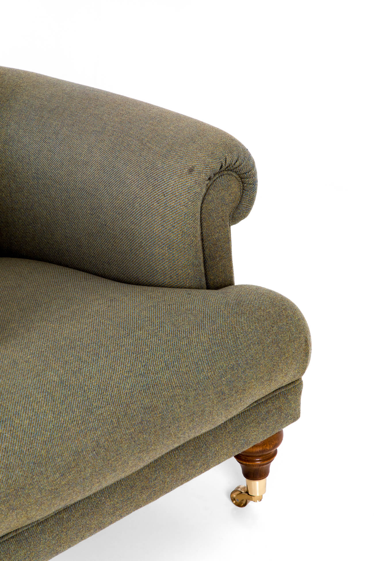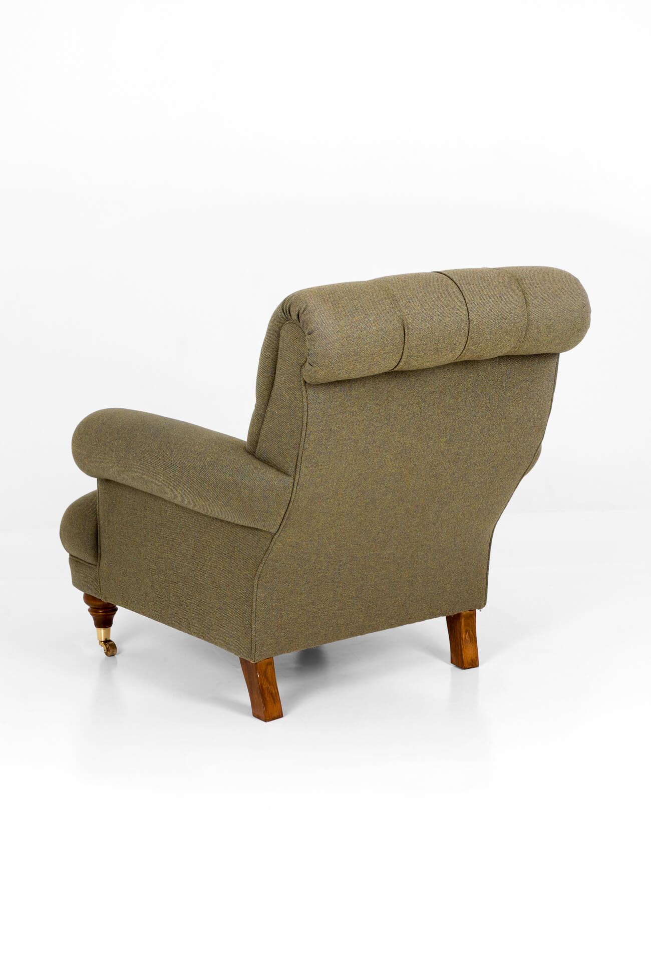 Upholstered in a high-quality flecked green Harris Tweed and featuring turned mahogany front legs with brass castors.