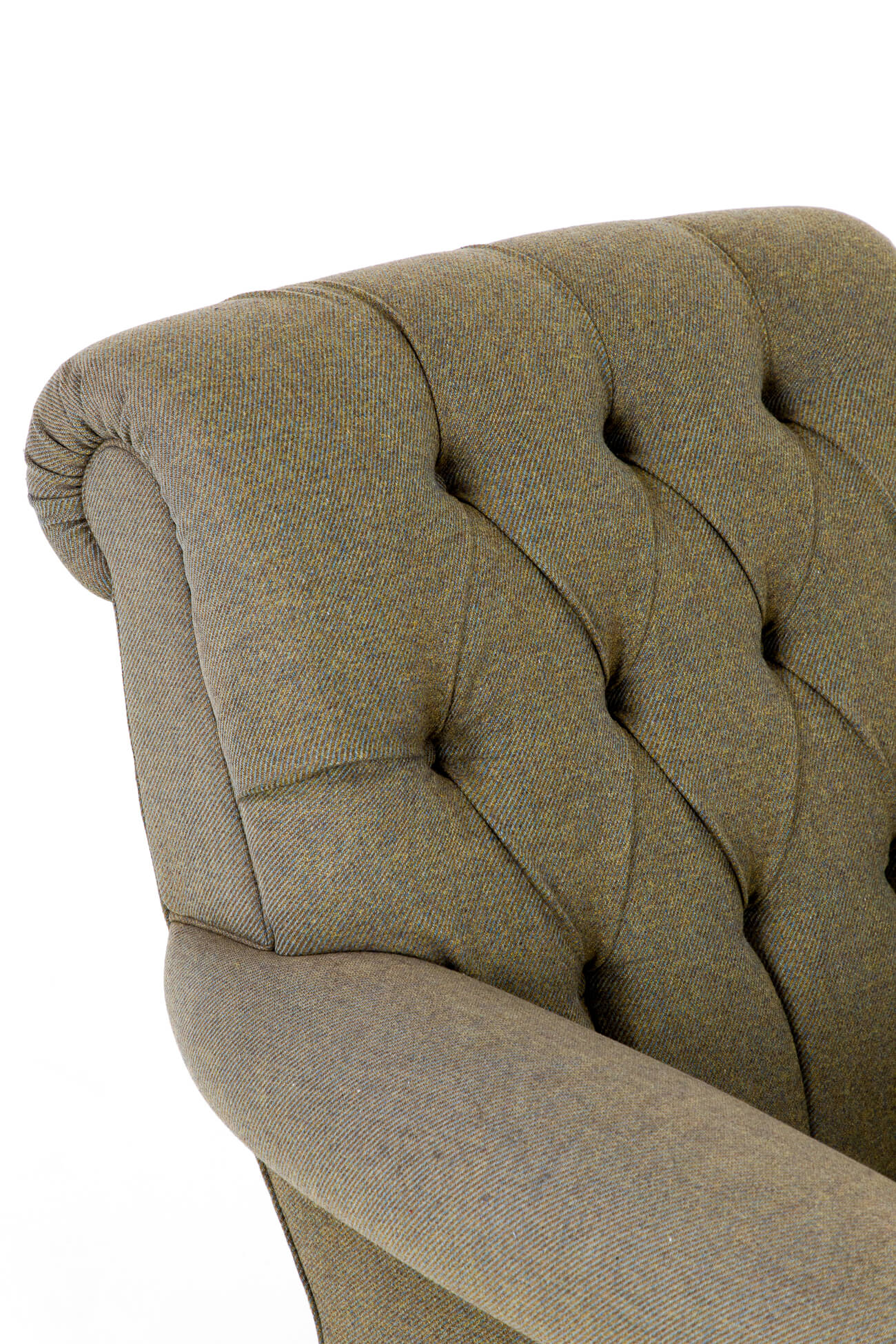 Traditional button back armchair with a deep seat, gently curved sprung back and rolled arms.
