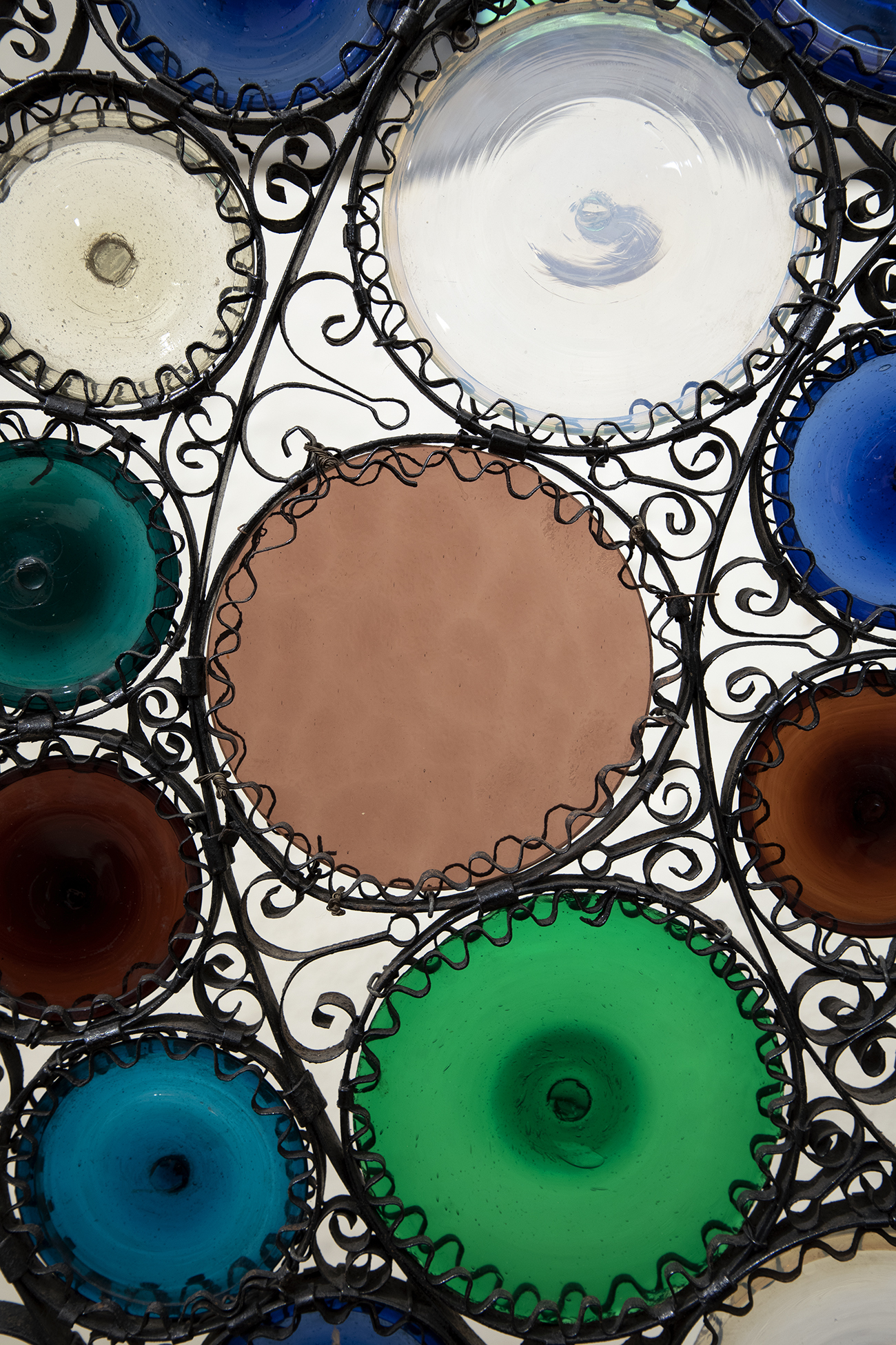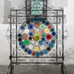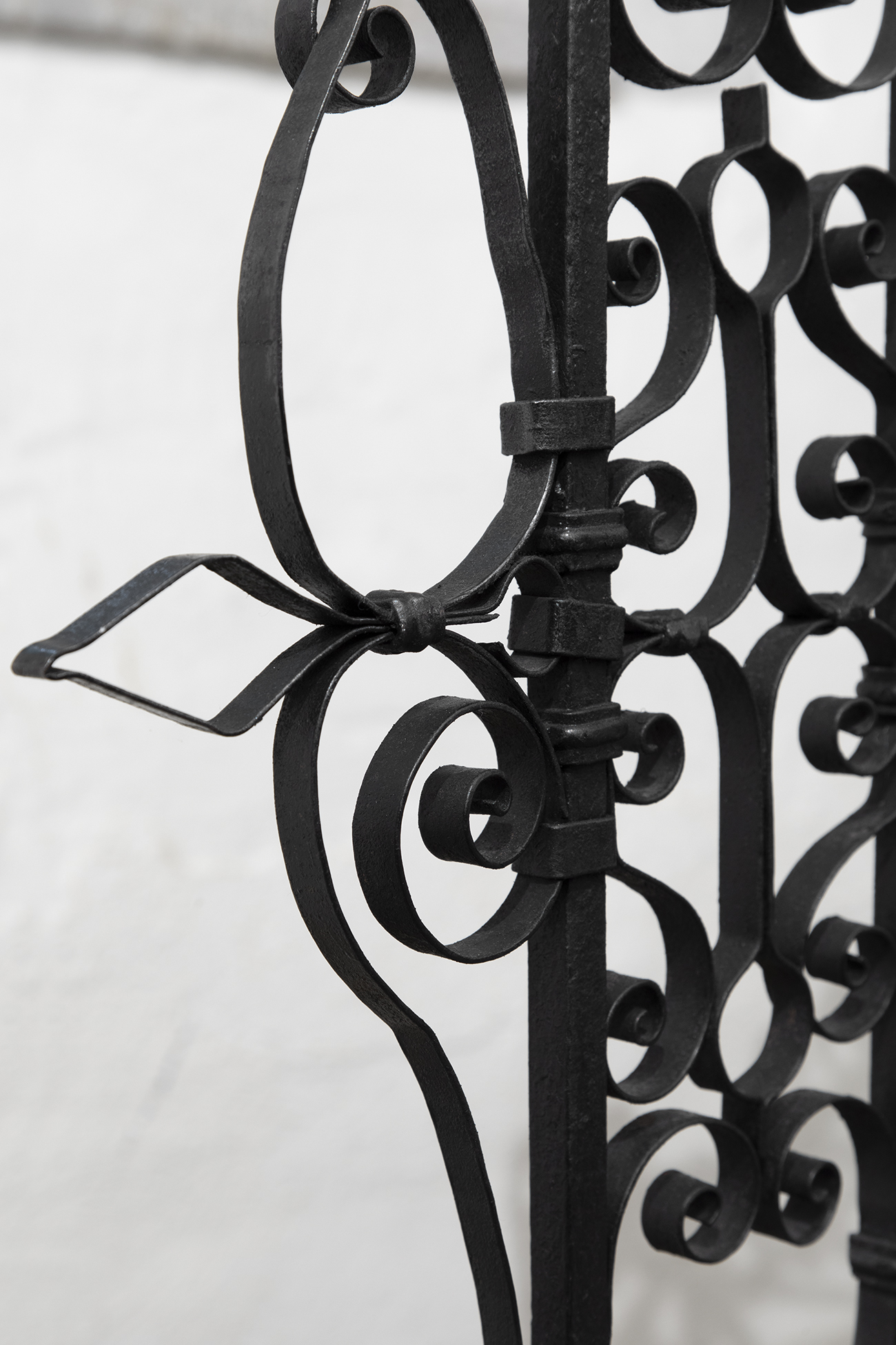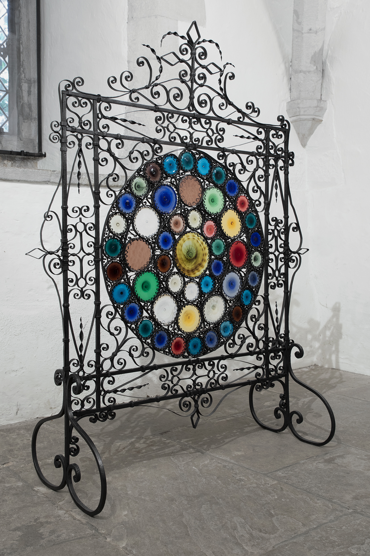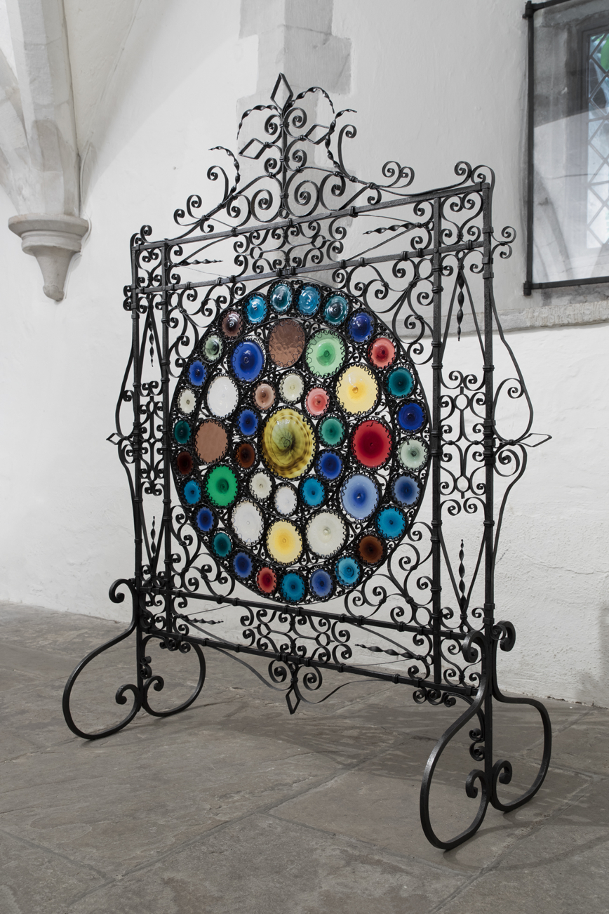 A rare and commanding fire guard from the Arts & Crafts movement with intricate wrought iron scrolling decoration and multi-coloured stained glass.